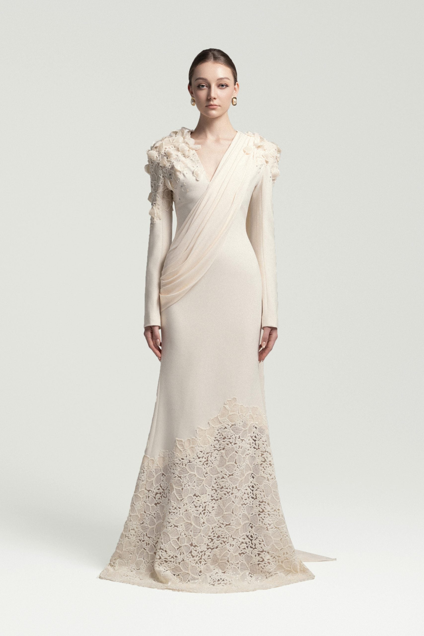A figure-hugging mermaid blazer dress exuding sophistication and allure. Featuring a softly draped neckline with an extended back hem, this design flows with effortless grace. The strong-shouldered blazer silhouette is adorned with delicate 3D lace flowers and shimmering crystal accents, enhancing its opulent appeal. Crafted from luxurious velvet with glistening sequin details, the intricate handcrafted lace embroidery elevates the artistry of the design, balancing sensuality and grandeur.