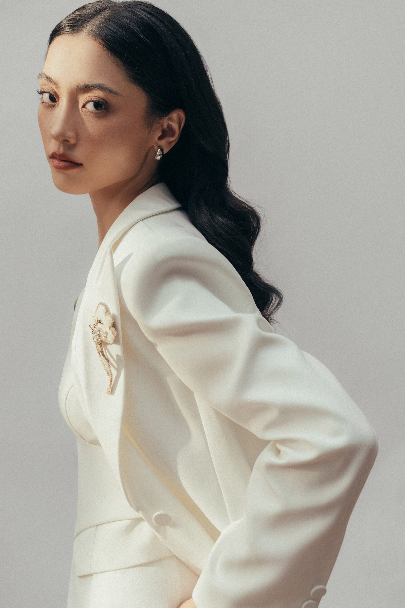 This relaxed-fit blazer with medium shoulder design embodies minimalist yet refined elegance. The standout feature is the overlap lapel, which adds a modern twist to the basic structure, making it contemporary and fresh, while staying true to L’ALLÉE’s signature style. The twill fabric is smooth, soft, and wrinkle-free, with a slight drape that ensures comfort and sophistication. An additional charm embellishment completes the chic look. This versatile piece can be effortlessly paired with dresses, skirts, or wide-leg pants, making it suitable for both office wear and formal occasions.