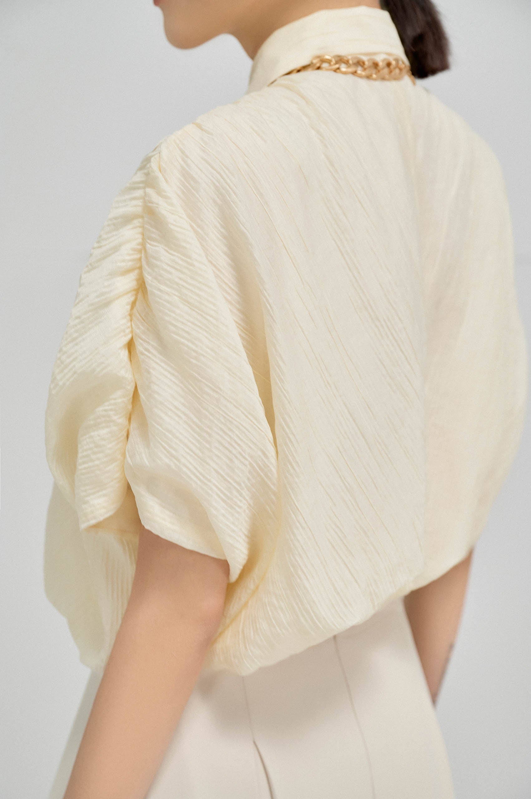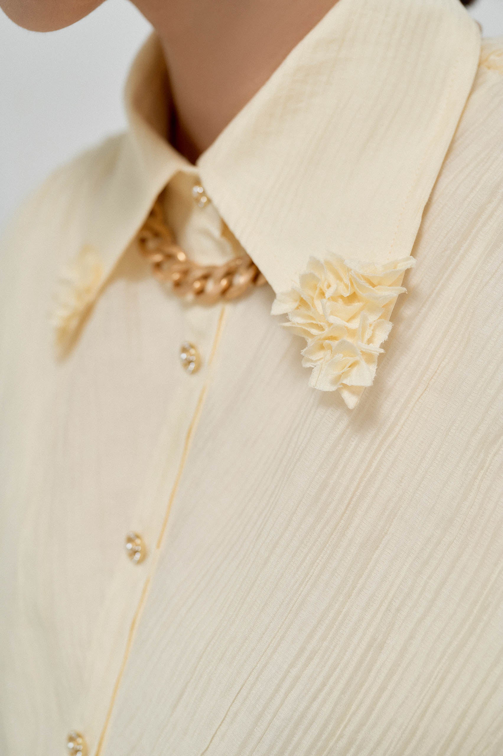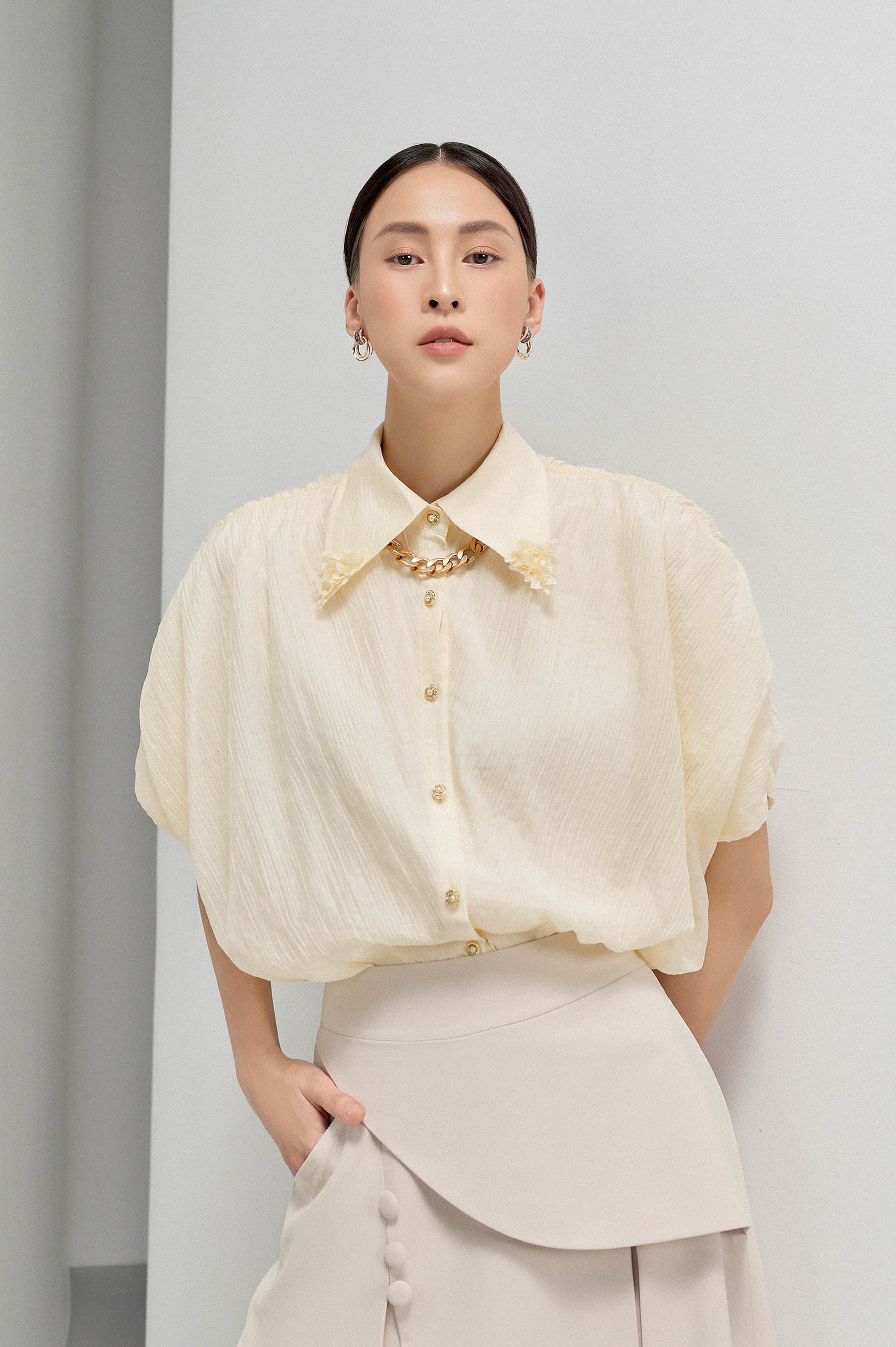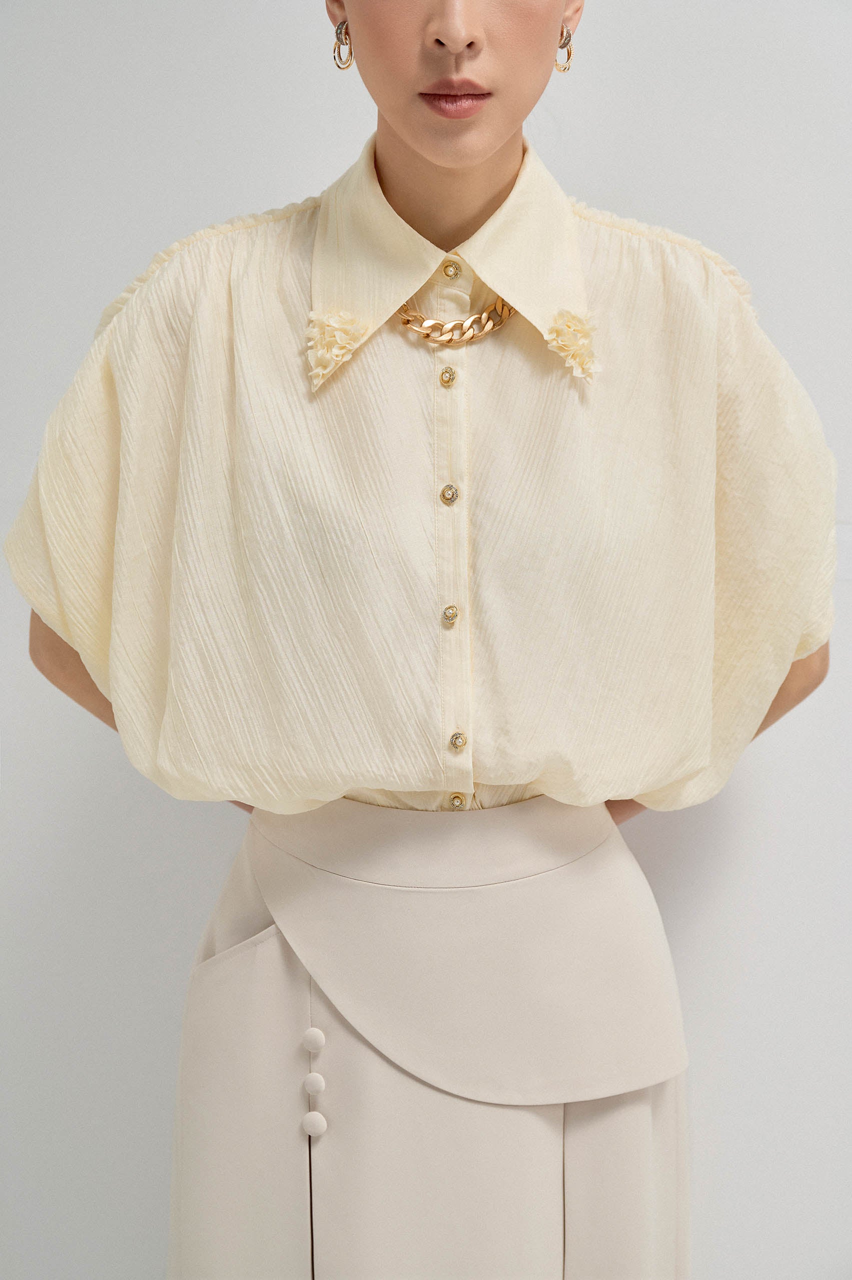 The highlight of the fancy hand-crafted swallow neck makes the Beaded Handmade Flower Shirt attractive at first sight. The shape of the shirt is seamless, wide, and the waist is simple, making it easy for the wearer to mix & match with every item. Floss material with a slightly wrinkled surface, creating a dreamy, floating effect.