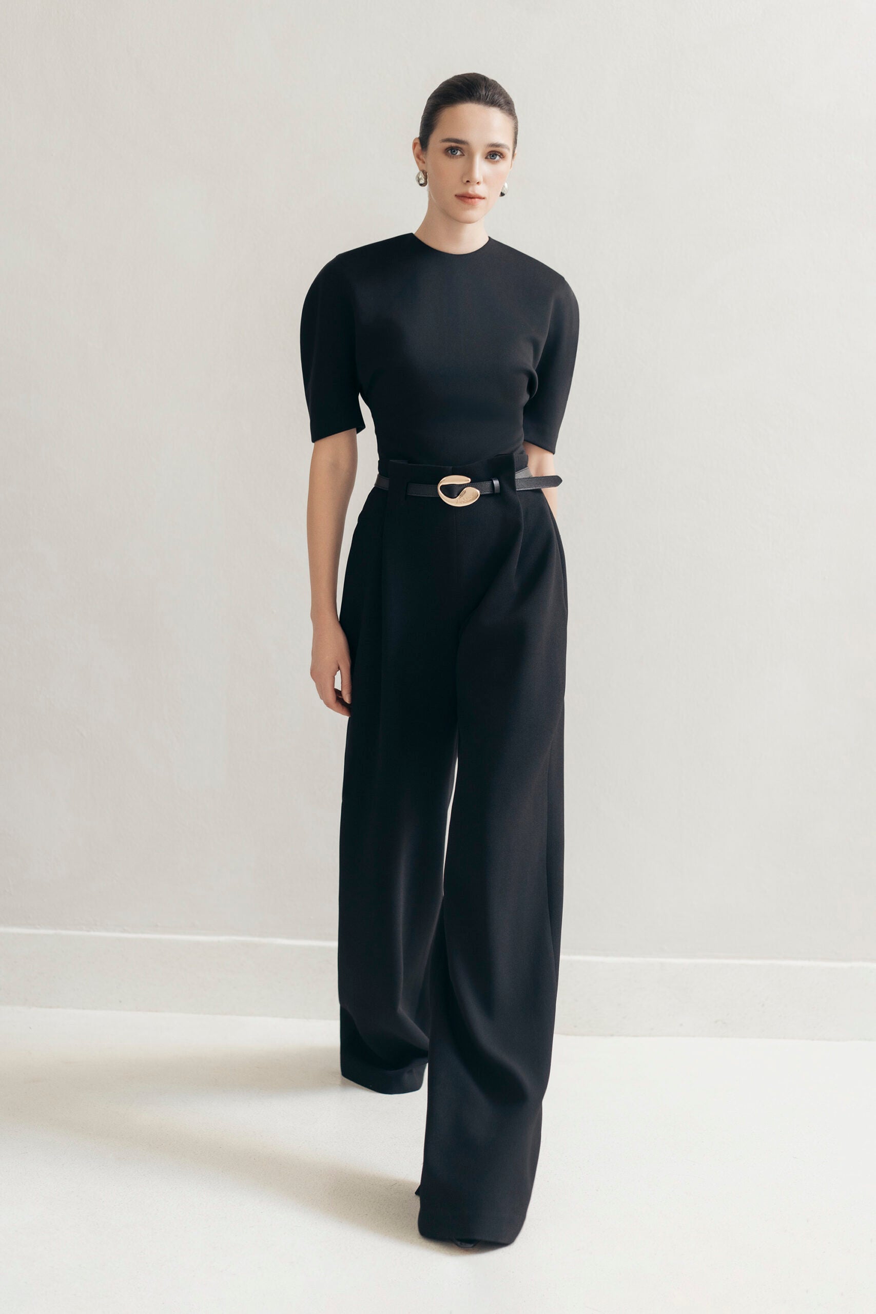 These wide-leg trousers present a modern and comfortable look, featuring a unique side pleat design paired with an exclusive leather belt, creatively tied for an impressive appearance. The soft and...