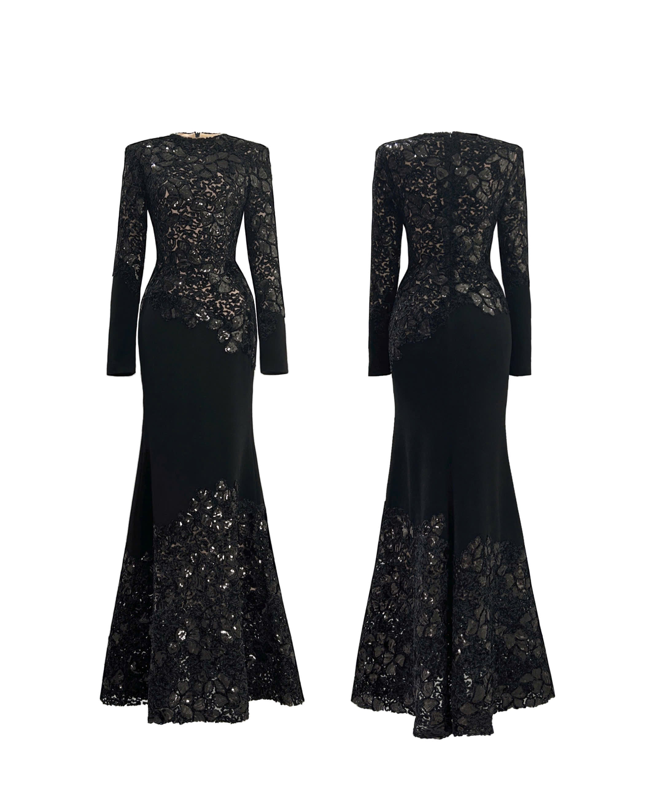 Material: Velvet embroidered with sequins. Color: Black. Dress Length: 163-168 cm. Sleeve Length: 63 cm. Neck: 46 cm.