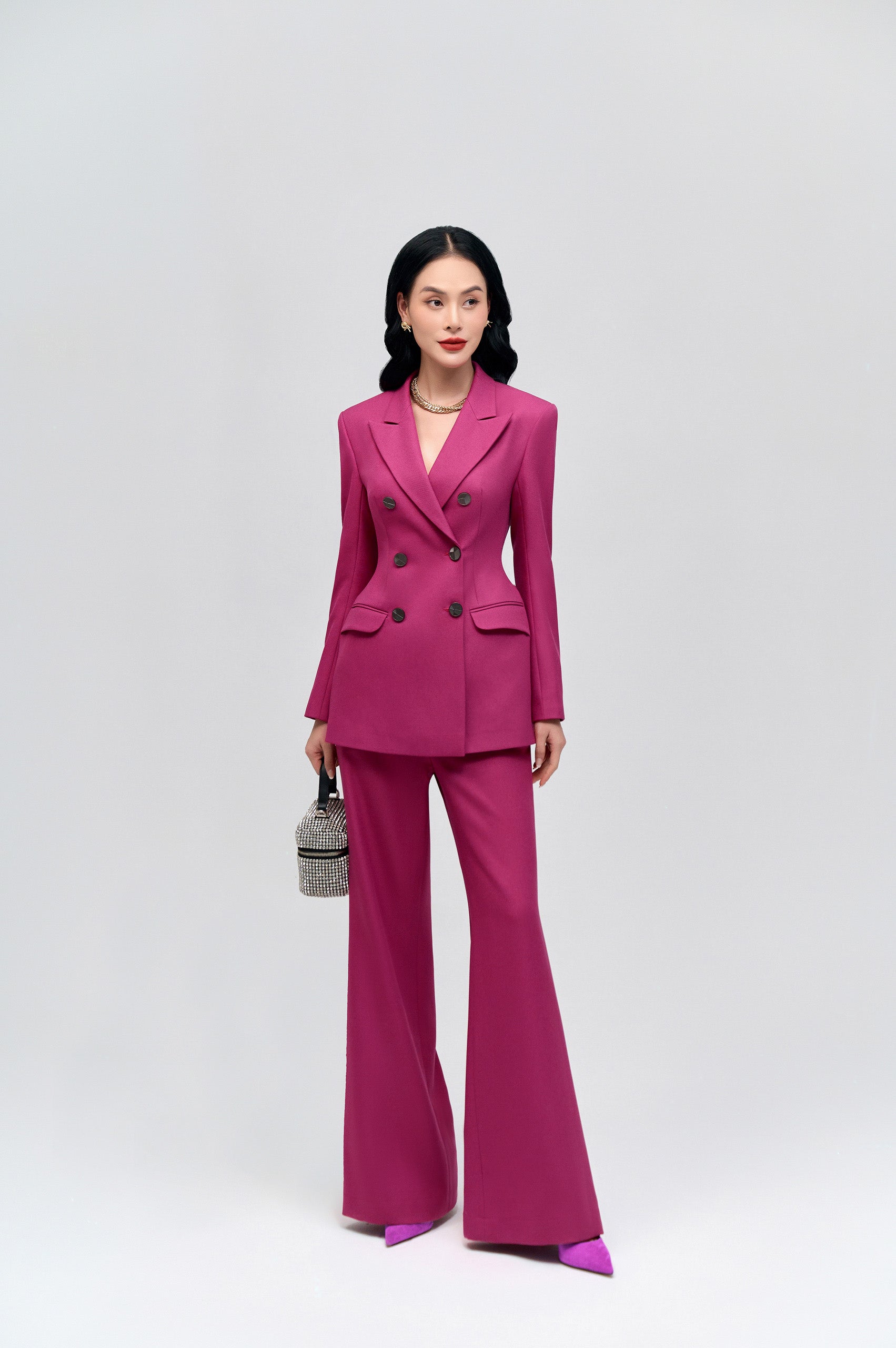It is impossible to ignore the beautiful hues of the holiday season, such as red, pink, orange,... L'ALLÉE sent her a blend of feminine and feminine, classic pink color and sophisticated attractiveness. Despite being a woman, she also emits a forceful disposition. She only needs to select simple, monochromatic accessories to instantly exude luxury and sophistication at any romantic gathering thanks to the outfit's stunning hue.