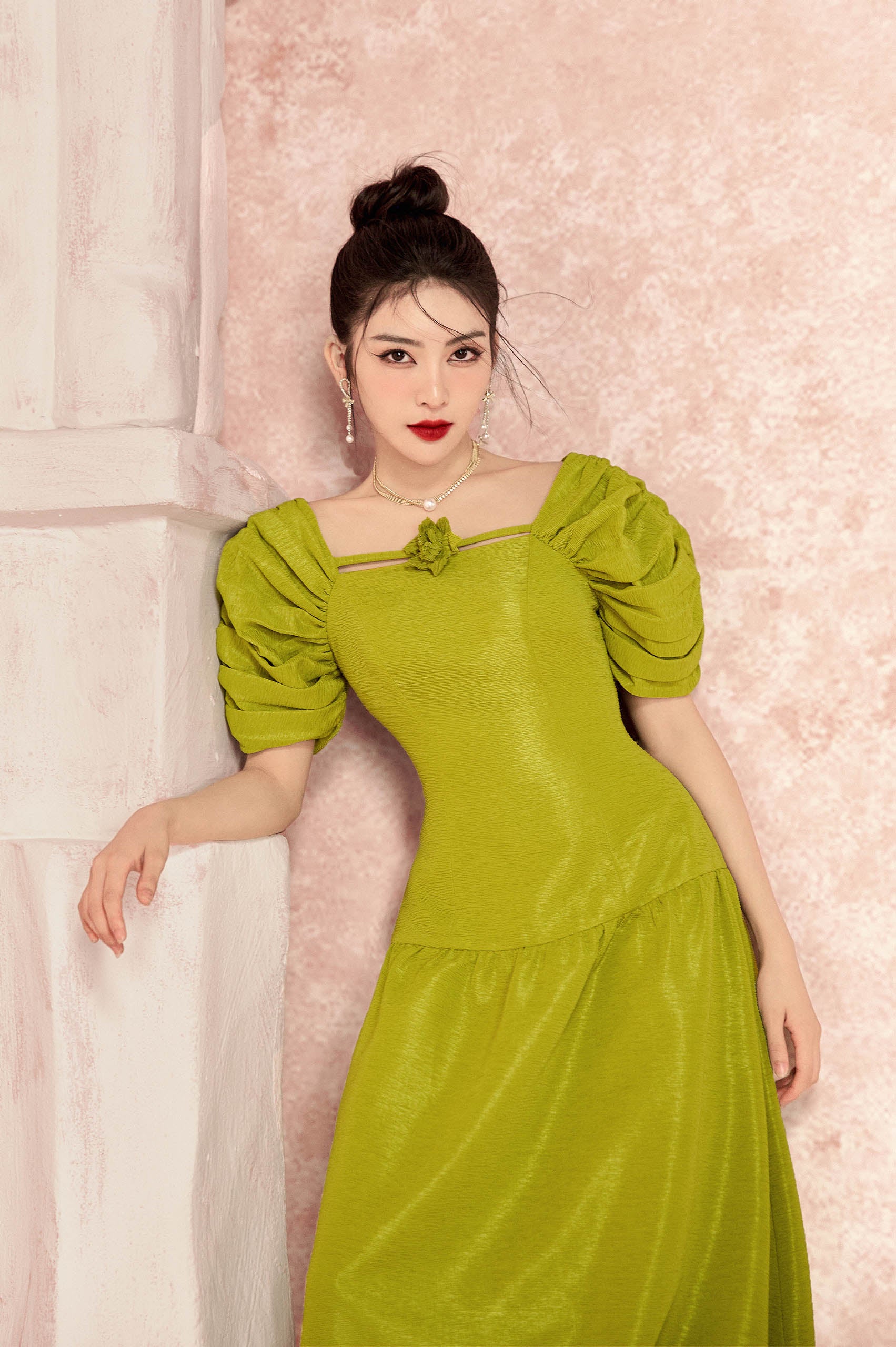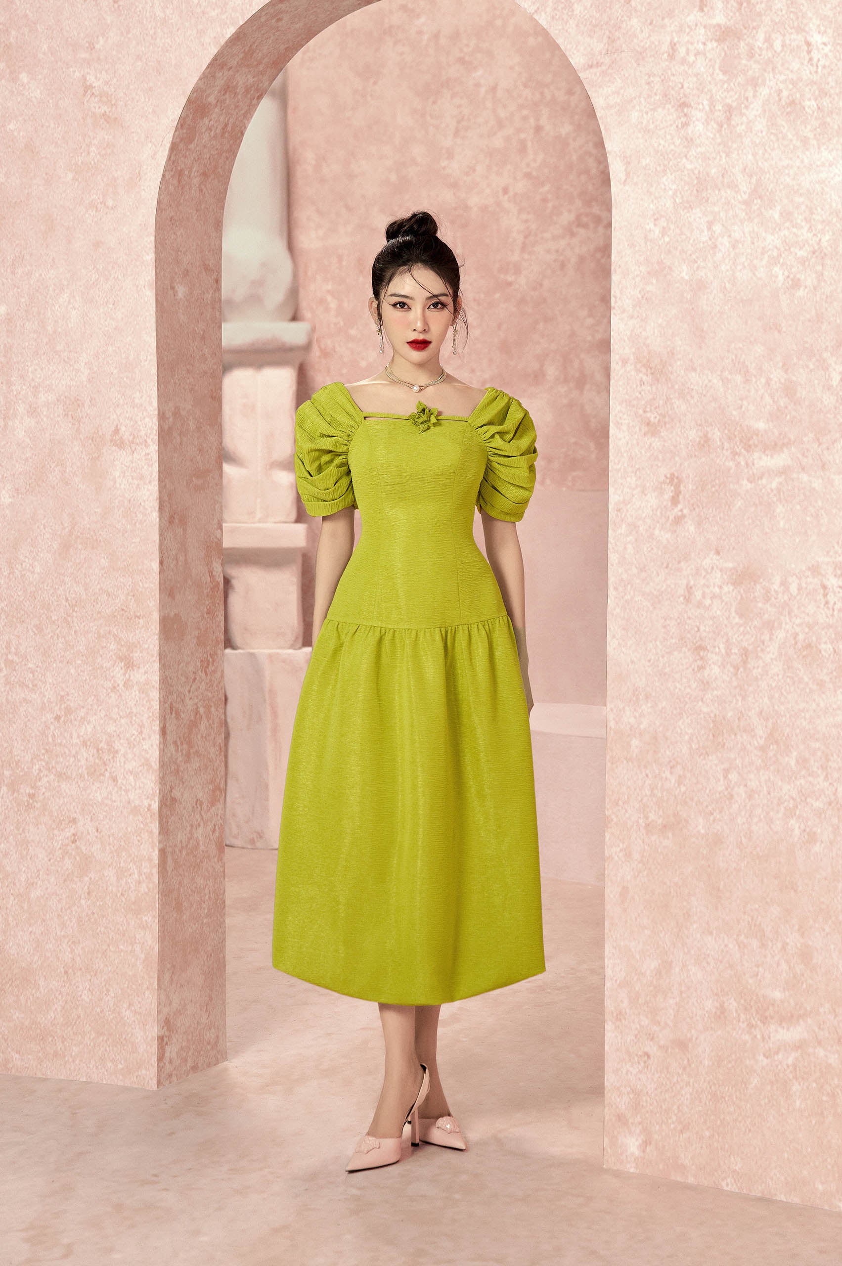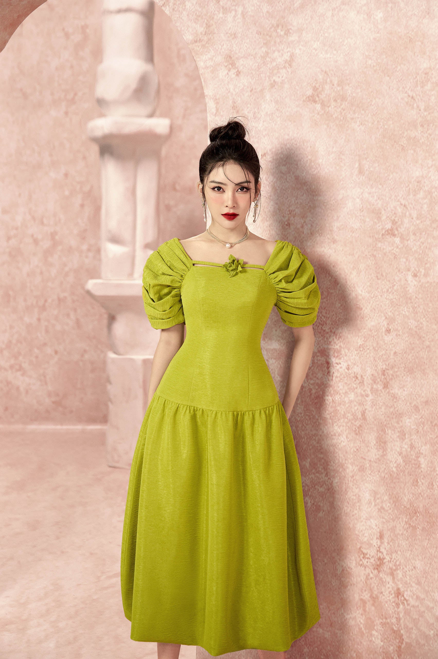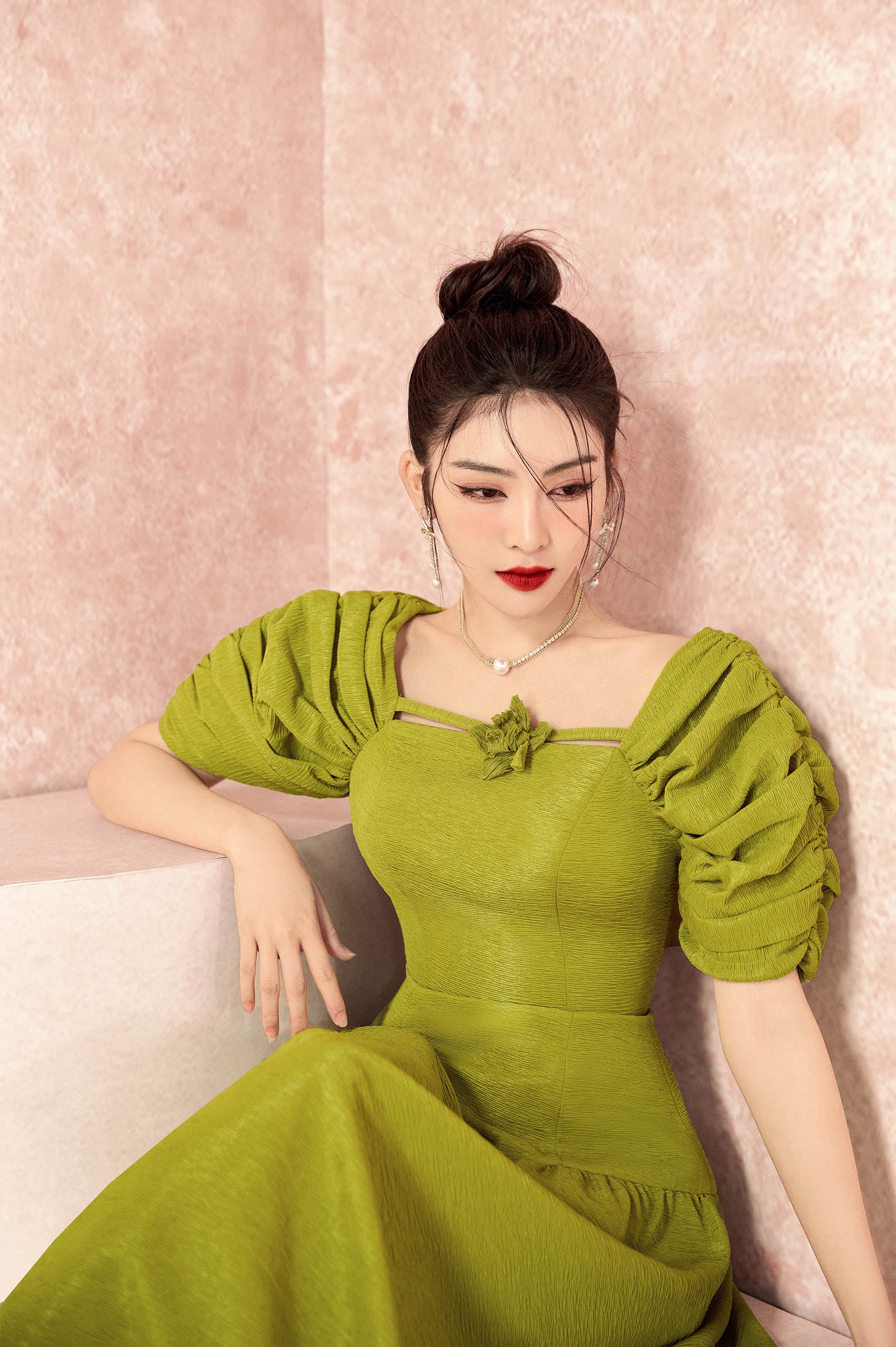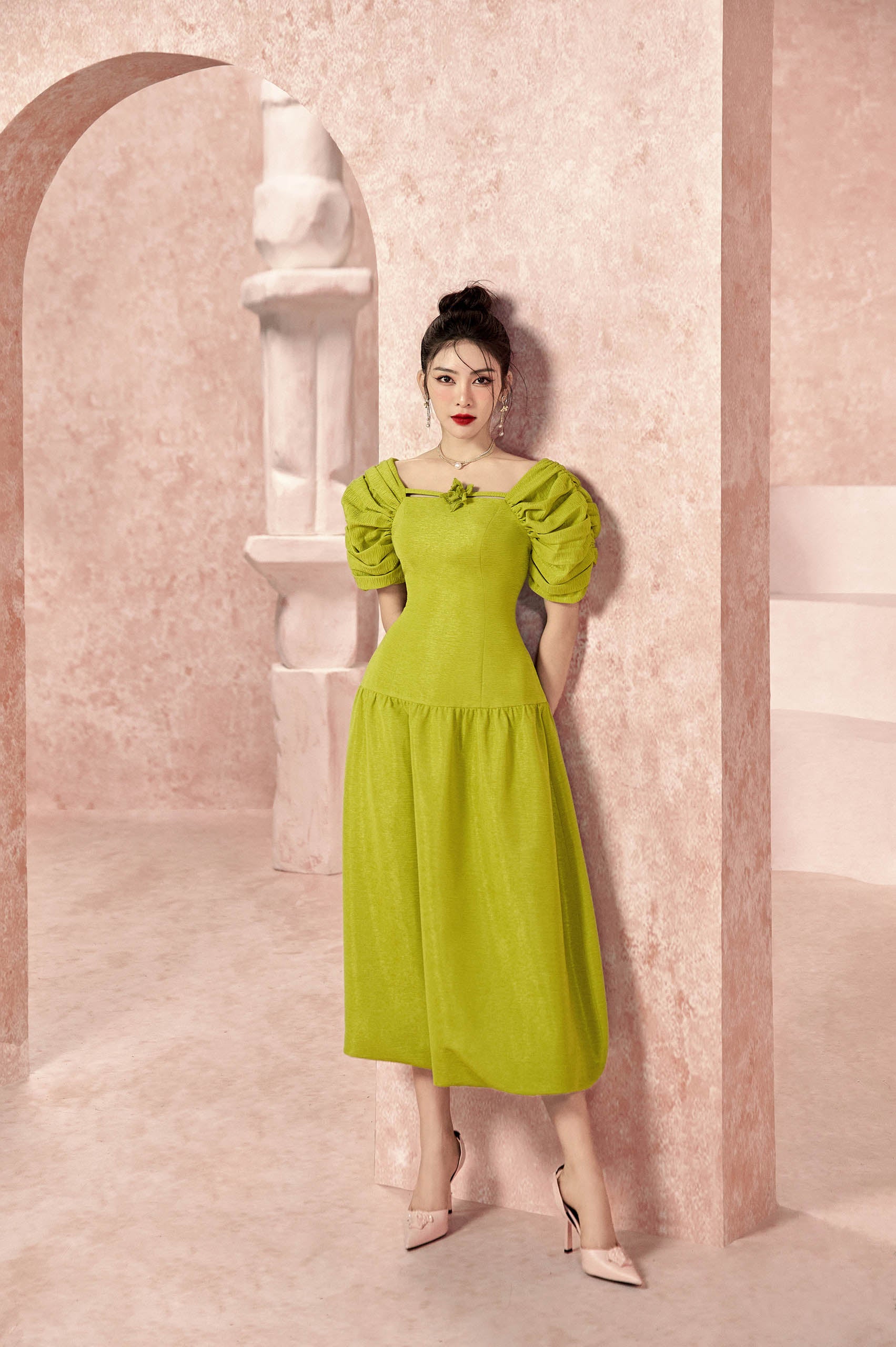 Calla Puffy Sleeves Dress depicts a new break in springtime days. The design with ruffled sleeves, a tight waist shape coupled with a modern bum, and a background that is liberal on the foreground and inspired by greenery or young buds. The knitted fabric known as Crinkle Jersey Georgette is comfortable and elastic.