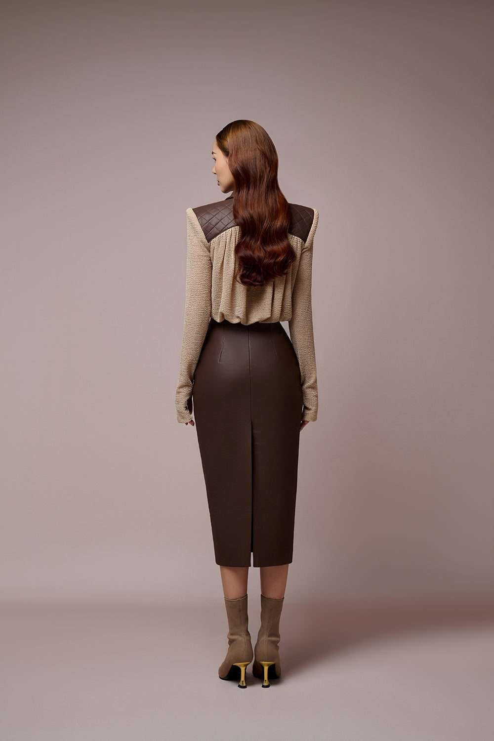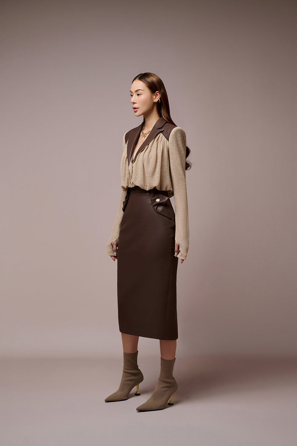 In a delicate, demure shade of camel shade, elegant emotions are portraited with L'ALLÉE's latest Caria Set. The combination of a relaxed croptop with pencil skirt create sensual lines for the woman. Along that is the use of simili leather to highlight the shoulder and collar with smocking details on the hips for a stylist, modern touch. Experience Caria in store today!