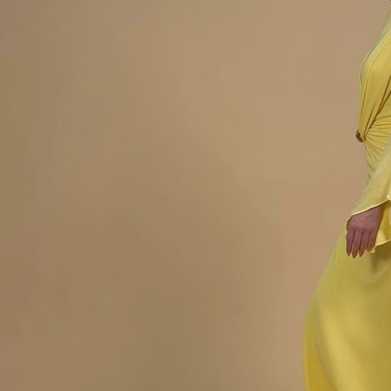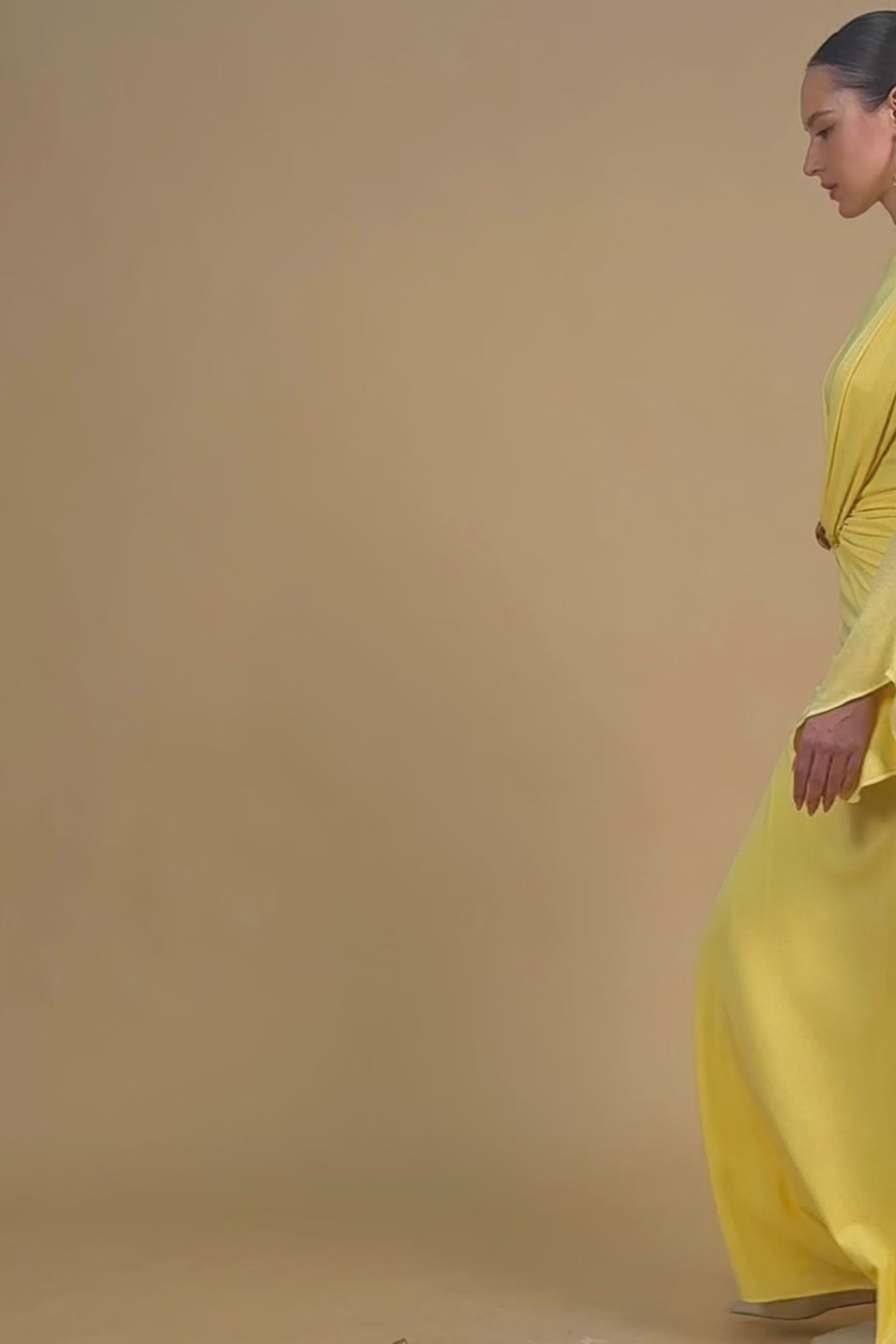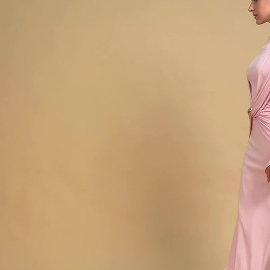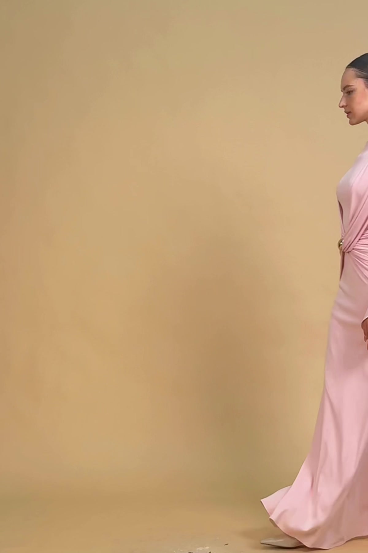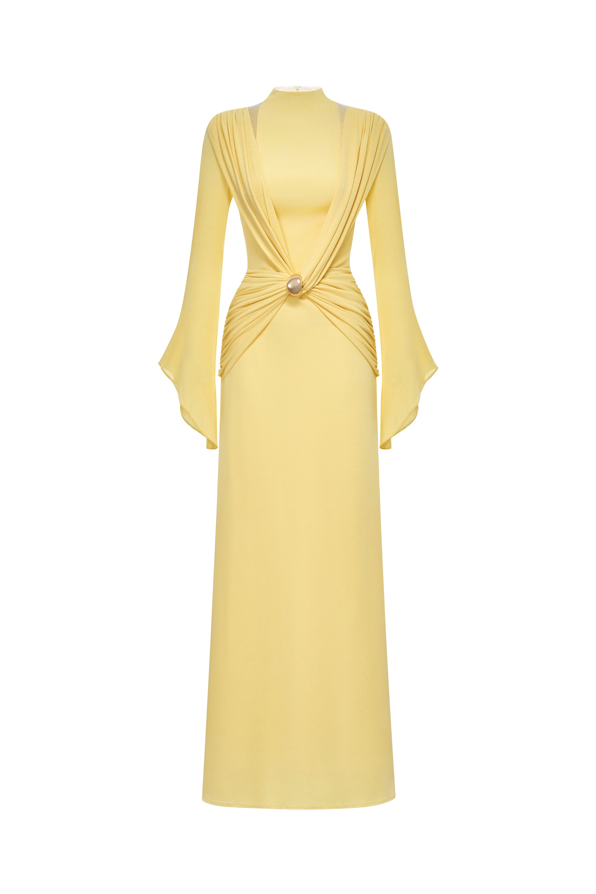 Midi fishtail dress with high neckline, deep V illusion, side drape fixed at the waist with a round metallic clasp. Long fitted sleeves finished with elegant flared slits.