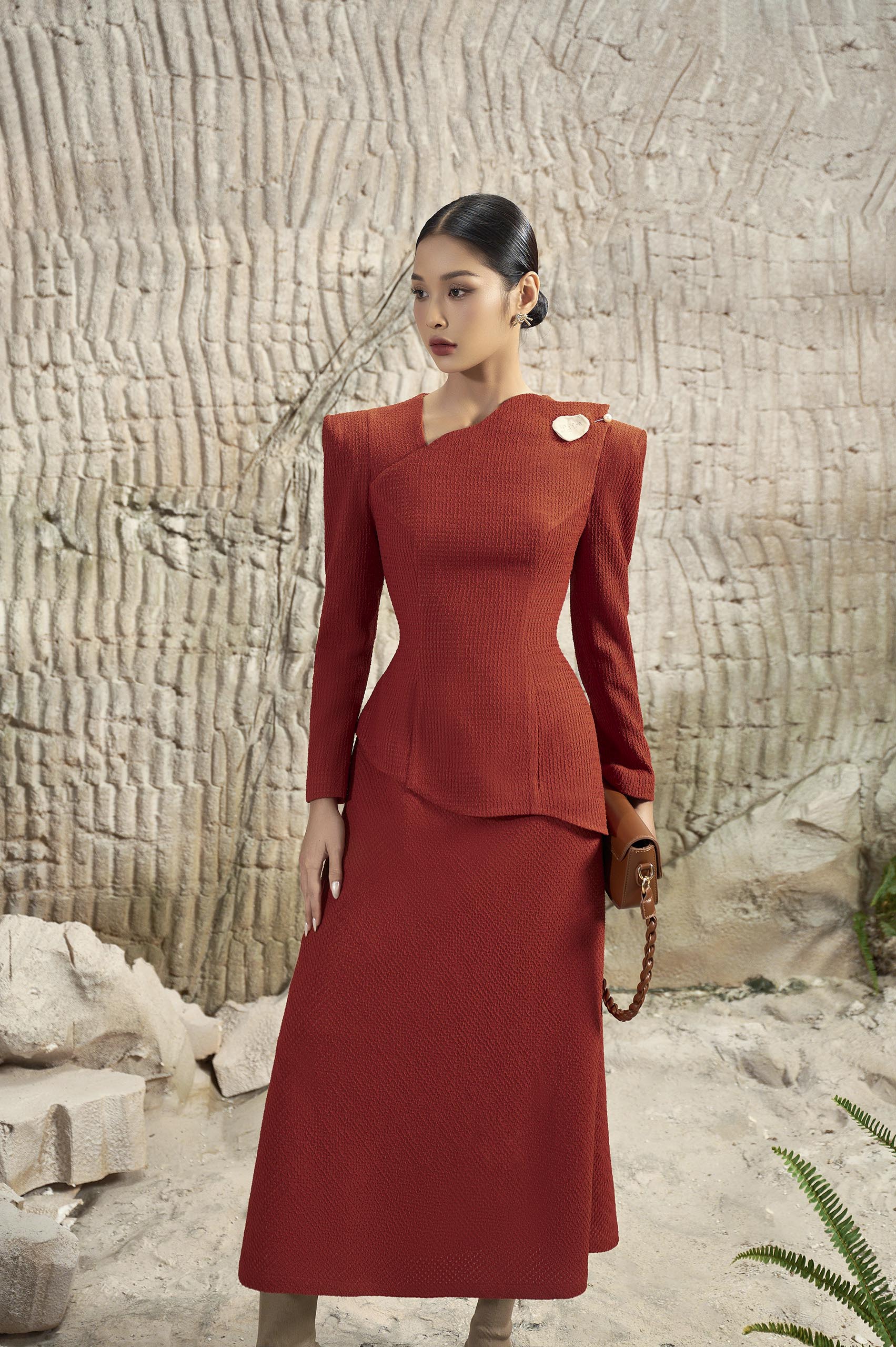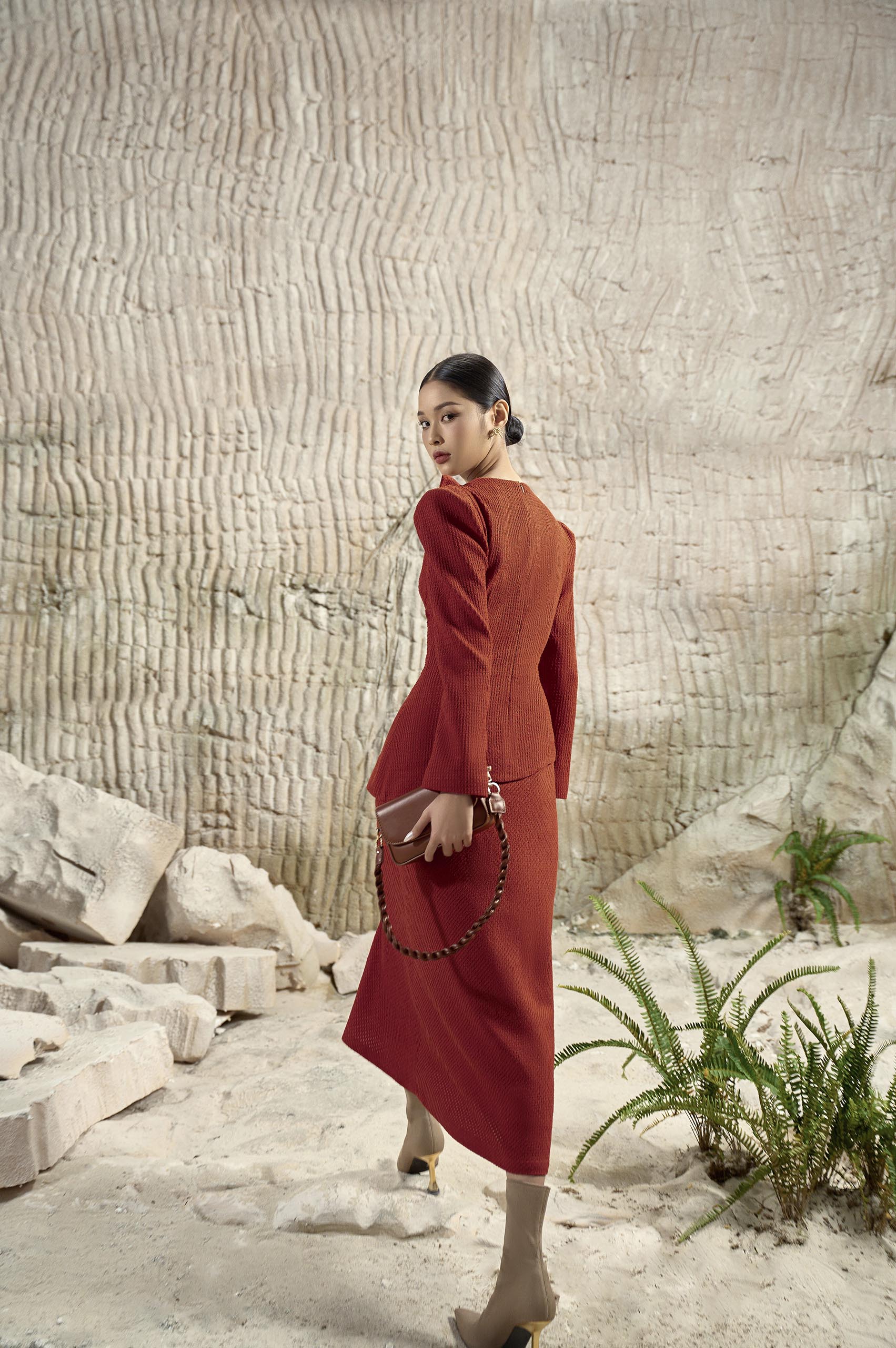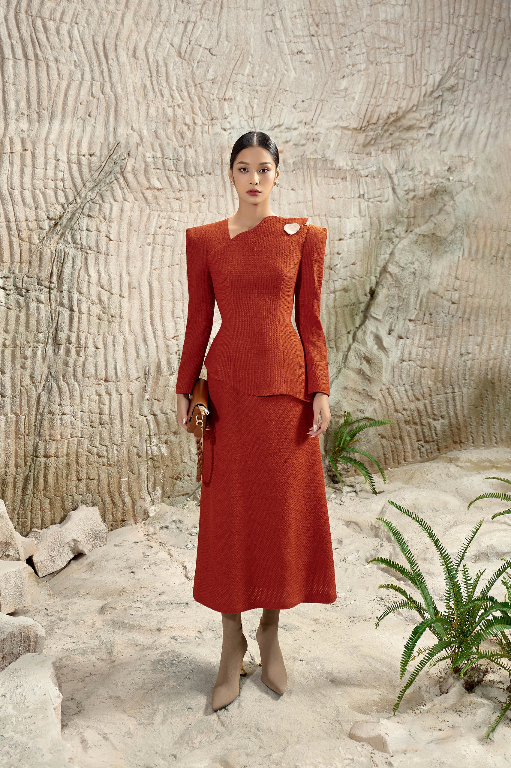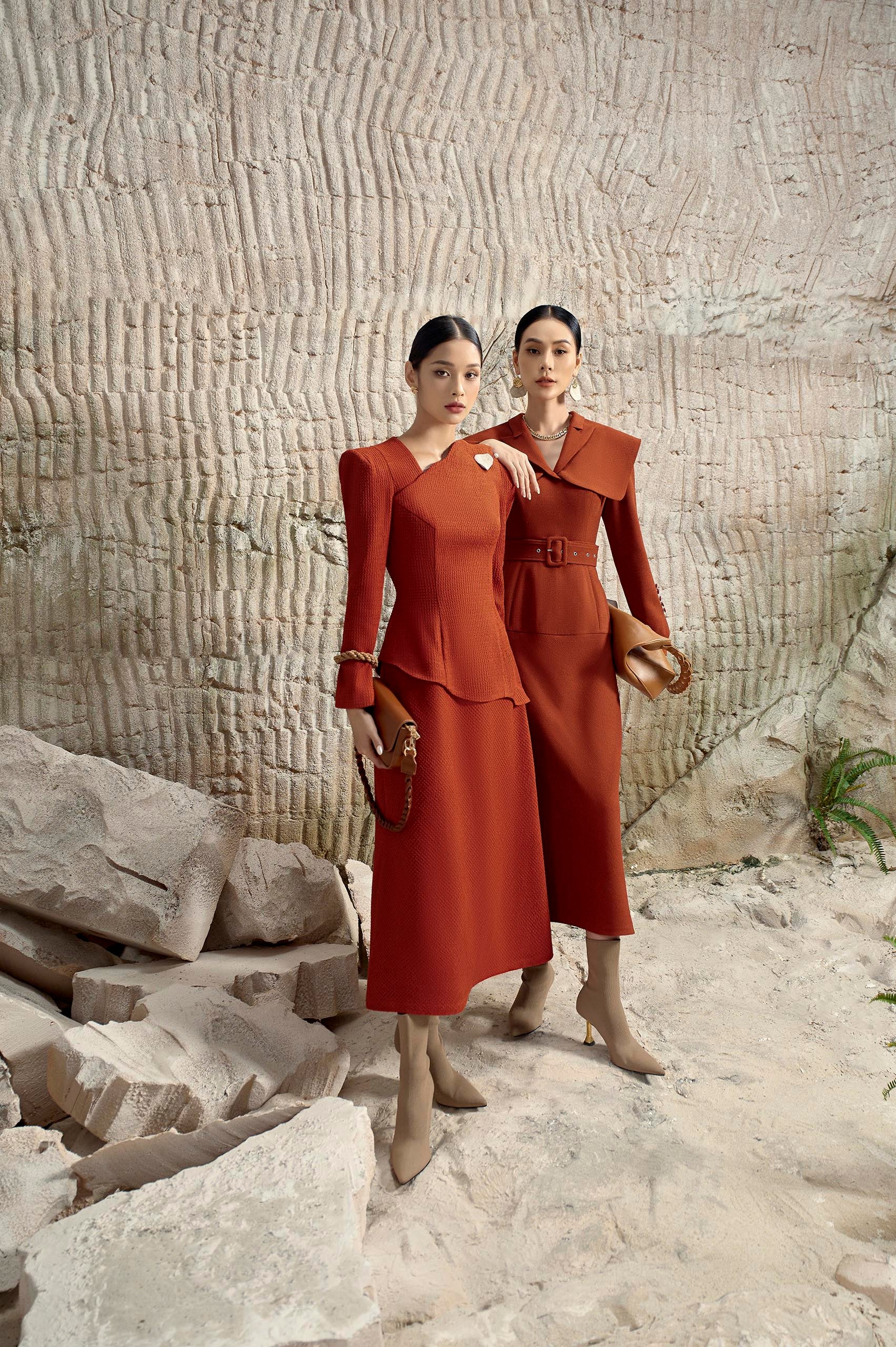 Celeste Diagonal Neck Dress is a striking burnt orange color, a symbol of deep and emotional sunsets, while Ivory Diagonal Neck Dress is the elegance of ethereal white beige. When she appears in front of the crowd, the combination of horizontal shoulder design, slanted neck, and sharp curves gives her a neat and attractive beauty.