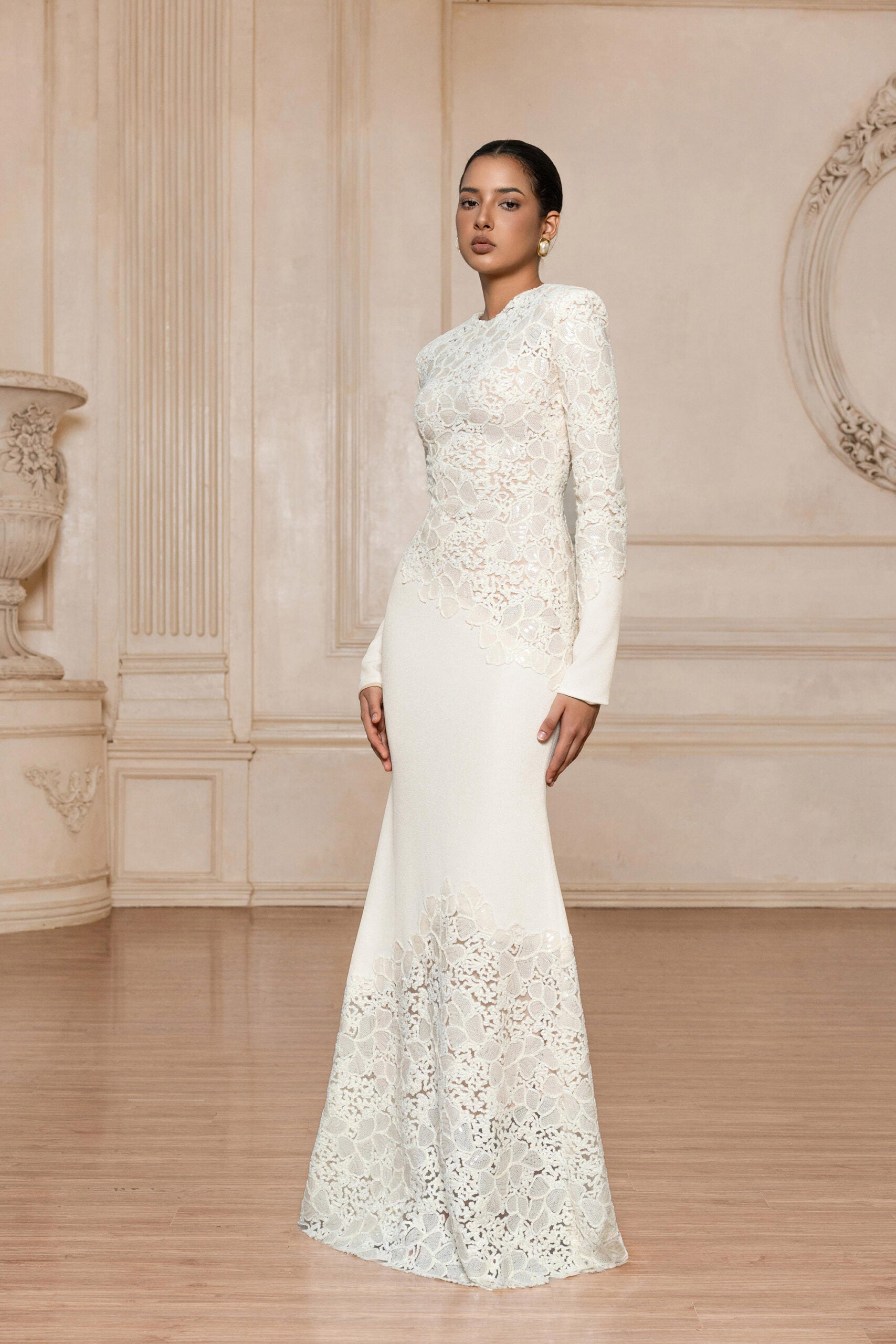 Material: Velvet embroidered with sequins. Color: Ivory Mist. Dress Length: 163-168 cm. Sleeve Length: 63 cm. Neck: 46 cm.