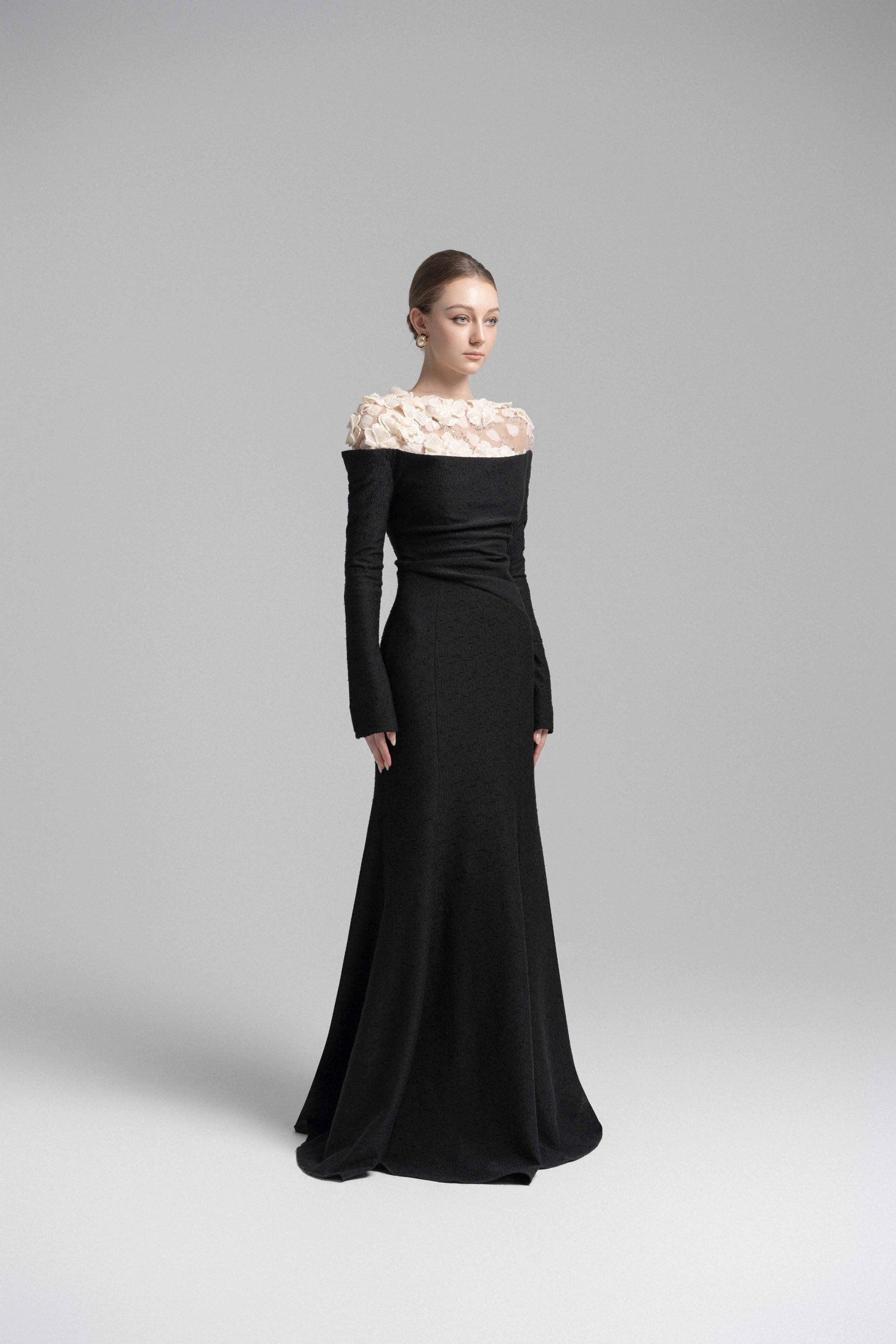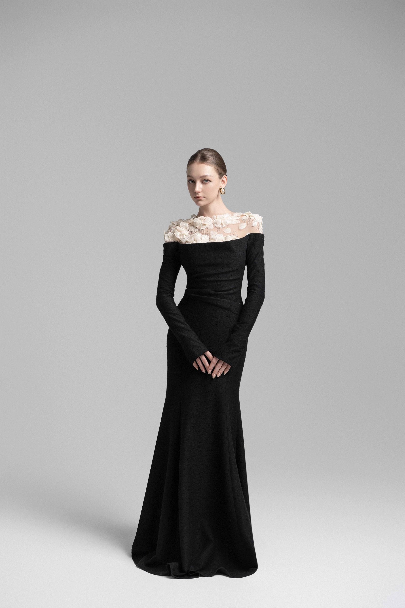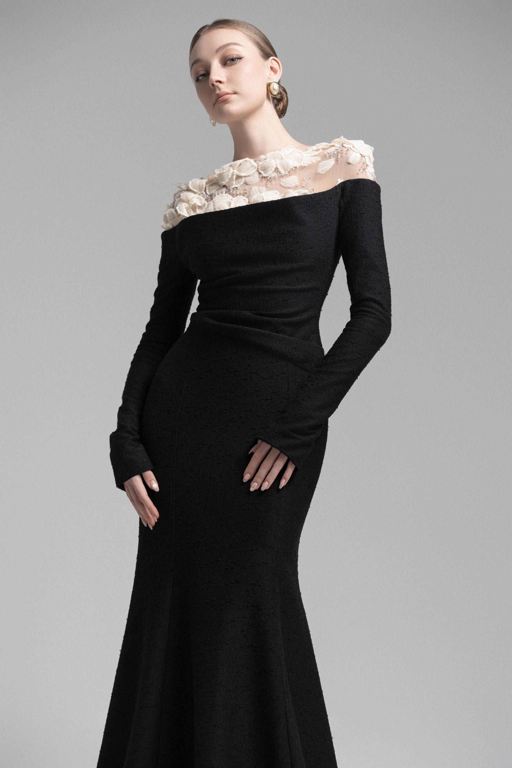 A sophisticated mermaid midi dress featuring a strapless bodice with soft draped detailing at the bust and shoulders. The asymmetrical draping at the waist enhances the silhouette, accentuating natural curves. Sheer nude mesh on the shoulders seamlessly blends with the skin, adorned with delicate lace appliqués and hand-embellished crystal details for a luxurious touch. This dress is a perfect choice for upscale events and elegant soirées, exuding a refined yet captivating allure.