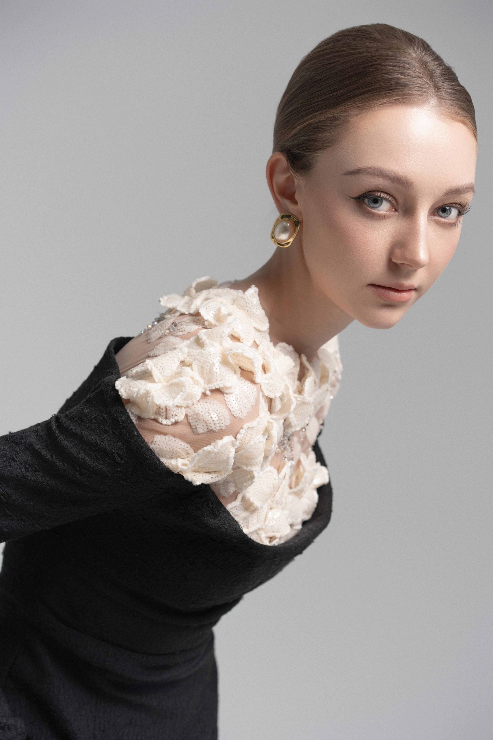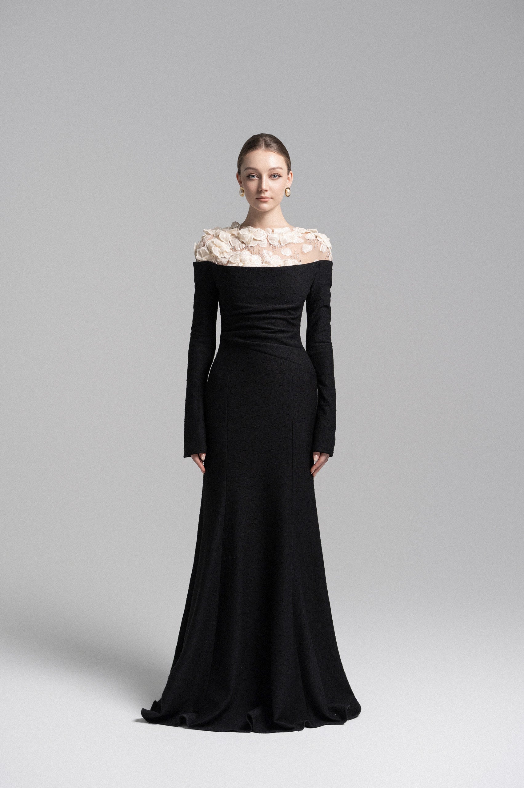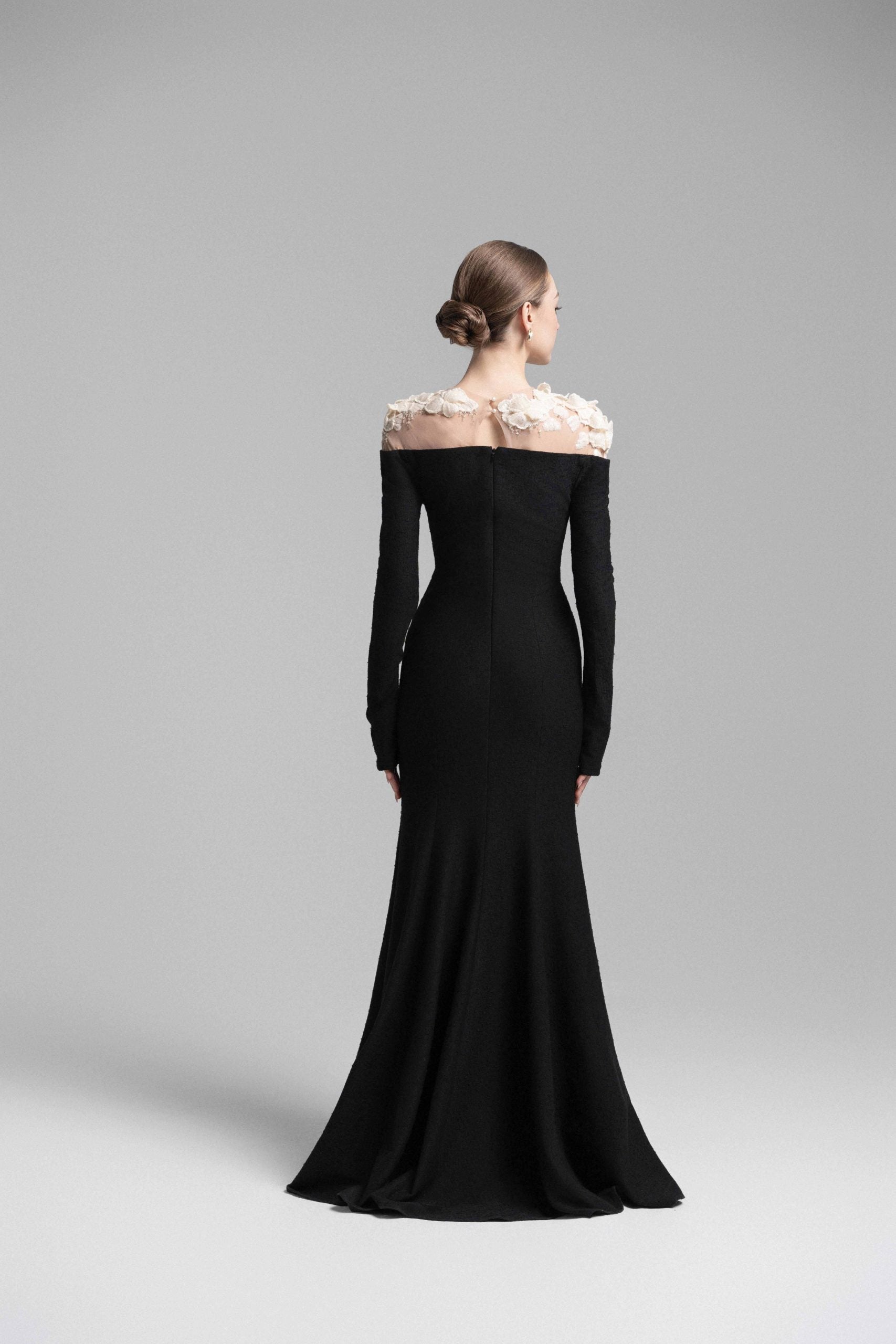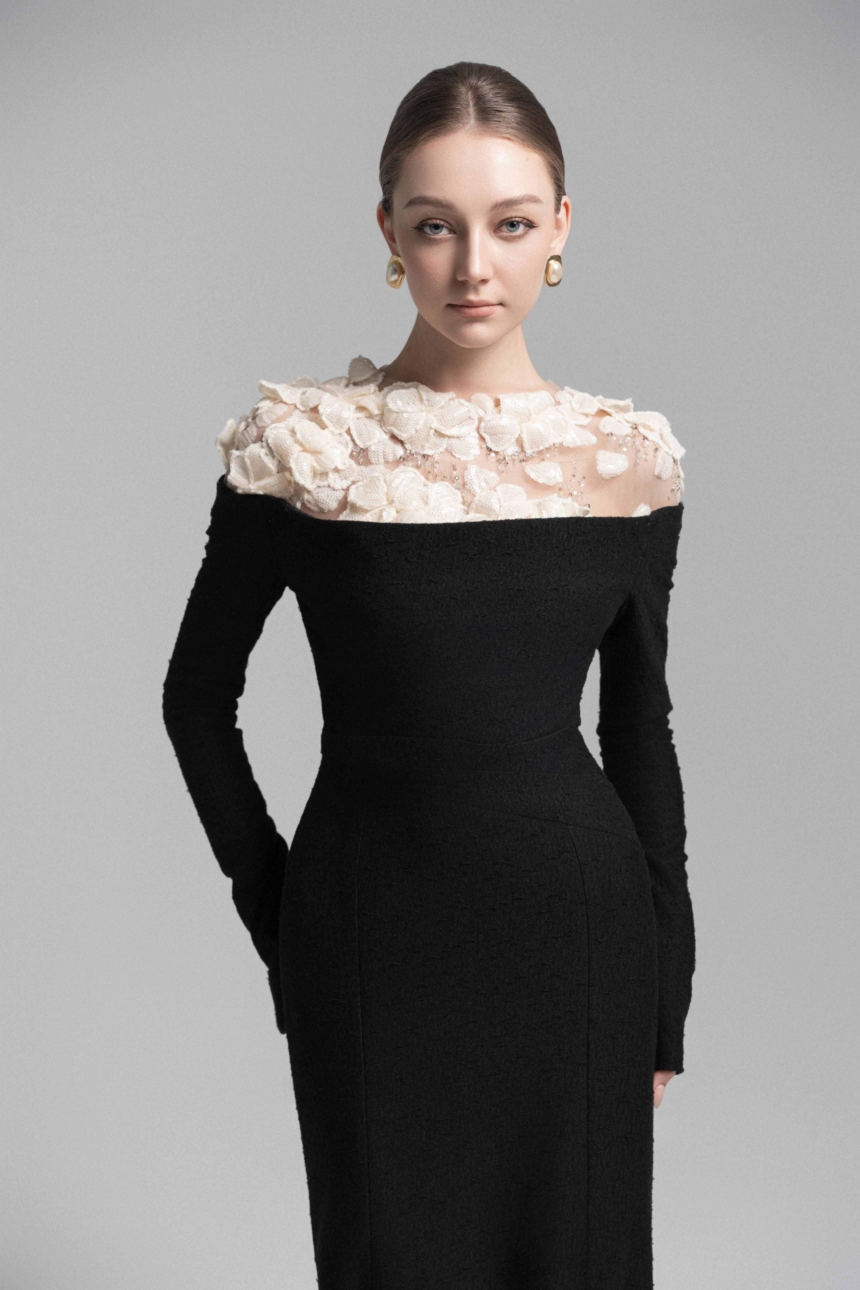 A sophisticated mermaid midi dress featuring a strapless bodice with soft draped detailing at the bust and shoulders. The asymmetrical draping at the waist enhances the silhouette, accentuating natural curves. Sheer nude mesh on the shoulders seamlessly blends with the skin, adorned with delicate lace appliqués and hand-embellished crystal details for a luxurious touch. This dress is a perfect choice for upscale events and elegant soirées, exuding a refined yet captivating allure.