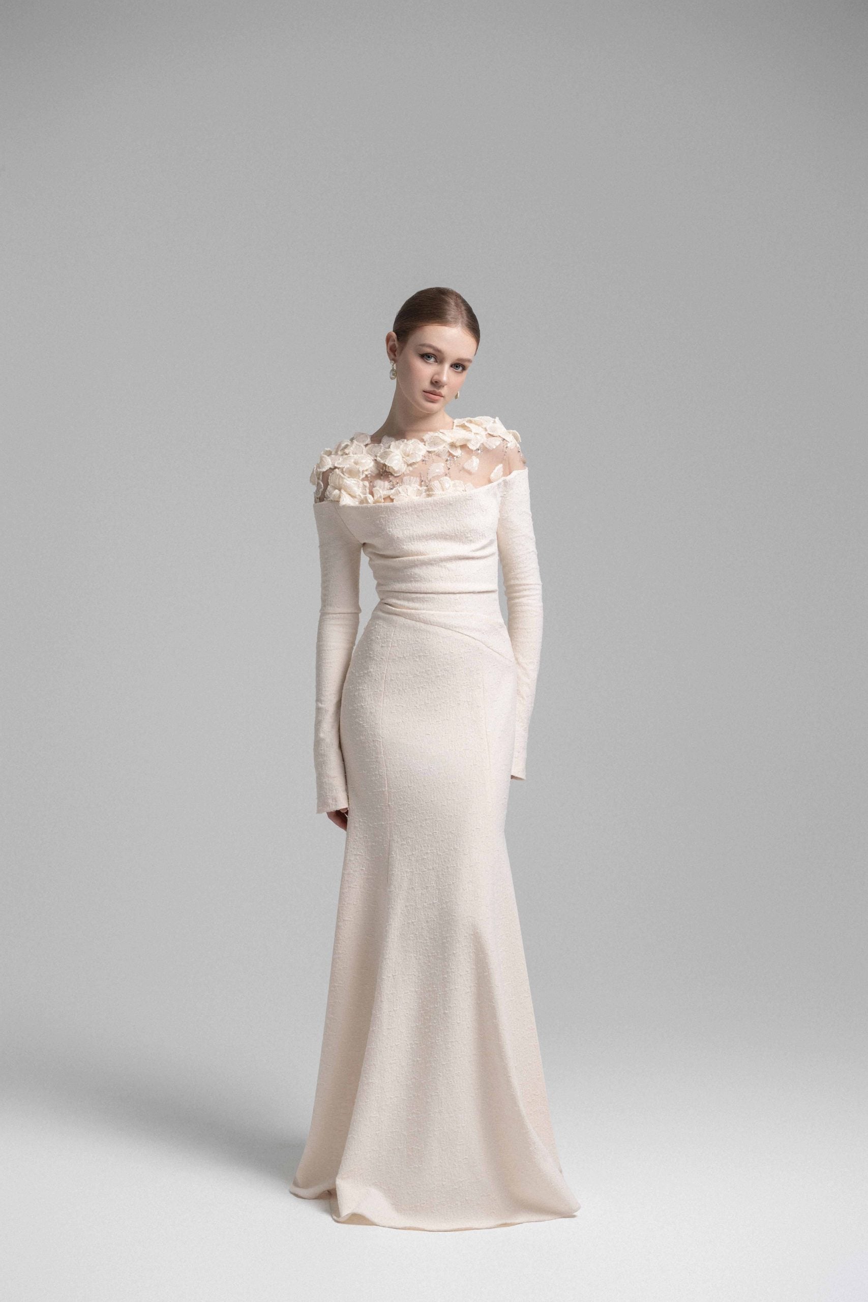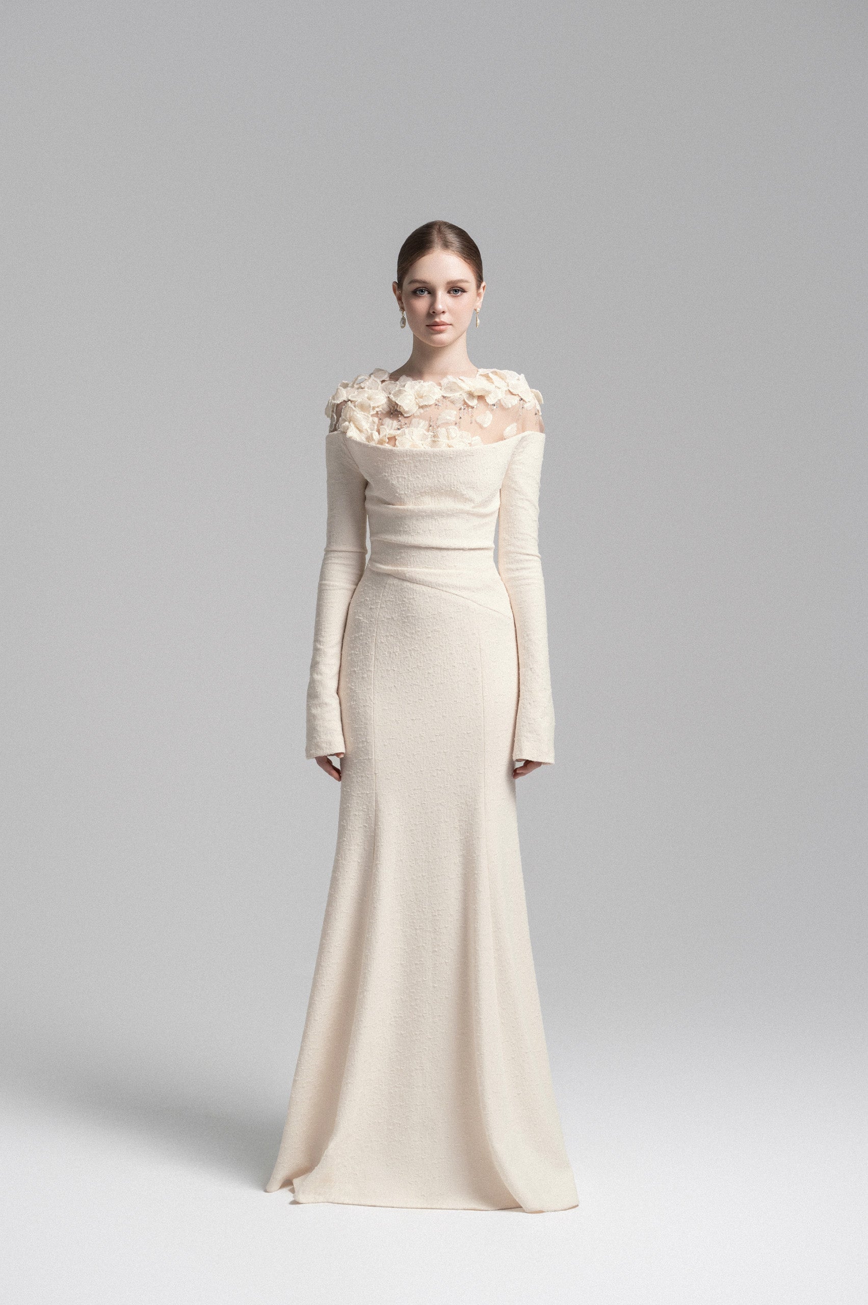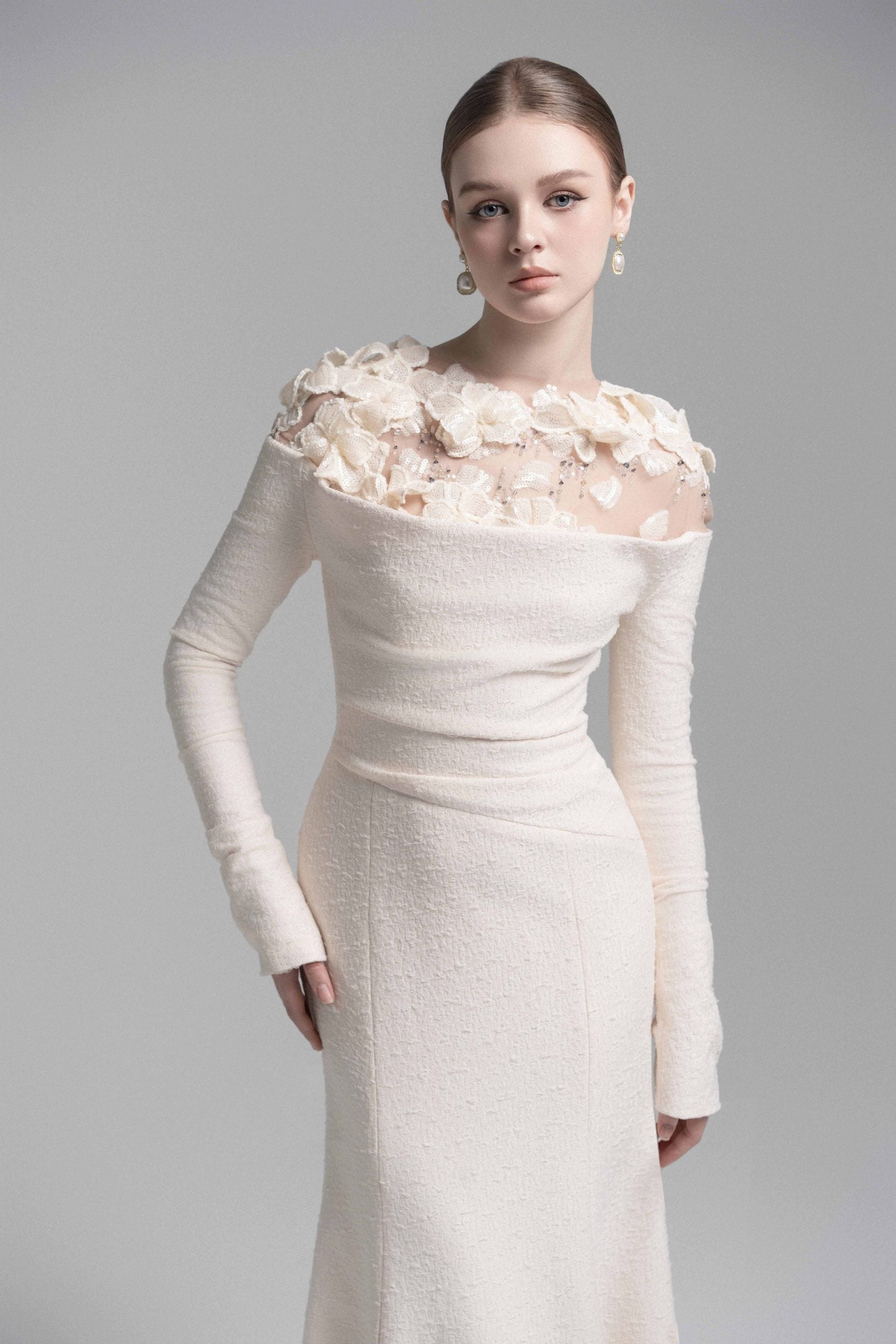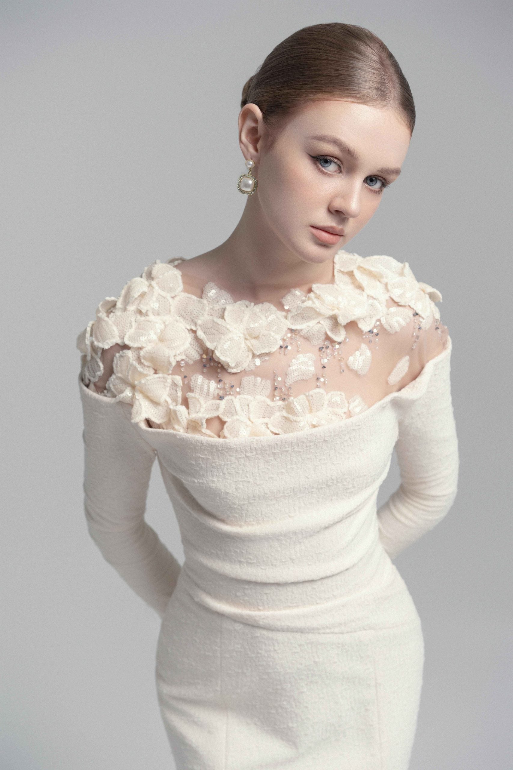 A sophisticated mermaid midi dress featuring a strapless bodice with soft draped detailing at the bust and shoulders. The asymmetrical draping at the waist enhances the silhouette, accentuating natural curves. Sheer nude mesh on the shoulders seamlessly blends with the skin, adorned with delicate lace appliqués and hand-embellished crystal details for a luxurious touch. This dress is a perfect choice for upscale events and elegant soirées, exuding a refined yet captivating allure.
