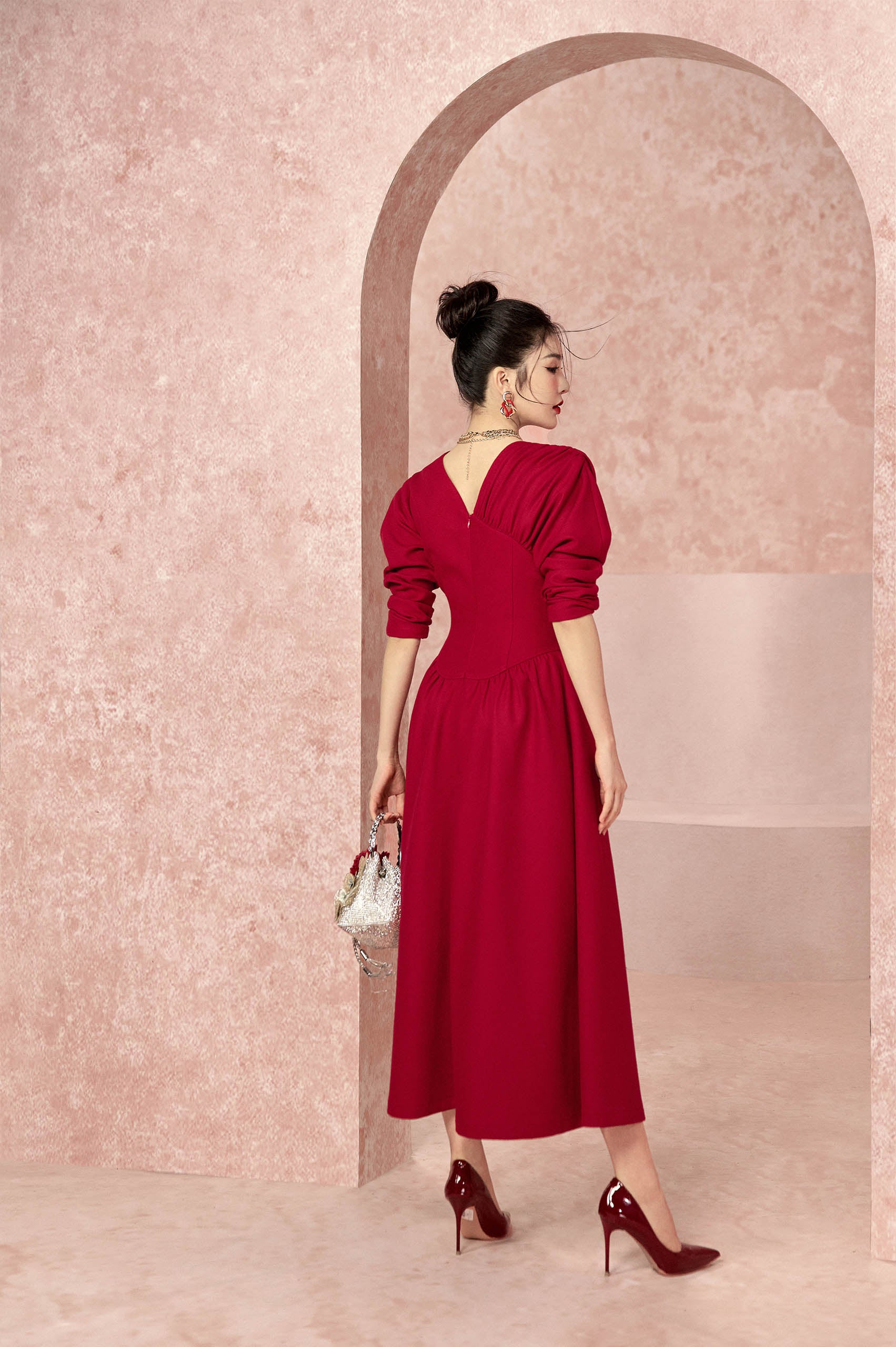 On the background of Plain woven fabric, the Charming Shoulder Puff Corset Dress not only stands out but also has a soft charm. The dress' uneven one-shoulder drawstring design adds a distinctive and eye-catching accent when the corset waist is tightened. She will have additional ideas to finish her outfit for the party thanks to the maroon crimson color and the delicate openings on the chest.