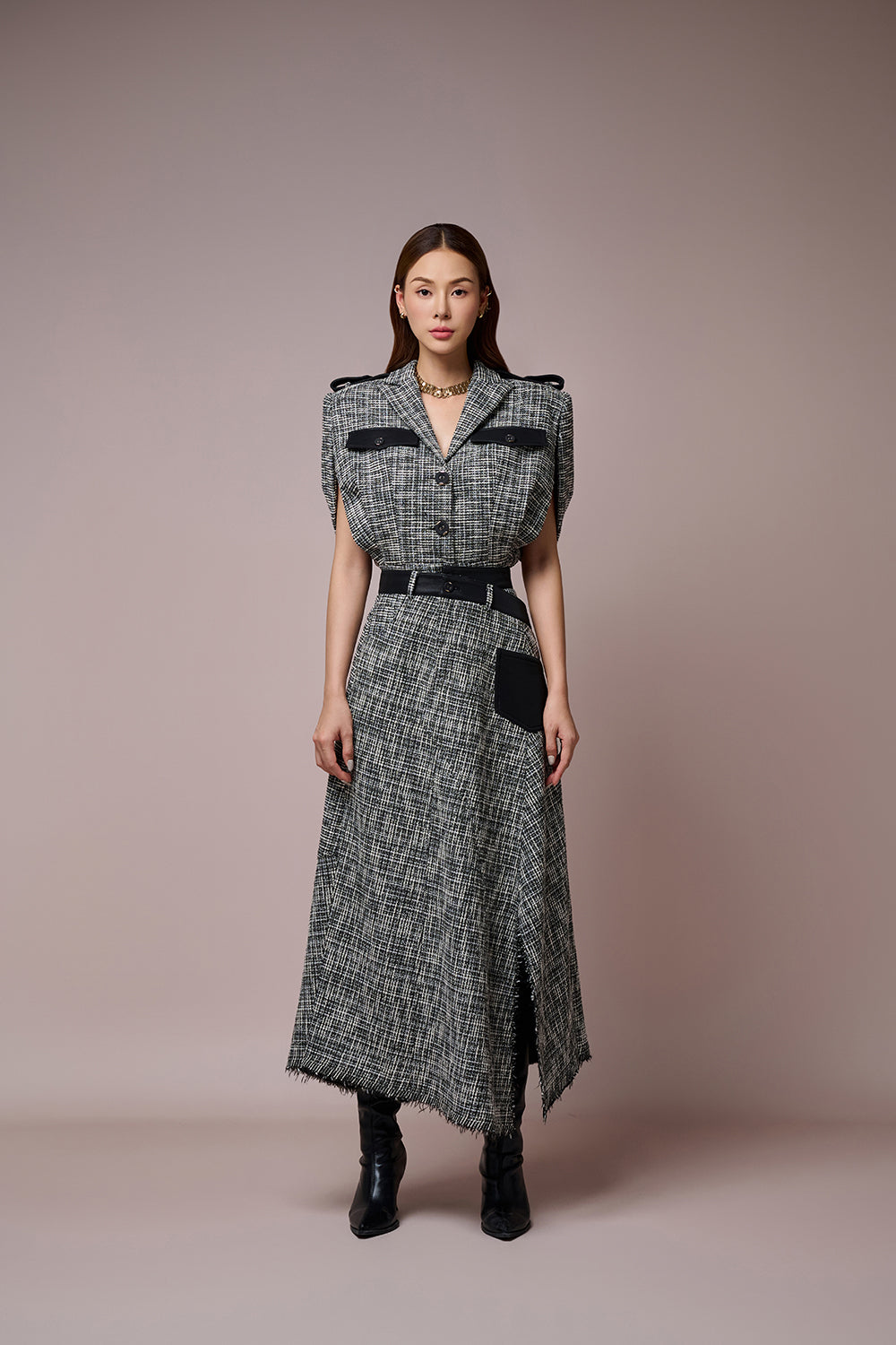 A-shaped skirt with a waistband designed with 2 asymmetrical stylized waistbands. The details, additional lines, and tailoring are arranged in a strange structure, the unique combination of simily leather fabric and high-quality felt tweed fabric, creating an overall modern personality. The hem has a moderate cut and a tassel under the hem, making the design both suitable for elegant girls and pleasing to those with personality.