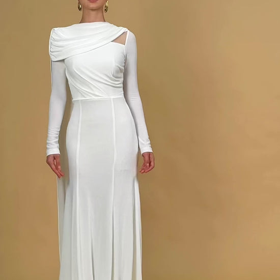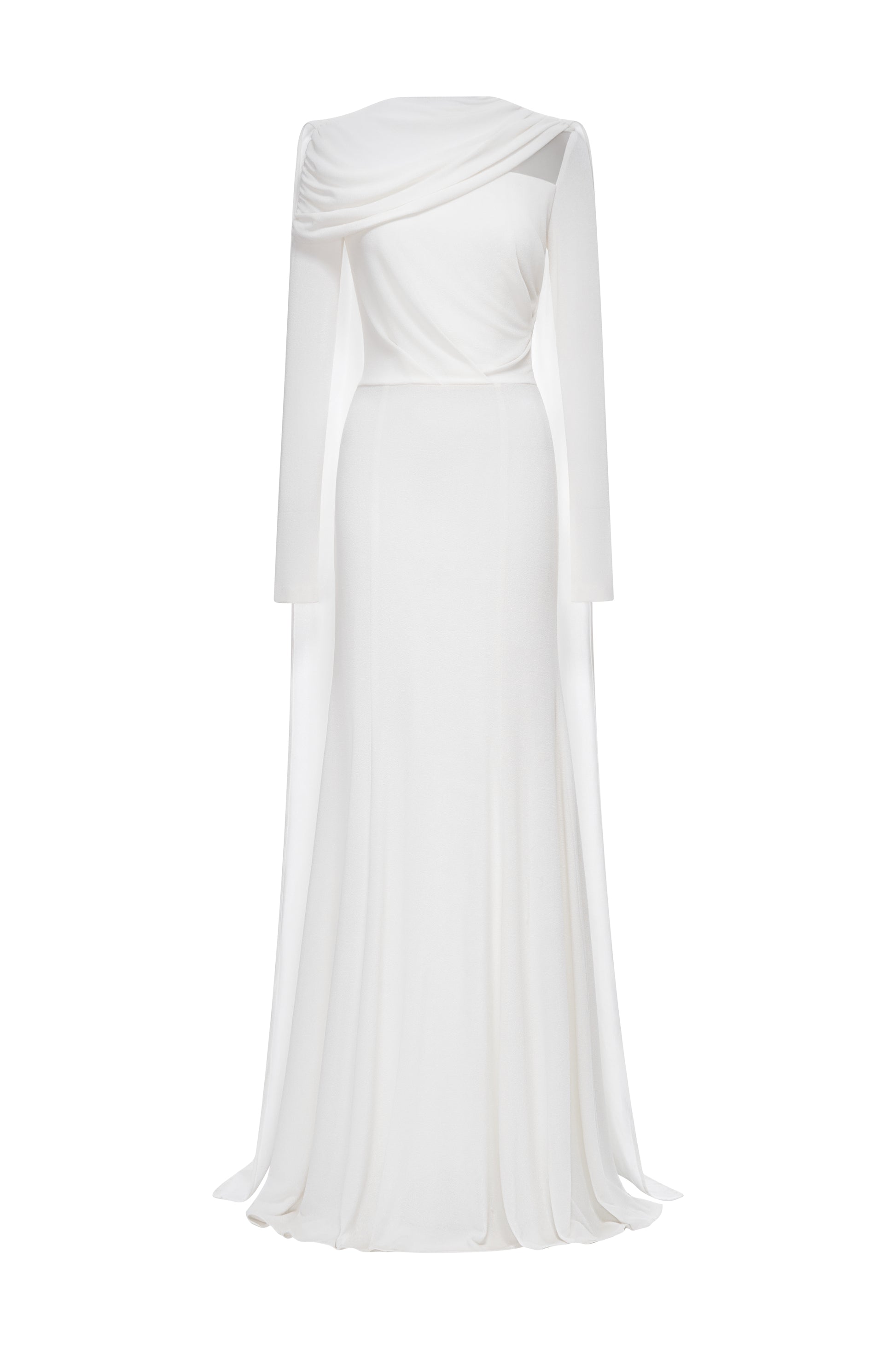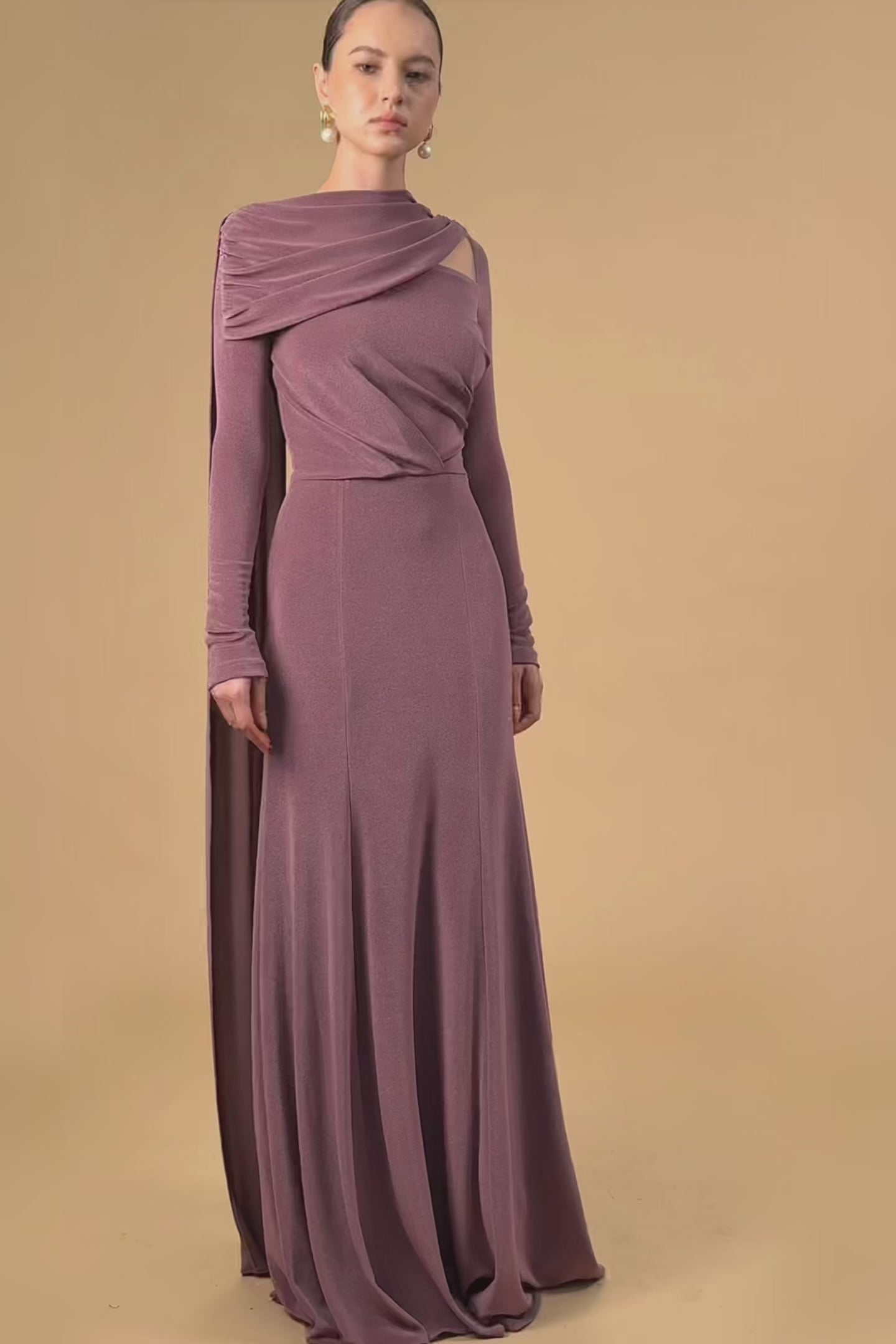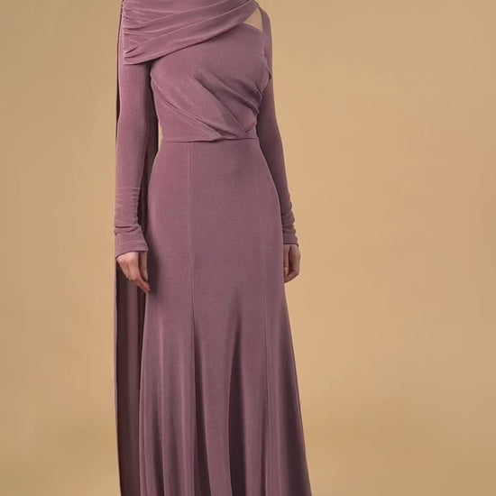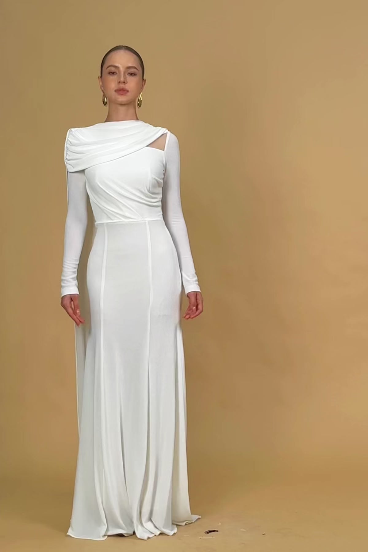 Fitted fishtail evening gown with asymmetric neckline, draped across the shoulder and bust with cut-out detail, railing sash and long sleeves.