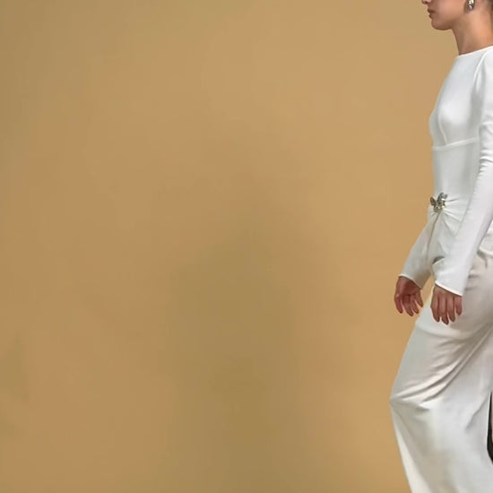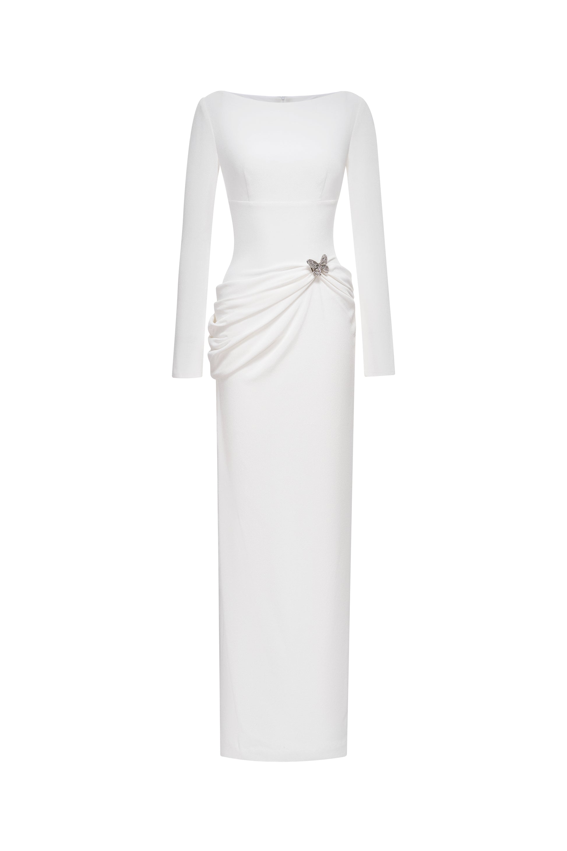 Fitted pencil dress with boat neckline and long sleeves, featuring asymmetric waist draping, accented with a delicate metallic detail.
