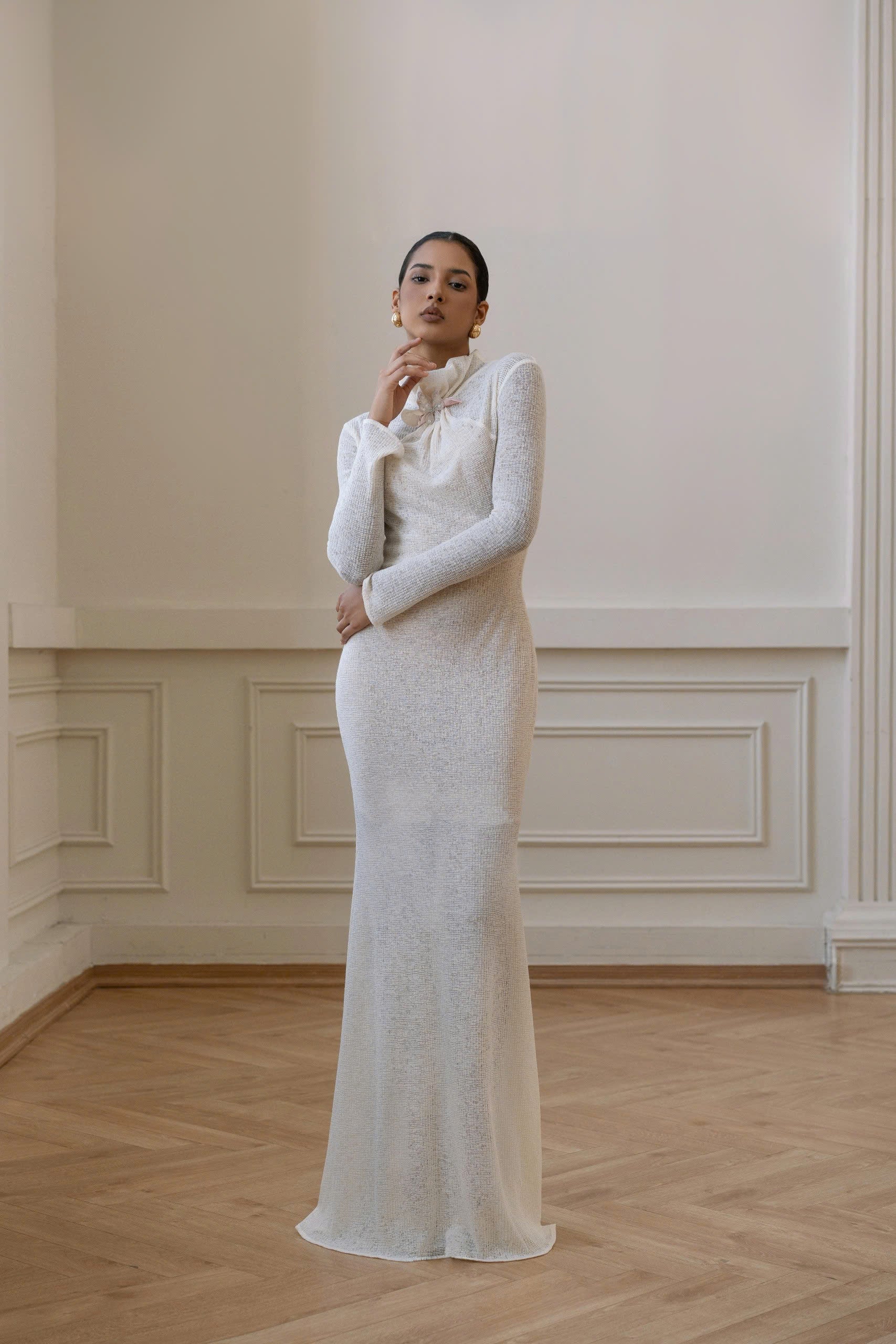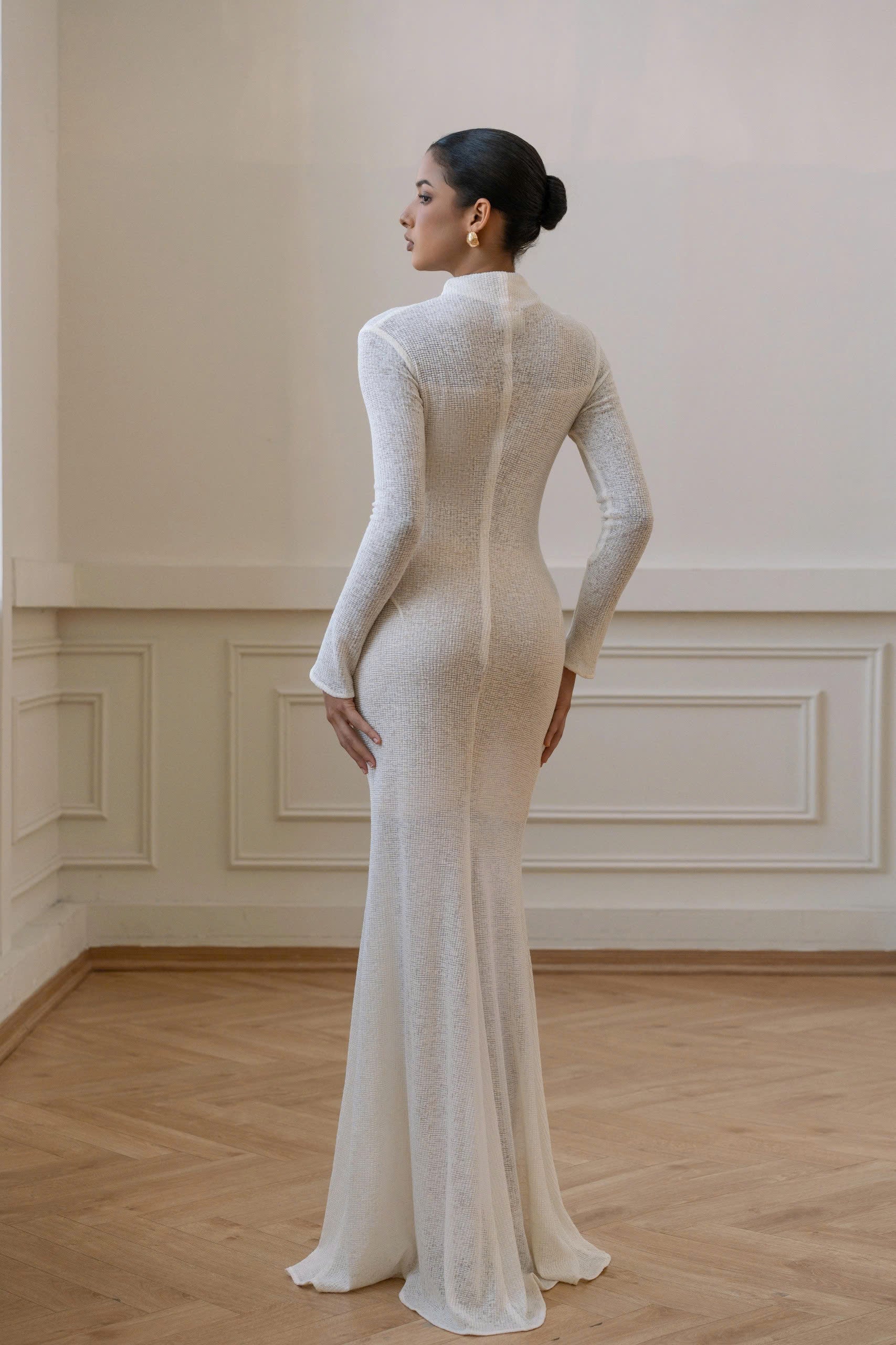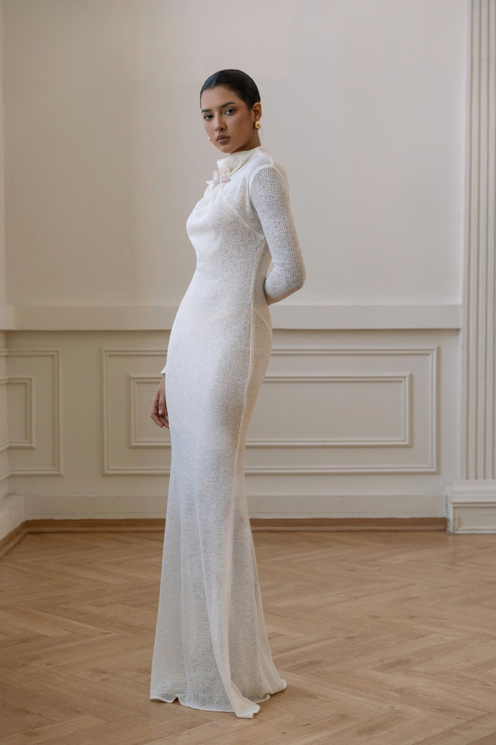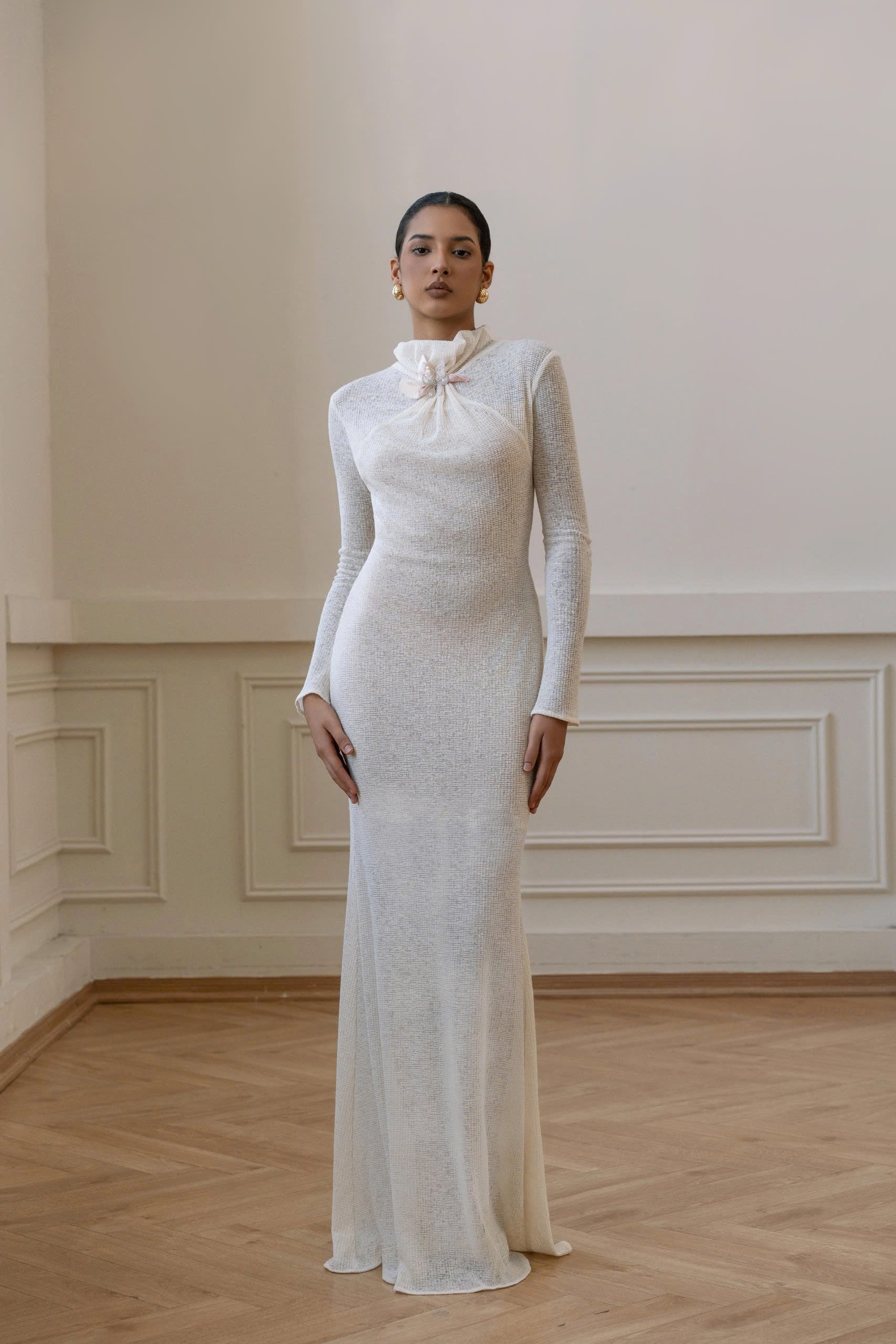 The Wool Warp Knitted dress is made from a 4-way stretch knit mesh, offering a soft texture and gentle drape. Its lightweight surface gives a fresh look, with moderate transparency. The Pastel Cream color adds a subtle elegance. This fitted mermaid silhouette features a ruched high neckline and is adorned with a hand-crafted 3D floral charm, exuding sophistication and class.