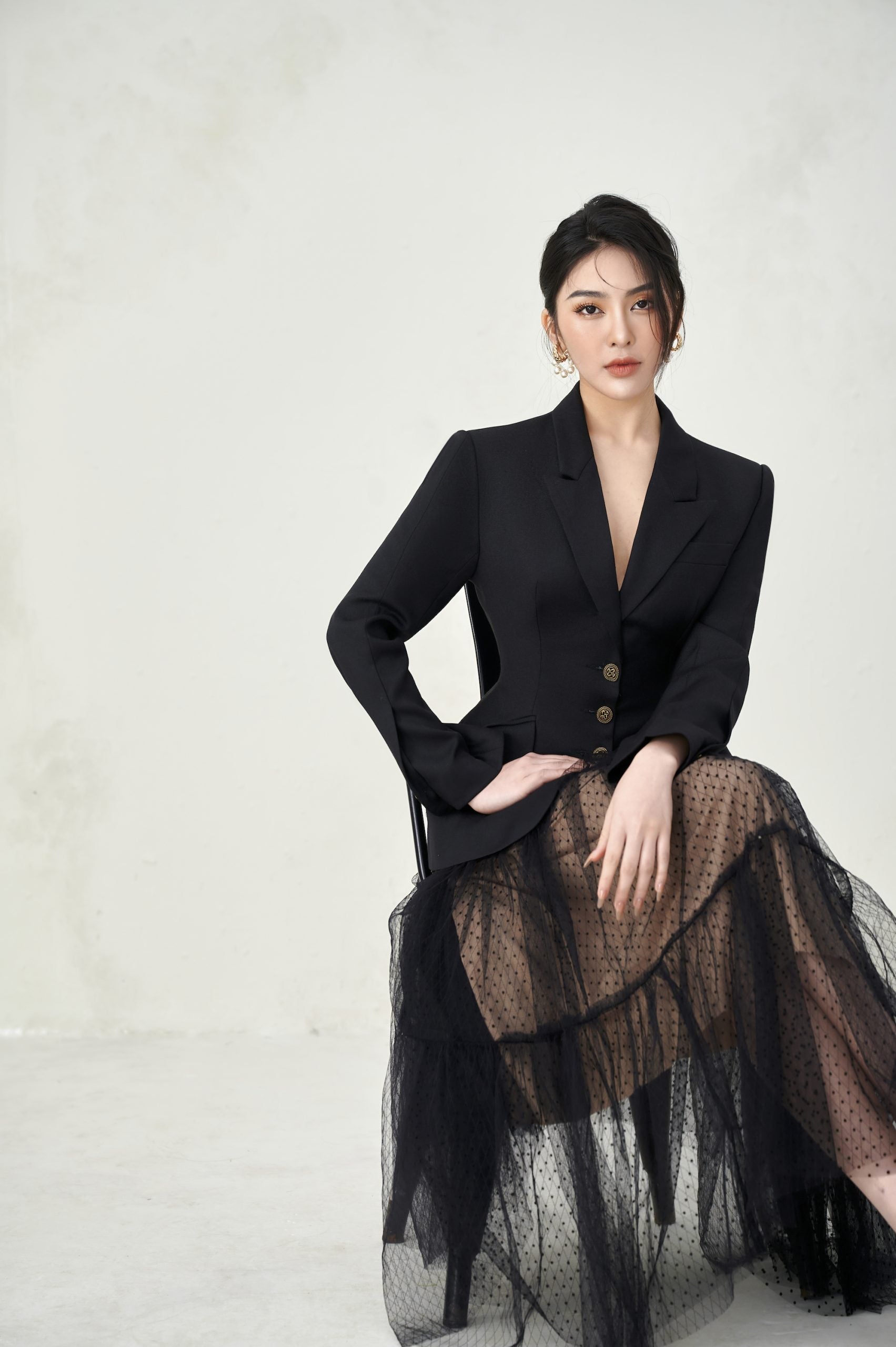 Minimalist black color is always the first choice of ladies because of its applicability and attractive trendy beauty. Regardless of the situation, the modern lady L'ALLÉE always knows how to express herself, refining each outfit to be confident and show her independent bravery. Zoey Black Vest Blazer with its classic shape, curvy corset waist, and perfect hip enhancement and waist tightening technique, accentuated the seductive curves of a woman. The combination with Gianna Skirt polka dot mesh chiffon material brings a novelty, not too tight in the serious discipline of the vest, but more feminine and gentle.