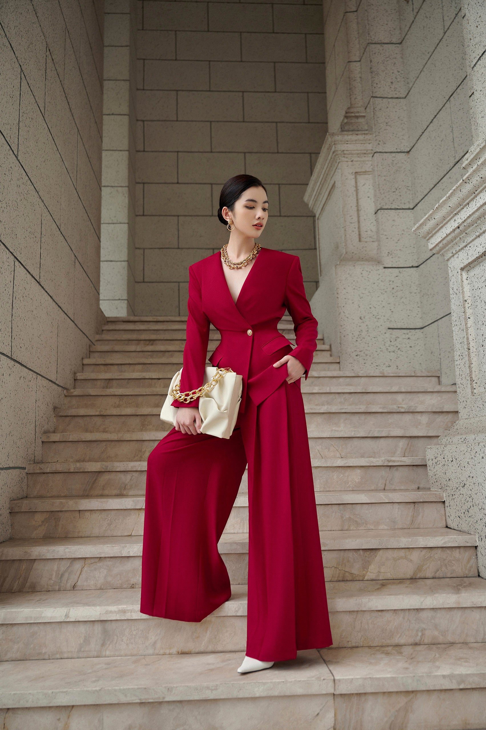 Blazer is the treasure that allows her to appear elegant and luxurious wherever she goes. Possessing an extended vest shape, V-neck, and the technique of pressing the waist and increasing the hips in a subtle way, the wearer's physique is perfectly refined and sculpted. When L'ALLÉE wears it with wide-leg pants and soup details to create accents, she just needs to mix and match a pair of high heels to look confident and sexy every time she steps out.