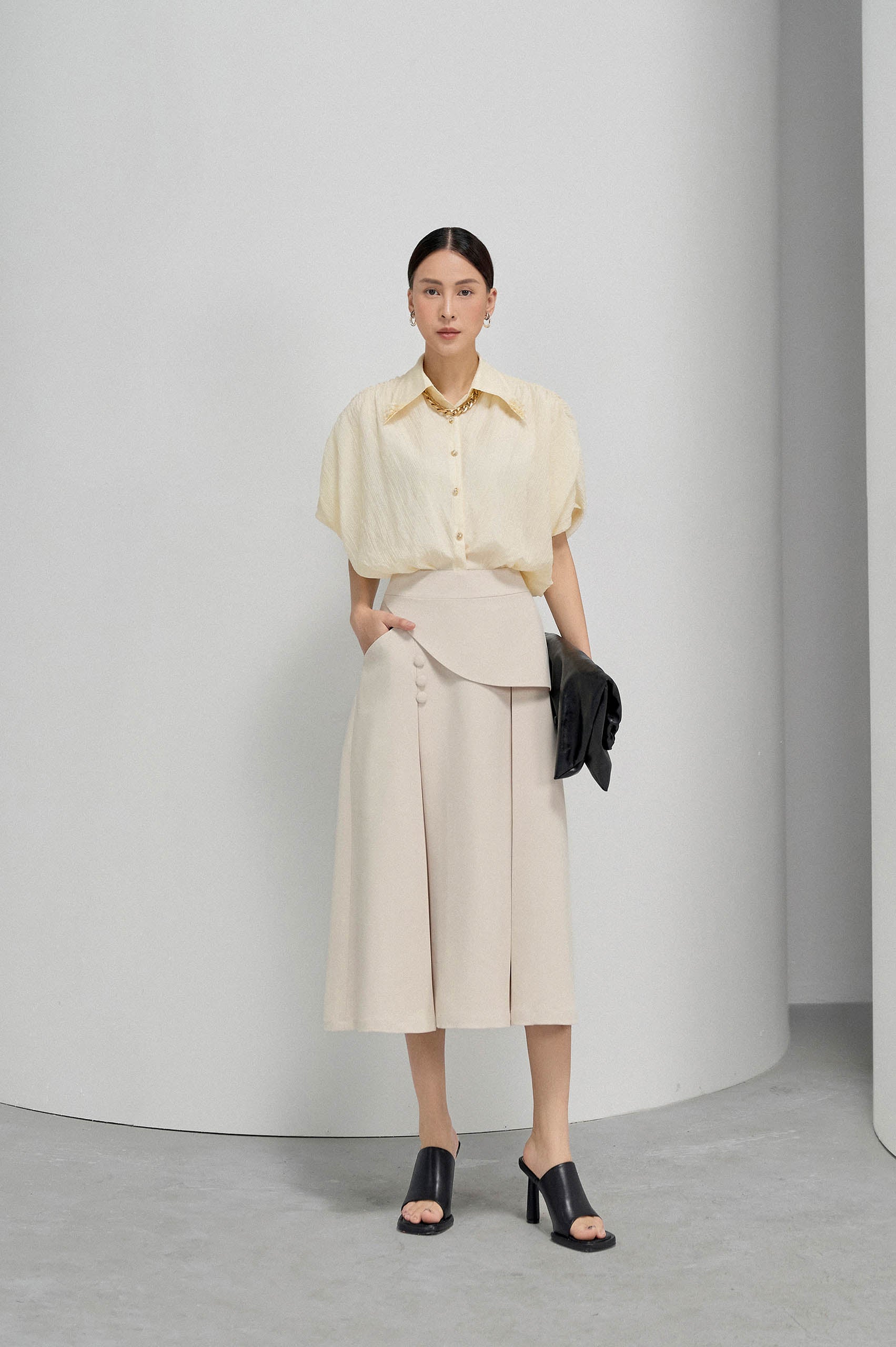 The basic A-line skirt is an item that is no longer strange to ladies, but the highlight that Illuminate Twill Skirt brings is the asymmetrical strapless response at the waist to create personality and conceal the lower abdomen The familiar A-line skirt is easy to mix & match with shirts, any shirt, blazer, suit... into sets of different applicability in many situations. Material from Tuytsi fabric has a moderate thickness, creating a drape for extremely comfortable but still polite pants.
