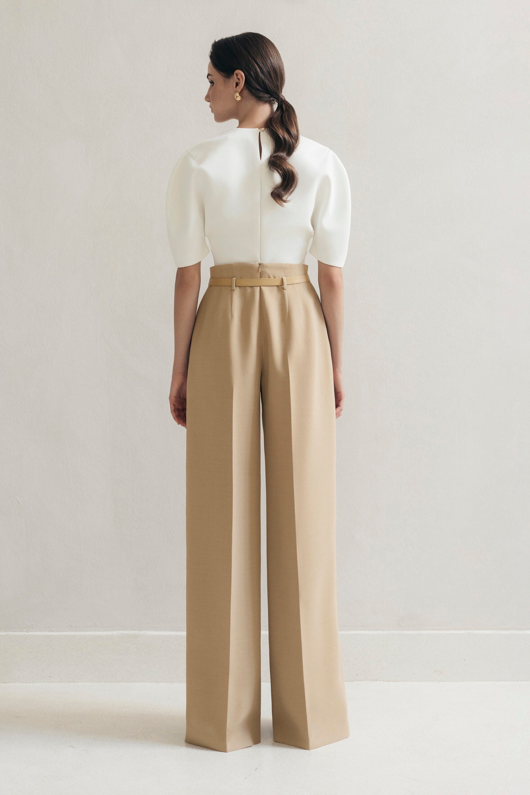 These wide-leg trousers present a modern and comfortable look, featuring a unique side pleat design paired with an exclusive leather belt, creatively tied for an impressive appearance. The soft and pleasant fabric ensures comfort while allowing for easy coordination with a variety of tops, making them ideal for both work environments and casual outings. They can be effortlessly styled with blazers, shirts, or blouses to create diverse looks.