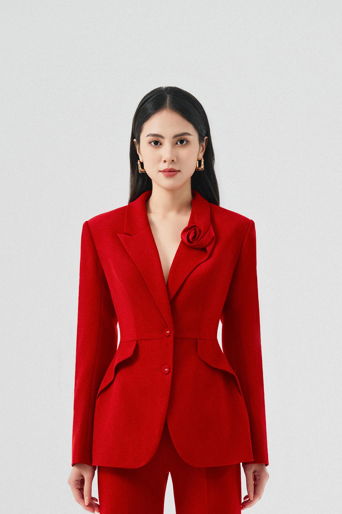 The lucky red color is always the preferred choice when the Lunar New Year is near. A classic fitted Larissa Blazer in crimson red help accentuate every curves. 3D flower lapel add a touch of luxury and femininity that elevate the look. Complete the set with straight pants that elongate your figure.