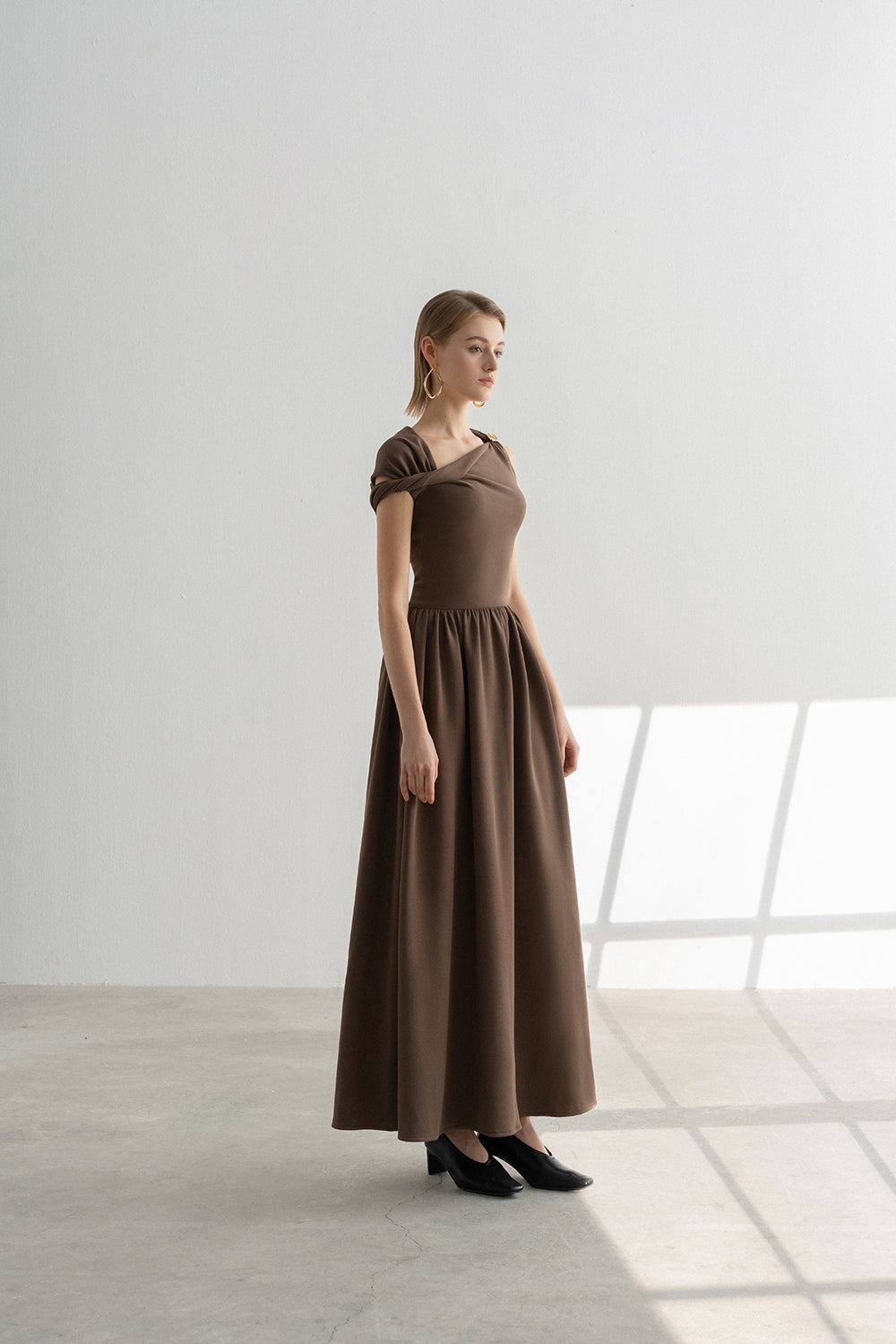 Lillie Midi Dress with A-line form create an easy, comfortable look that balance out with the fitted top with low waist shape. Asymmetric off-the-shoulder detail combine with metallic buckle highlight the uniqueness of the design.