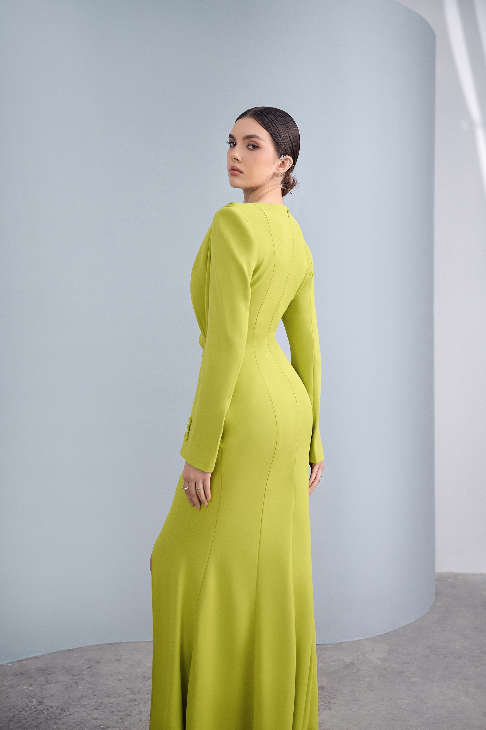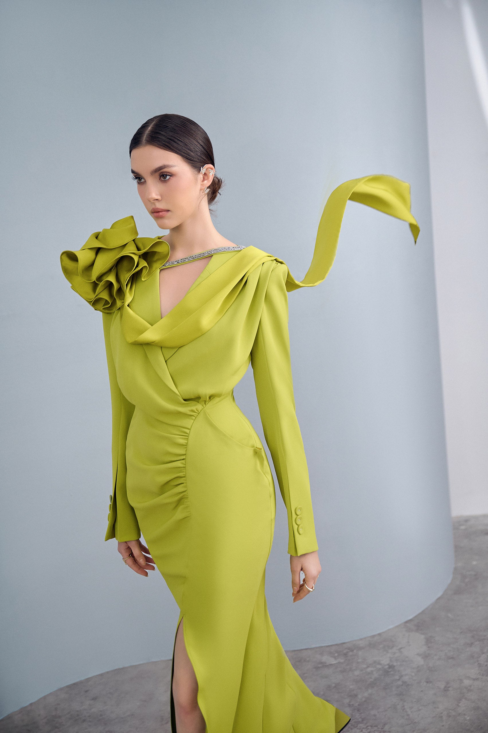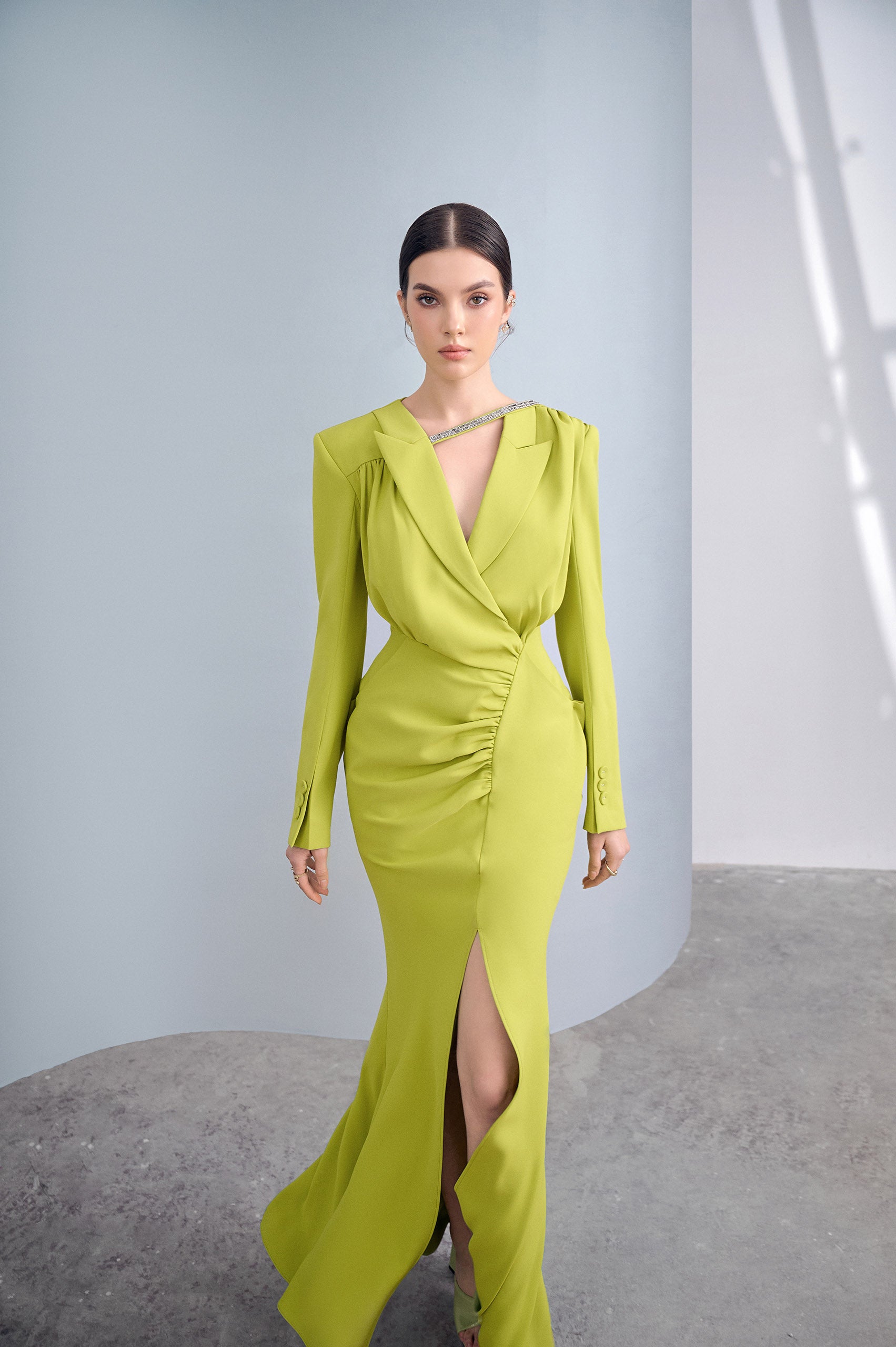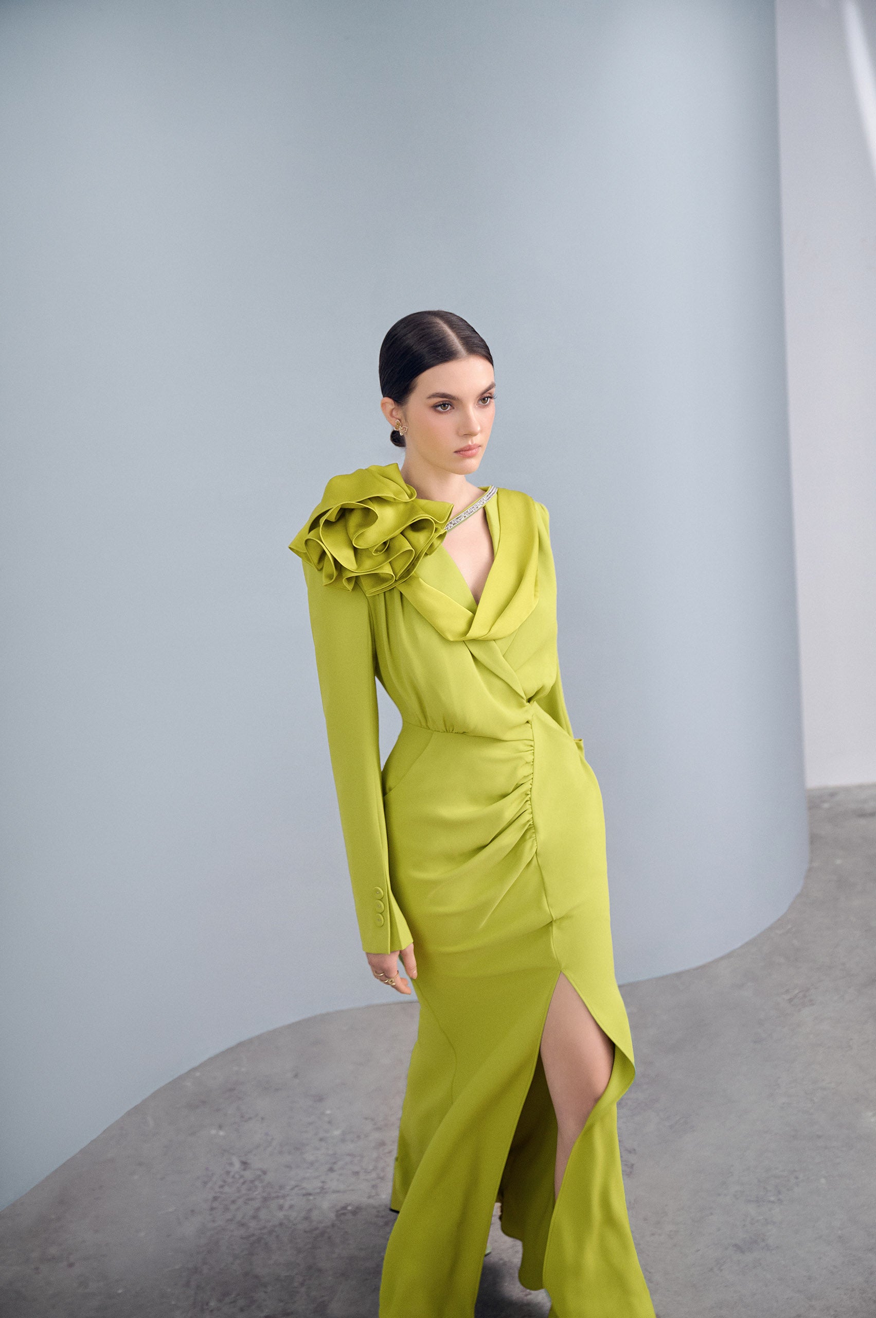 Coming to "The Color of Melody" this time, L'ALLÉE takes you to different levels of emotions, to unique color palettes and pure sounds of life. Impressing with Lilting Fish Tail Slit Dress, L'ALLÉE chose lime color (lemon yellow) combined with a fishtail shape with a seductive deep slit knee part, making the whole look as fresh as a piece of music full of positivity. Dress with drawstring waist part to create attractive curves for the body, combined with a necklace with rhinestones will become a new highlight in this new collection of L'ALLÉE.