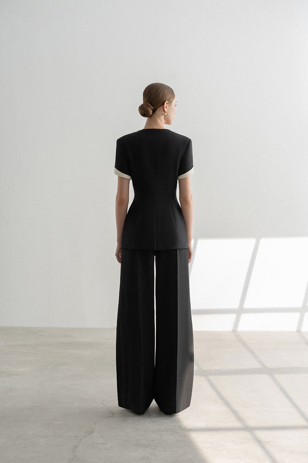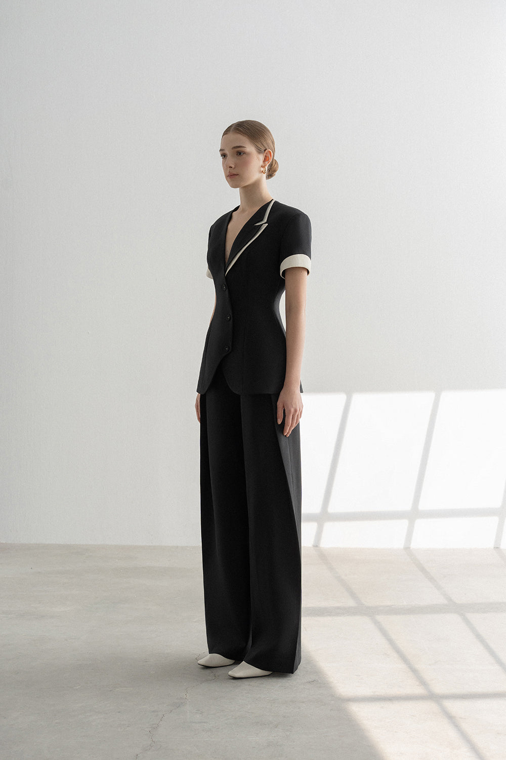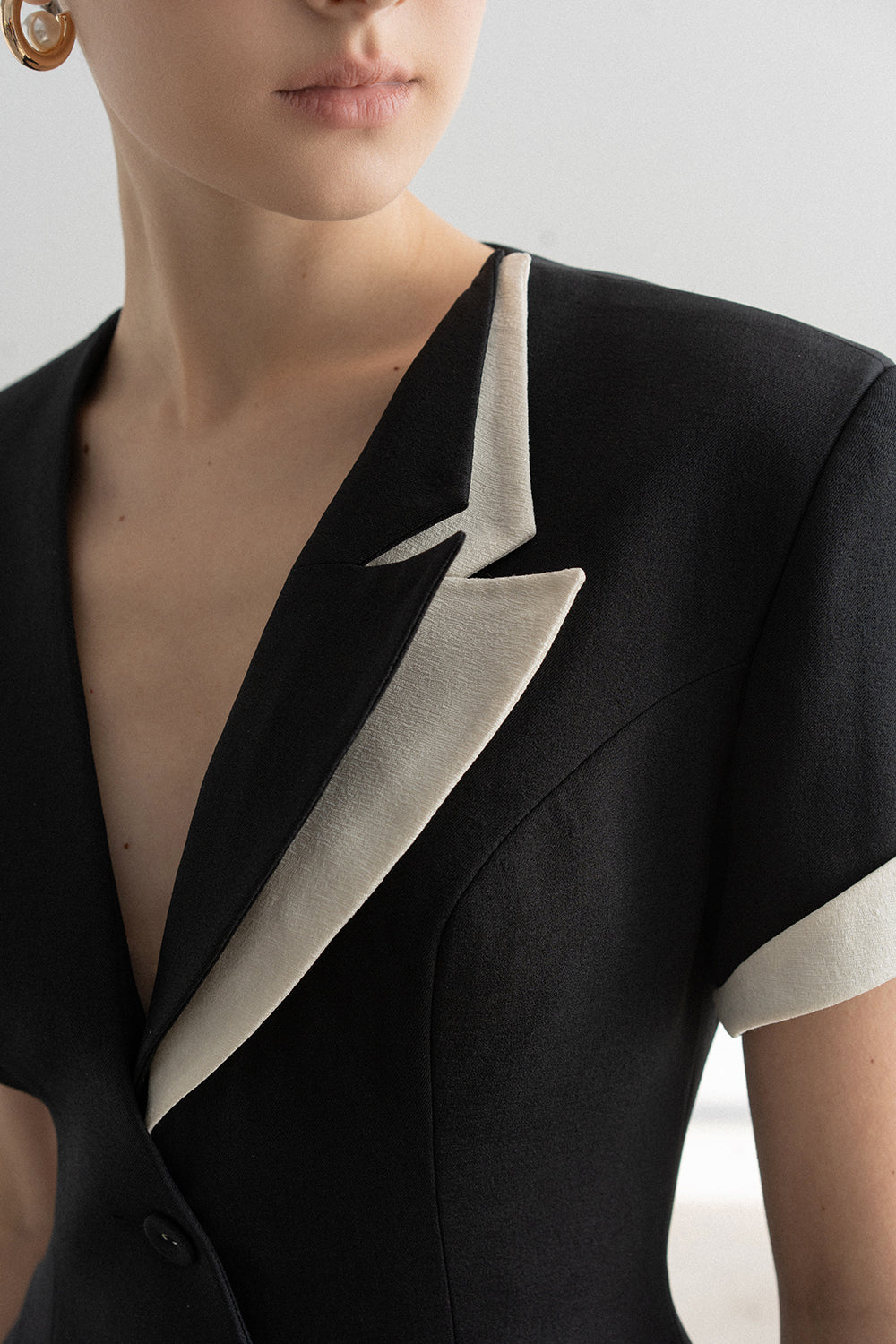Linda Blazer embrace signature form-fitting silhoutte of L'ALLÉE. Cinched waist with curved flaps compliment the figure while diagonal short sleeves and asymmetric double lapels highlight the blazer's uniqueness.