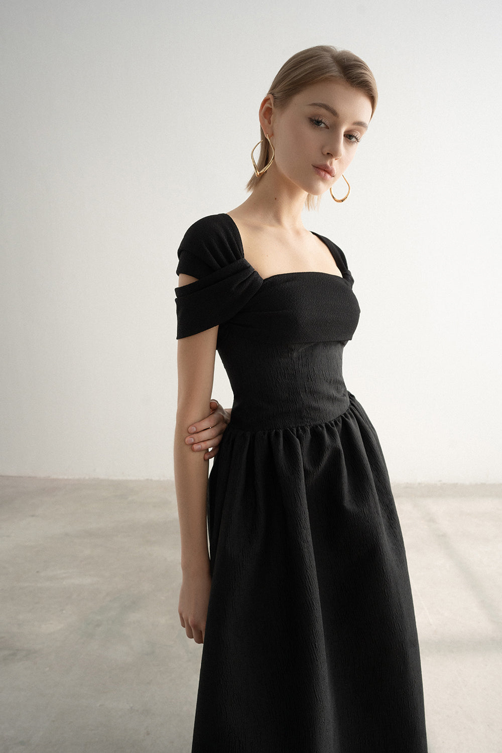 Elegant and modern Luluna Midi Dress enrich itself with A-line shape that also brings comfortability. Squared neckline with twisted shoulder details cleverly showing off the figure while adding a fresh, unique touch to the design.