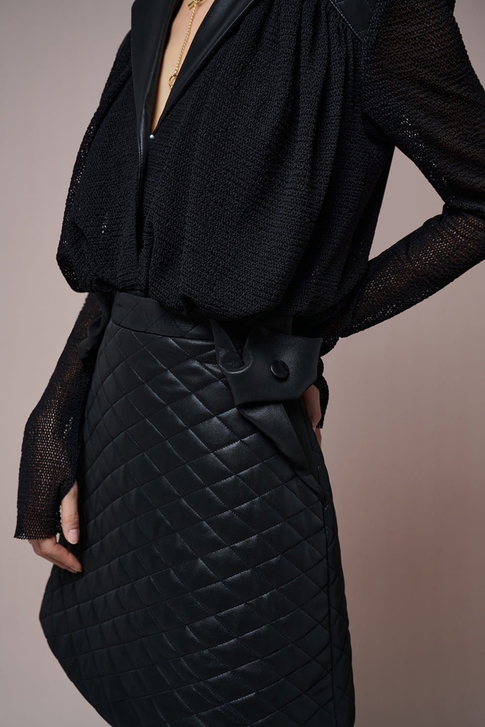 With sleek structure, Luna Dress is the latest design from L'ALLÉE to empower that modern women. Loose waist with rhombus quilted emphasize the strong shoulder, while miniskirt design help showcase the feminine figure. Wool warp knitted blend perfectly with simili leather for a sensual, luxury vibe for winter.