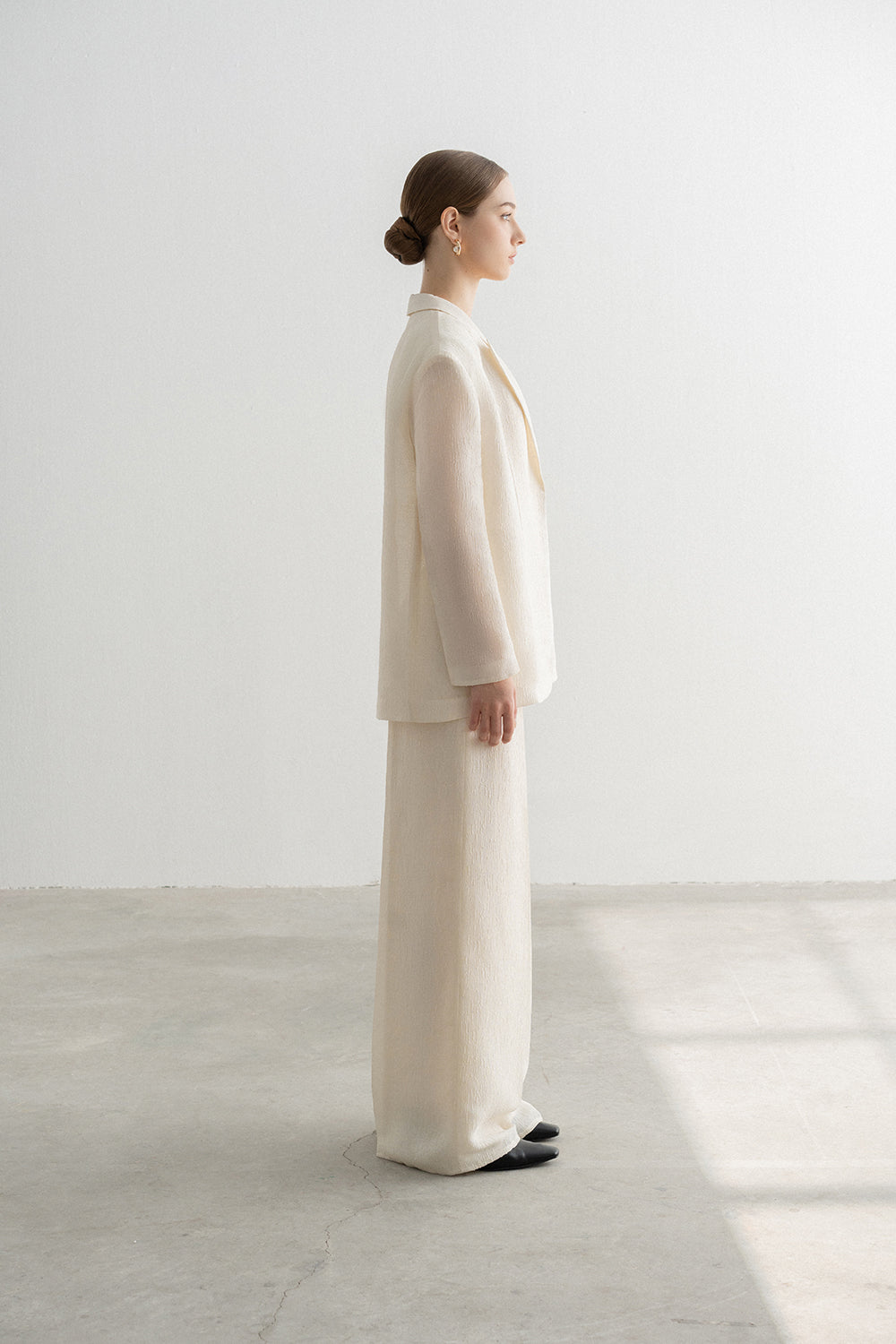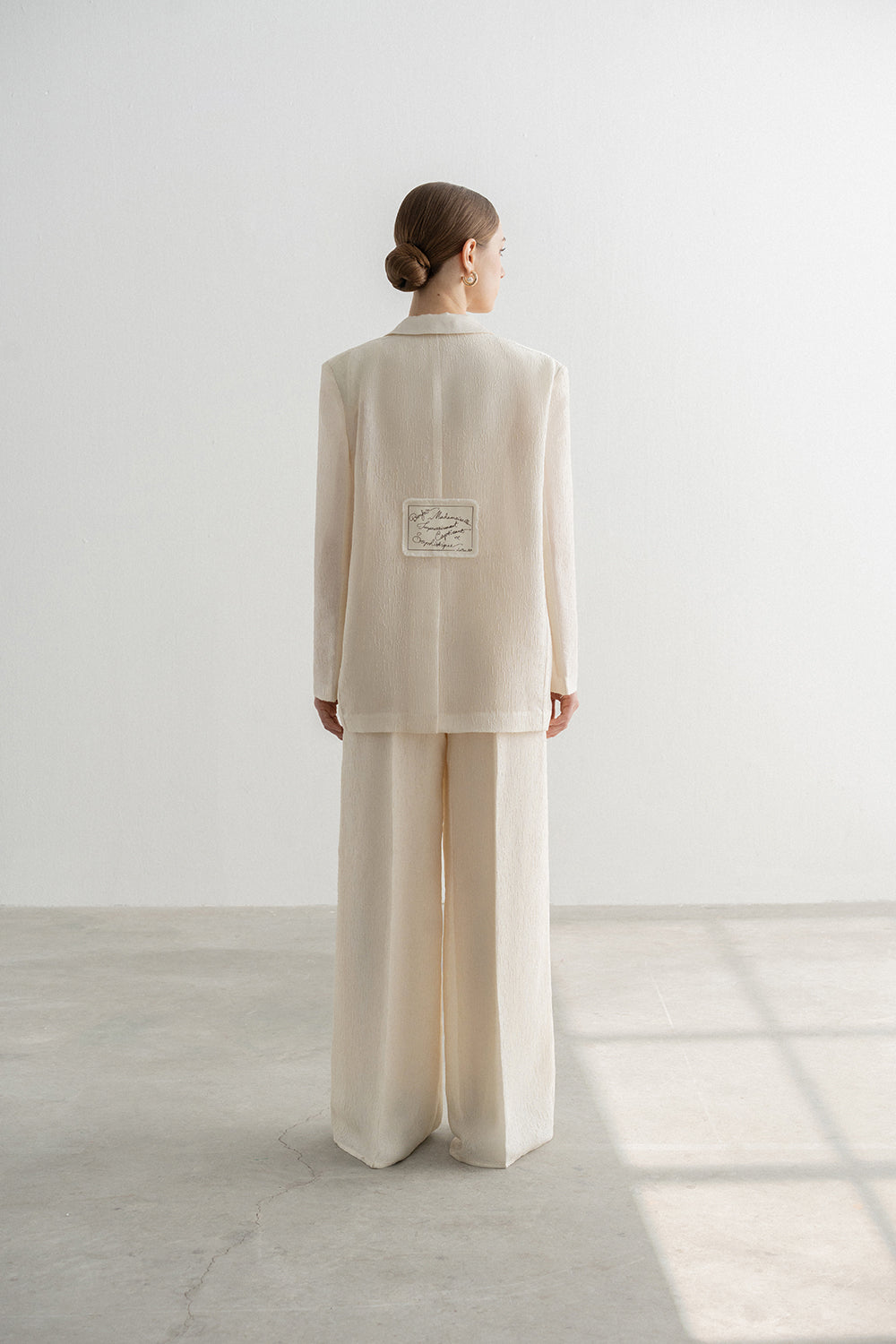 Naava Blazer is the epitome of intricate design details help boosting the confident. A squared shoulder with large lapels empower the silhouette while Crinkled Metallic Jacquard Organza with shimmering texture highlight elegant beauty. A special tag with L'ALLÉE messages in the back is the special touch to complete the outfit.