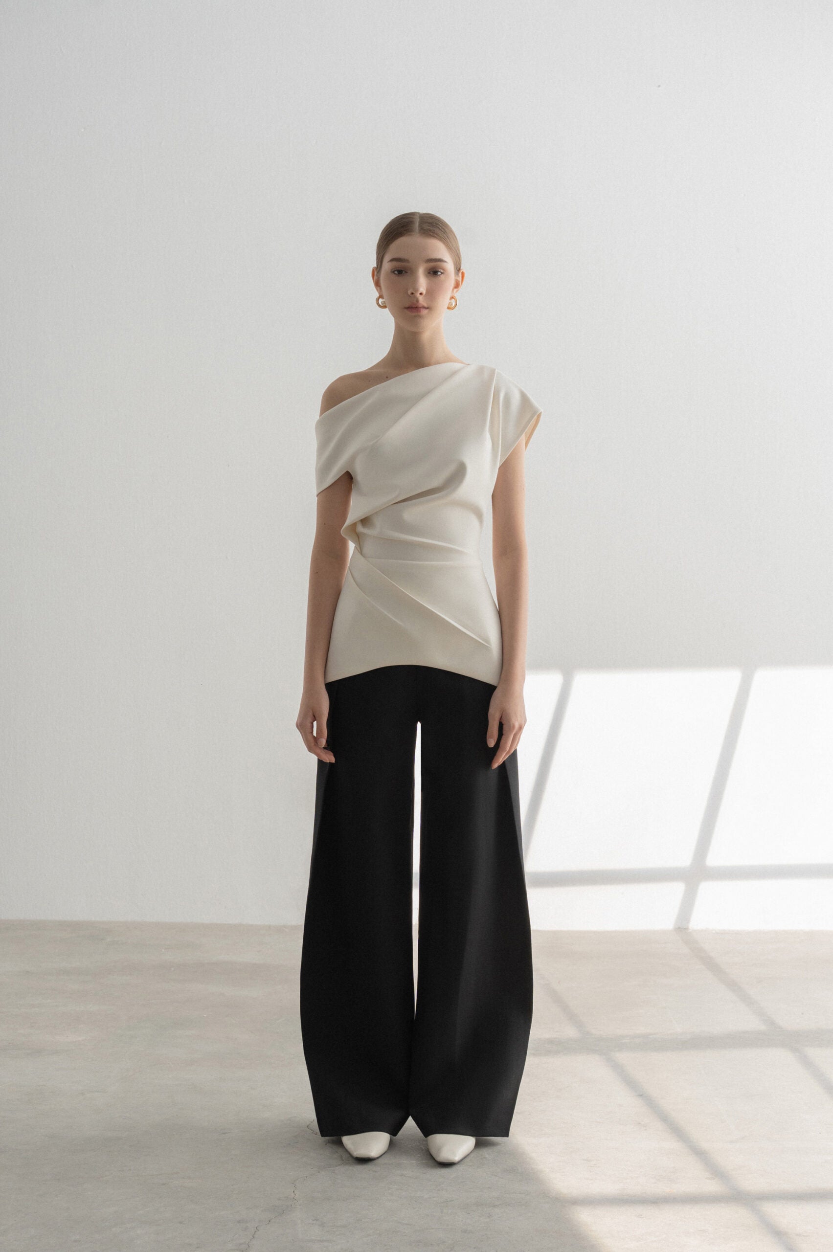 Elegant and sophisticated beauty is greatly showcased with Nelly Shirt. A peplum shape with asymmetric off the shoulder highlight just the right amount of skin while cleverly show off the figure. An easy, flexible piece that can be worn with straight pants or A-line skirt for a modern, luxury complete look. A touch of gold jewelry emphasizes that regal feel.