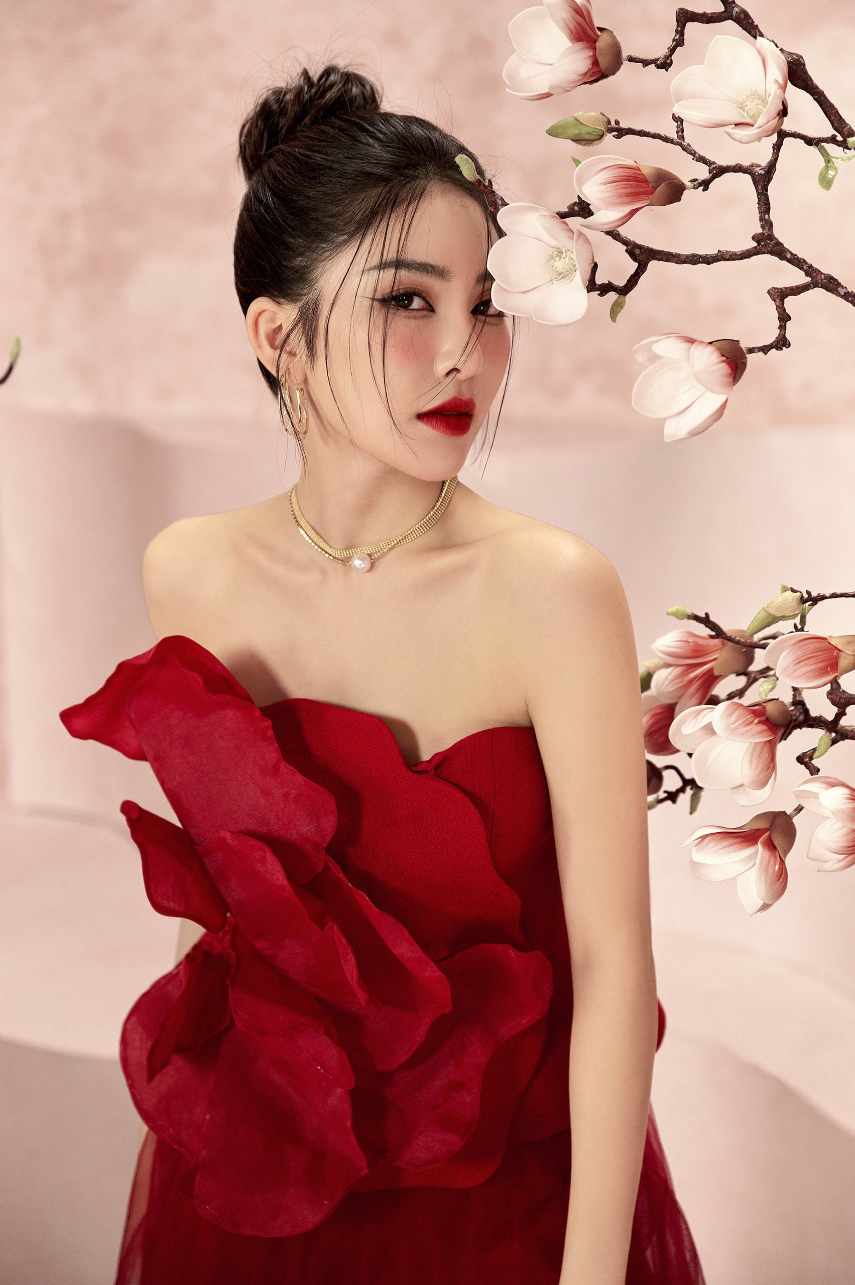 People associate complete luck with the color red when it first appears at the start of a new year by conjuring up images of lucky coins, couplets, etc. L'ALLÉE uses the noble pomegranate flower image—a seasonal emblem of success and wealth—along with the fortunate red hue to convey luck and prosperity in this A POEM TITLED SPRING collection. Pomegranate Floral 3D Strapless Shirt uses the well-known technique of tightening the waist to enlarge the hips. The craftsmen's brilliant and skillful sequin attaching techniques gradually reveal the shy and budding petals, creating a work of art attractive artwork.