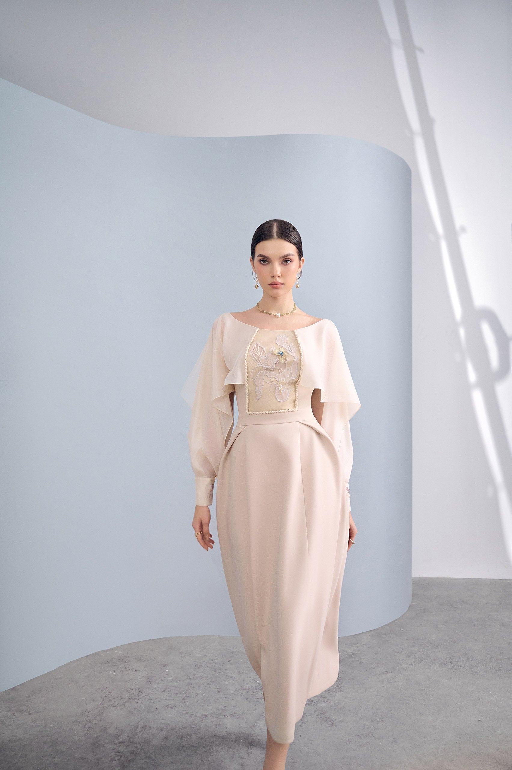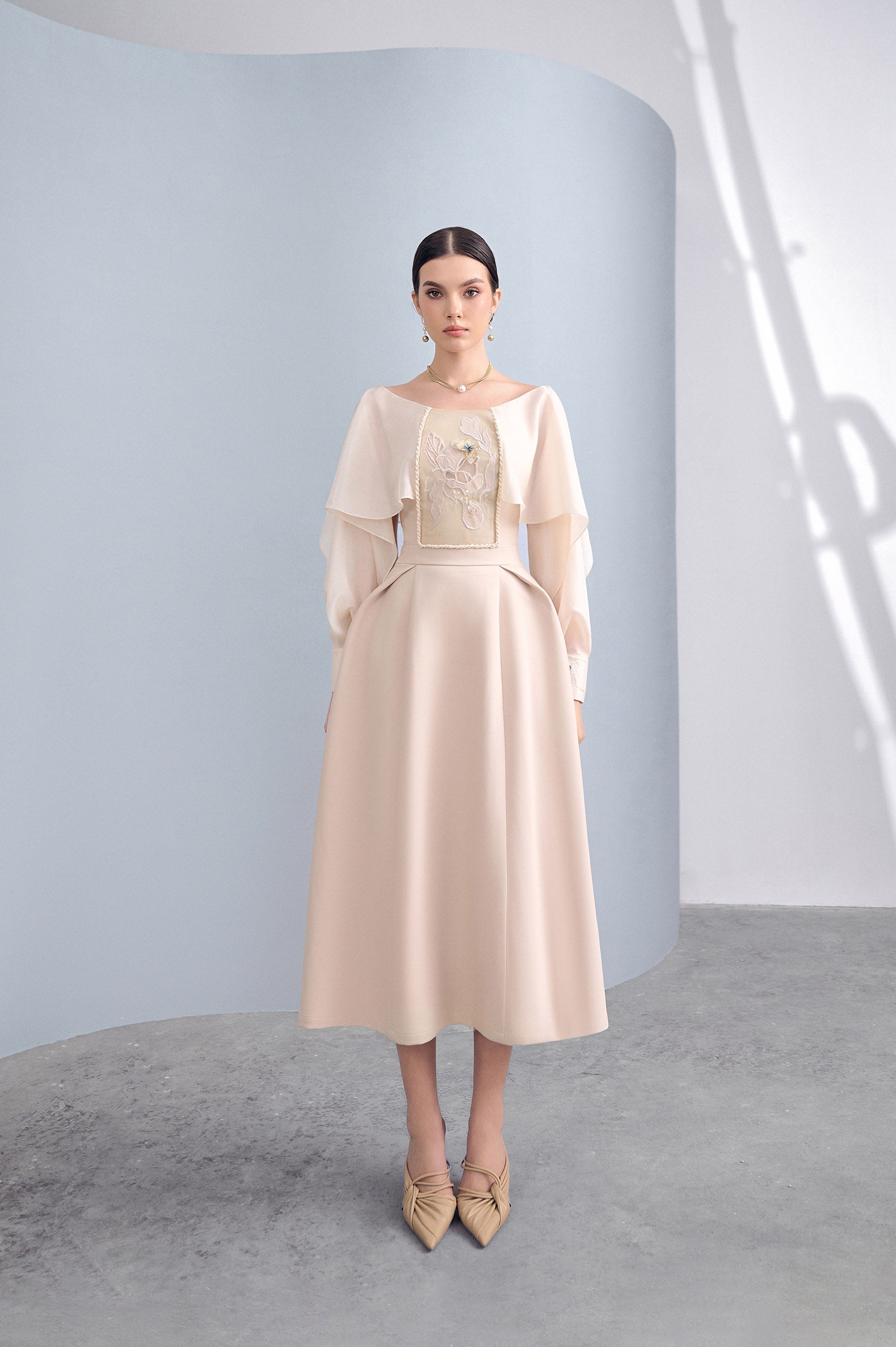 Not as pristine as white, not as glamorous and individual as black, beige is known for its special elegance. Pretty Embroidered 3D Dress has a batwing A-line dress design that combined with soft Twill fabric that bringing cool and comfortable experiences in special dates. Creating a breakthrough by the art of embroidery, sophisticated 3D flower arrangement, this design becomes a delicate highlight in the "The Color of Melody" collection, attracting and impressing to those opposite by Courtesy and elegance.