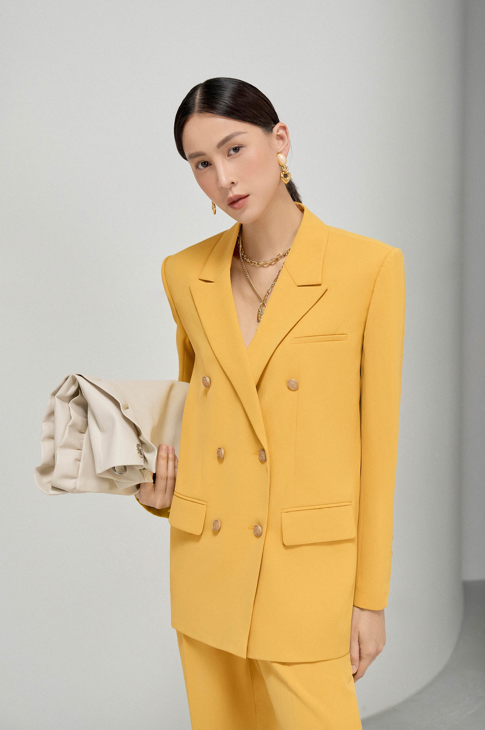 A bright and dynamic ray of sunshine on a summer day is sent by L'ALLÉE through the Ray Double Breasted Blazer, easy to apply but without losing each person's individuality. The technique of building a layer, wrapping the seam border helps the shirt form standard and thin, suitable for summer weather. The shoulders are slightly square and have a wider shoulder, the basic shirt shape creates a standing, flying form and modern look. Ray Double Breasted Blazer will be an indispensable item of ladies in summer days.