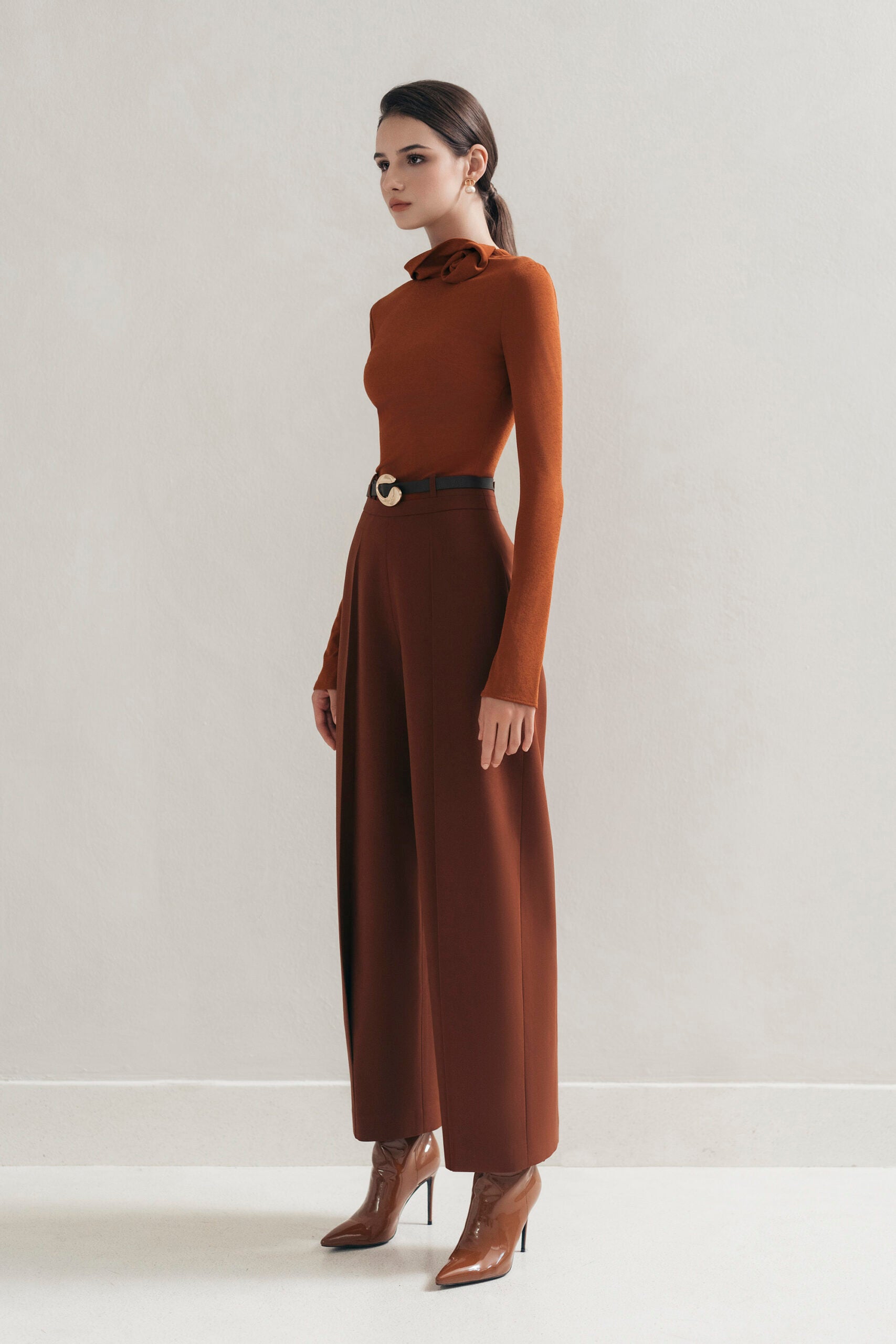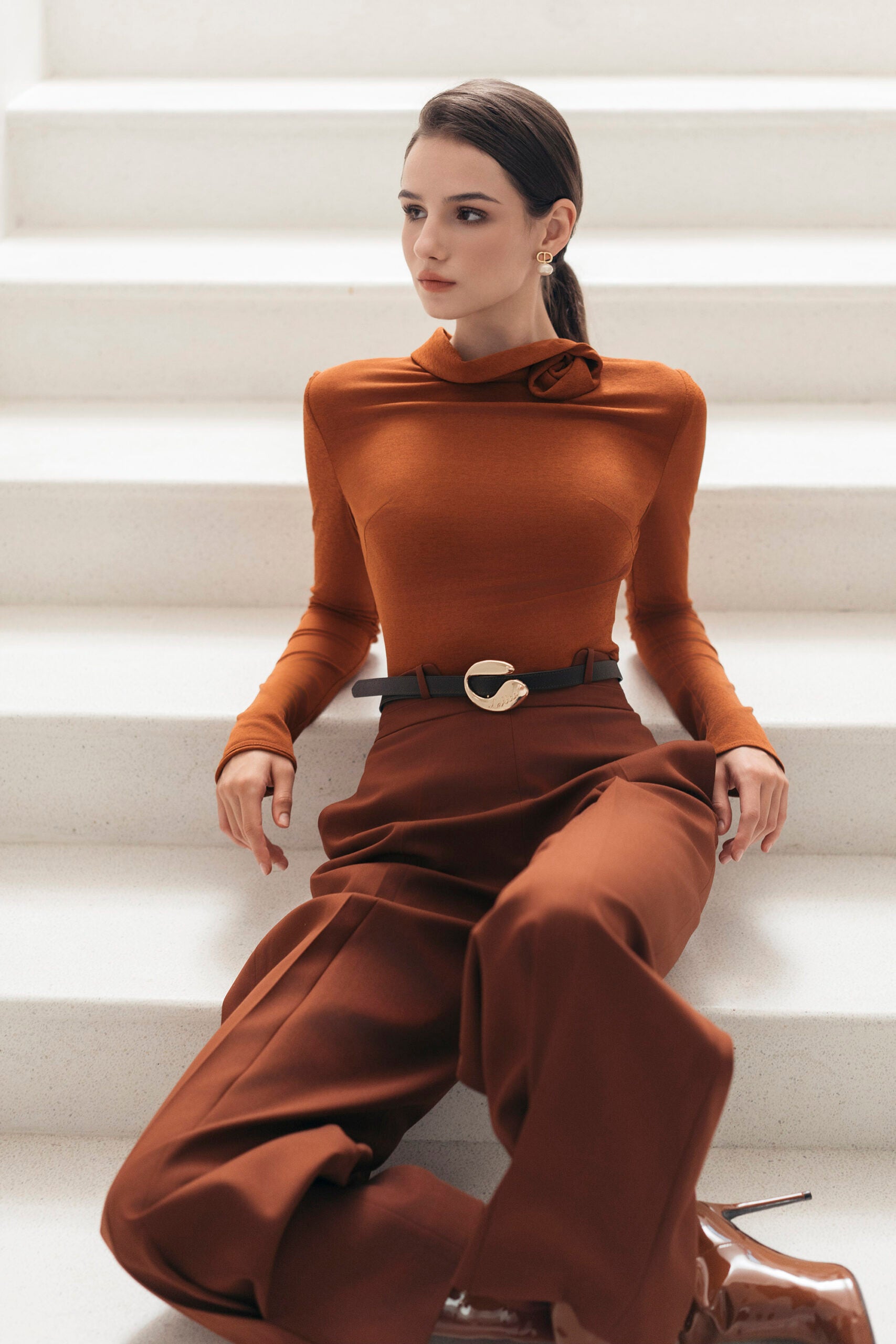 This fitted t-shirt showcases a refined 3D floral collar, adding a unique and striking element to a classic silhouette. The soft, stretchy fabric hugs the body while providing comfort. This 3D floral design not only enhances femininity but also adds a youthful flair to the outfit, making it an ideal choice for casual outings or social gatherings. Pair it with wide-leg pants or skirts, along with accessories, to create an elegant and feminine ensemble.