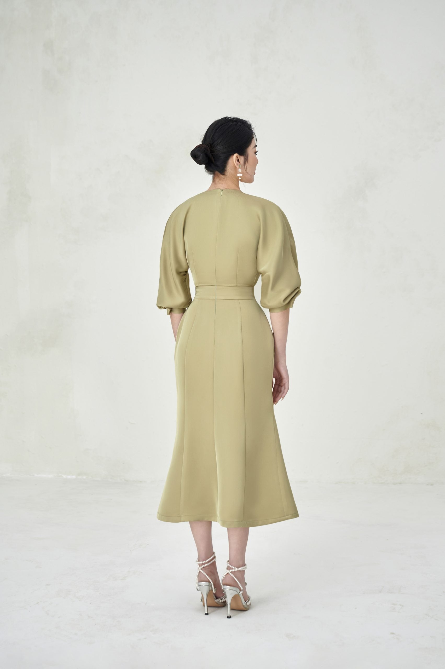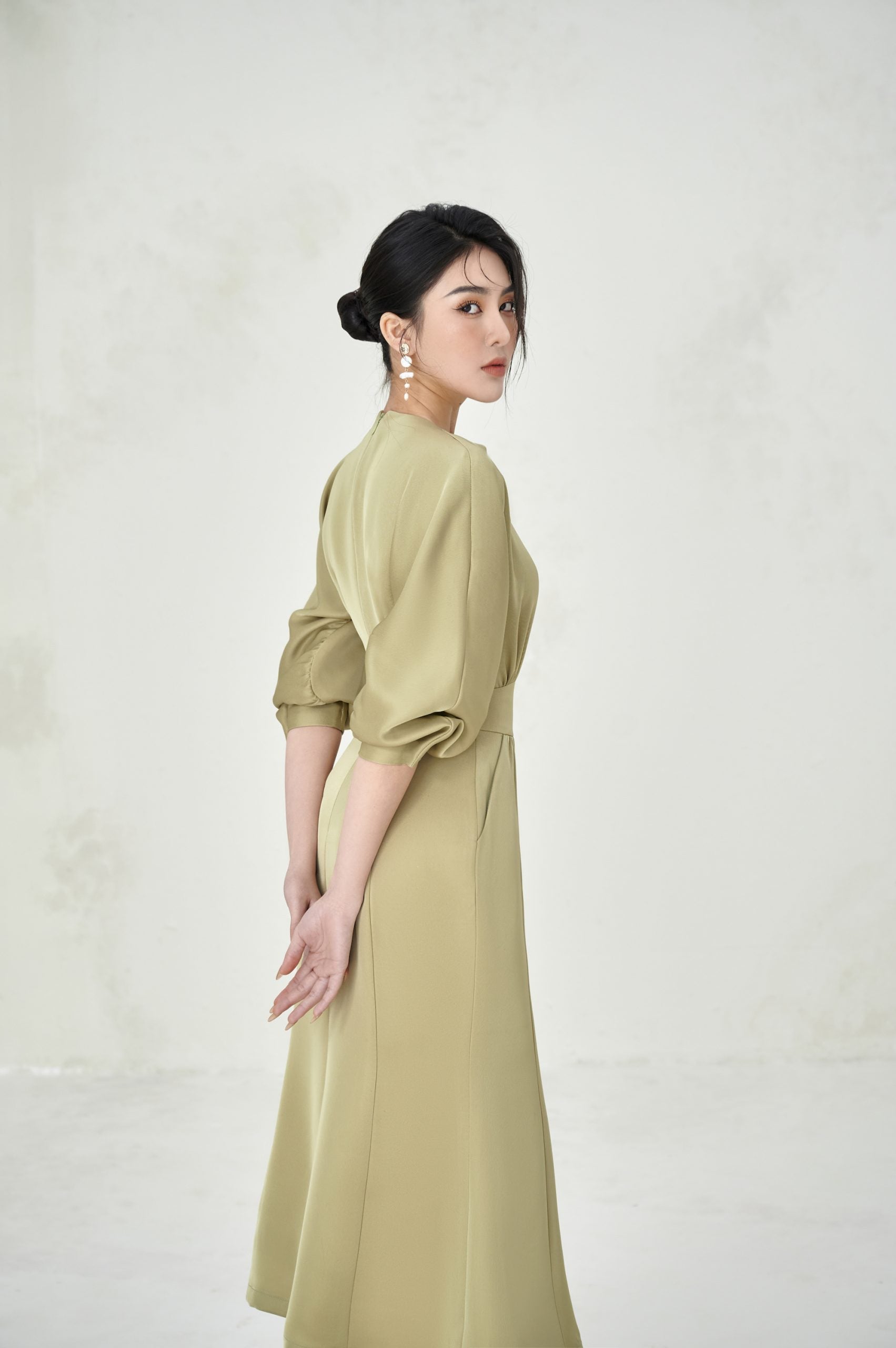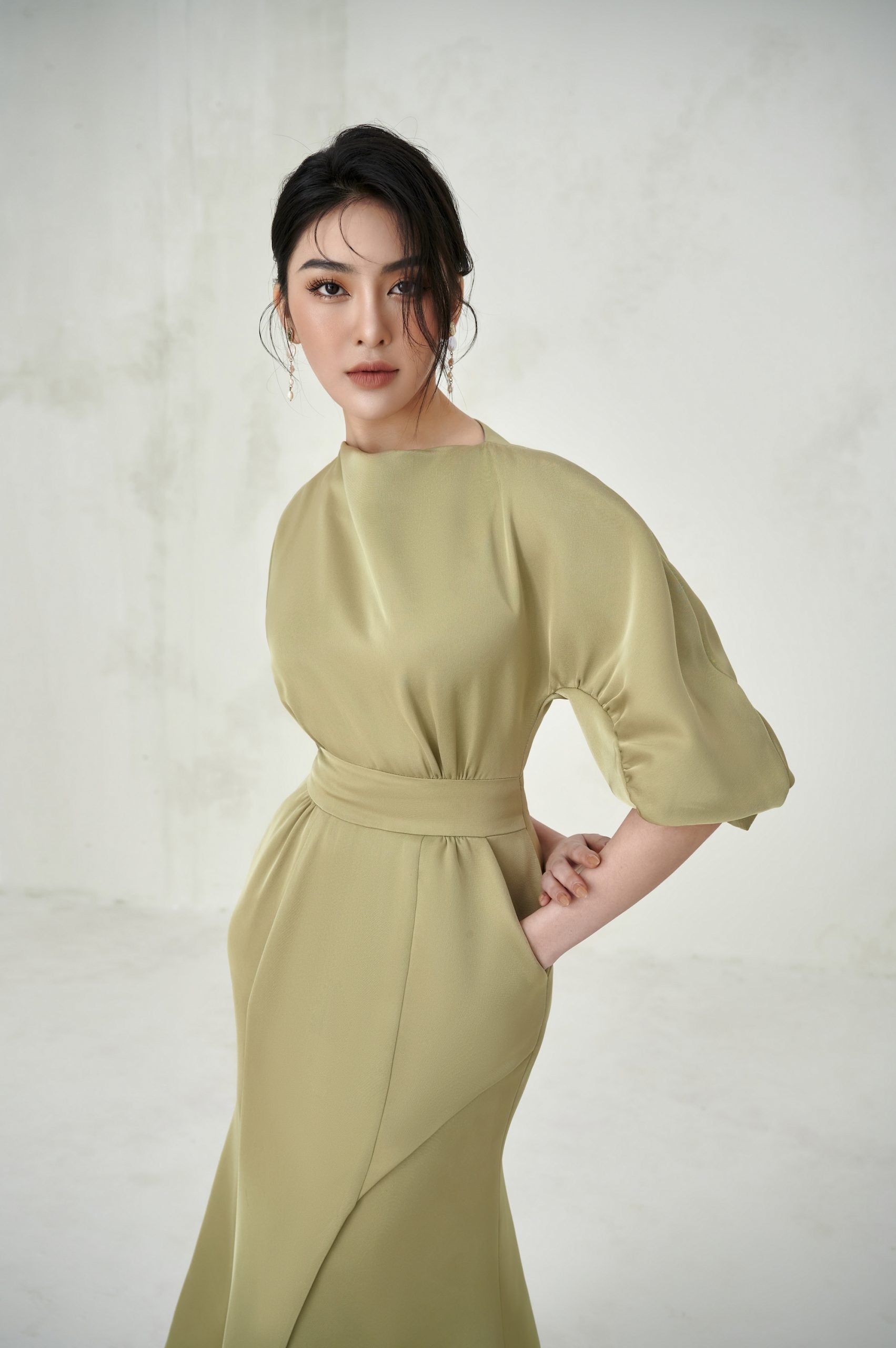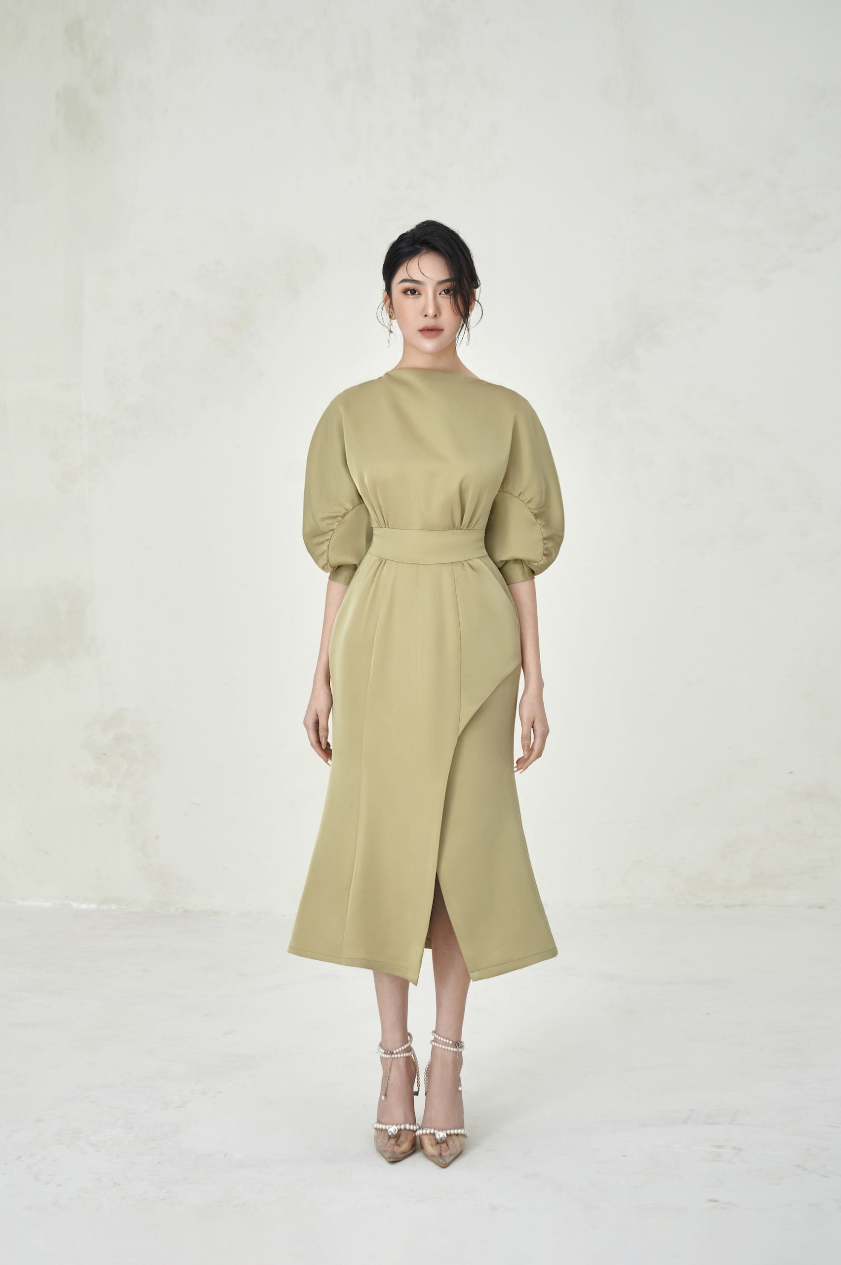 Scarlett Dress is like a soaring note expressing her personality and luxurious beauty in parties. The design of the dress has a natural flowing neckline, and the curved sleeves are pleated to give her a sweet but impressive appearance. A special highlight lies in the technique of increasing the hips, pressing the waist to help shape the wearer's shape, bringing a balance to the body.