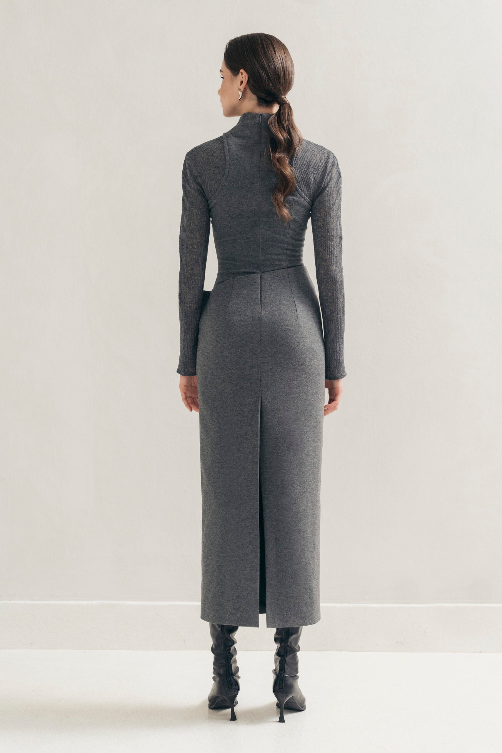 This fitted pencil dress is designed with a high neckline and knitted sleeves, combining modernity and elegance. Inspired by a tank top structure, it features sporty lines that provide comfort and style. The asymmetrical waist and metallic ring detail at the hip add a unique and striking touch, making it versatile for various styling options.