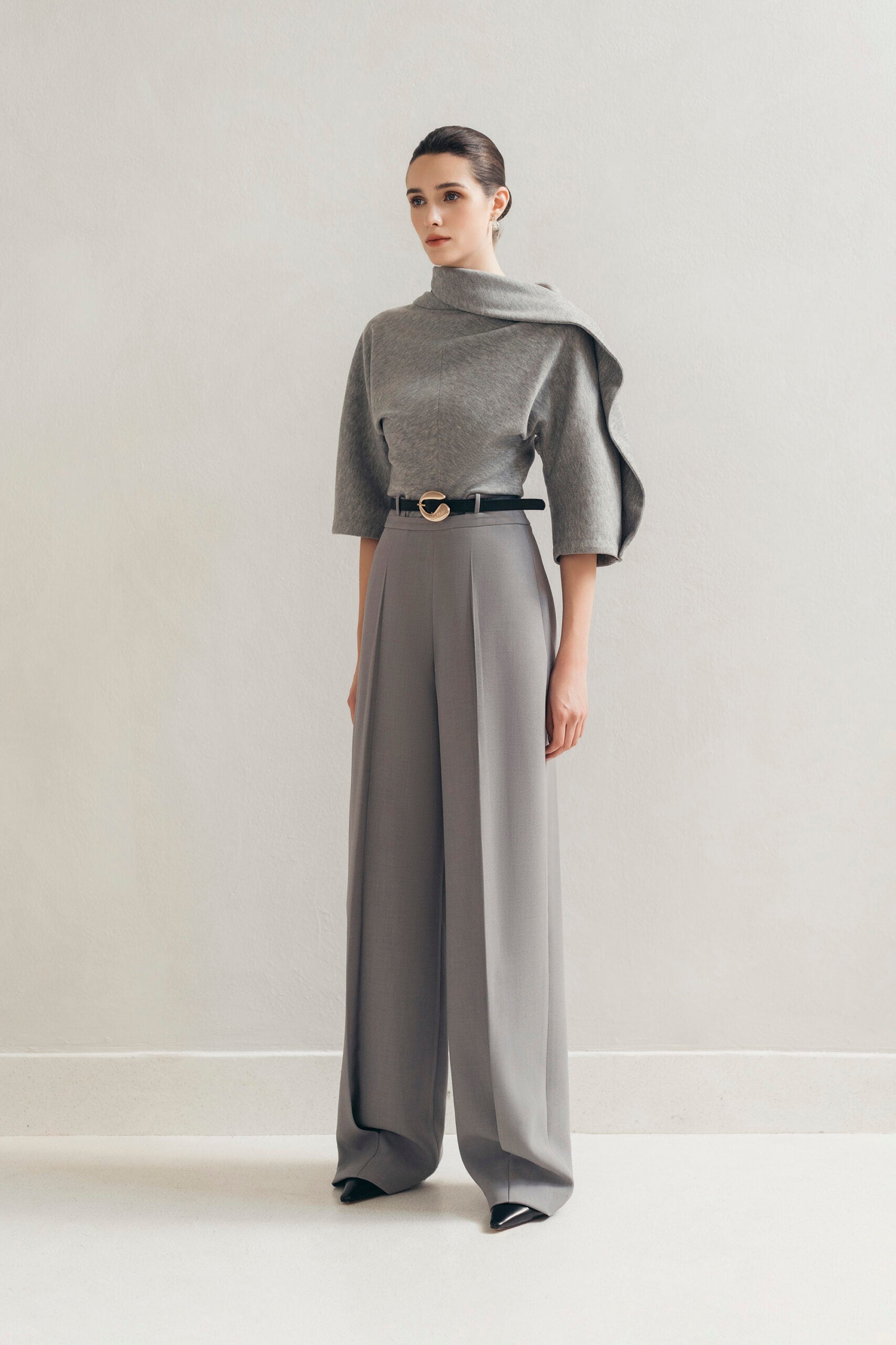 These cocoon-style trousers feature pleated cuffs for added detail, and a signature leather belt that defines the waist. The soft wool felt material ensures warmth while maintaining a structured, flattering fit, making them perfect for both casual and professional wear.