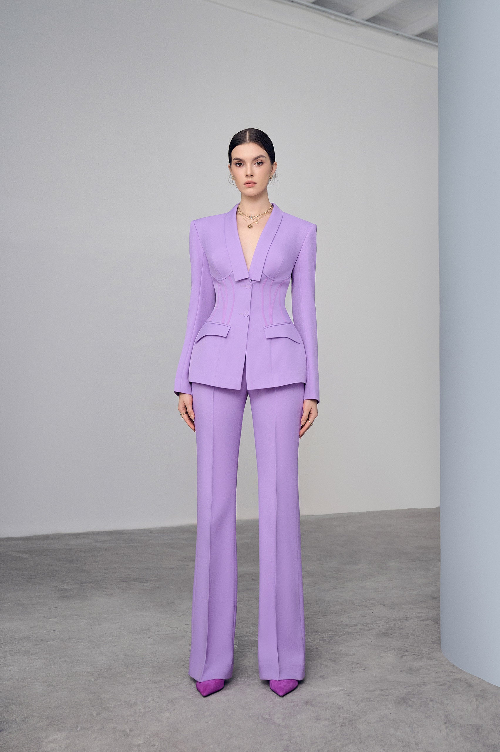 Catching all eyes with romantic colors, L'ALLÉE gave you the lilac purple color of lilac - a shy look but fresh, youthful, and always keep looking forward. The duo Solo Corset Blazer and Solo Flare Pants contains distinctive marks and meticulousness of tailoring technique on the Stretch Crepe material. Blazer has the upper body that uses a structured waist corset, strapless and widening the hips, all help the wearer looks having a slim waist and full bust. The mix not only honors the physical beauty of a woman but also explores your deep and romantic thoughts in all setting.