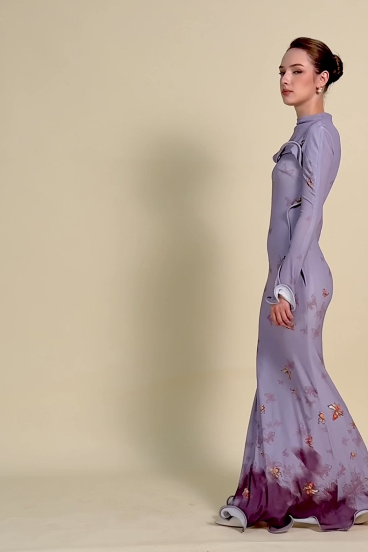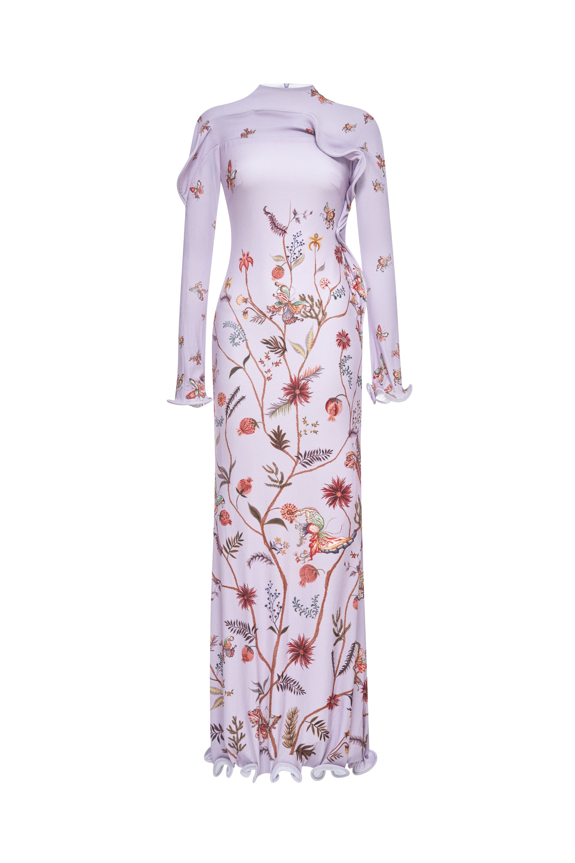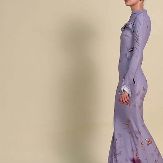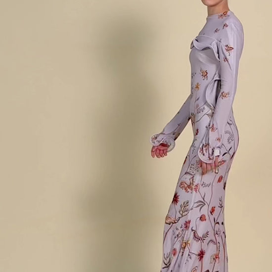 A form-fitting high-neck mermaid dress with wavy ruffle from the shoulder across the chest down to the waist; The cuffs and hem also feature soft, flowing ruffles; wildflower, leaf fruit prints.