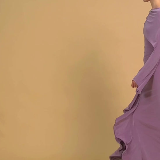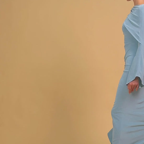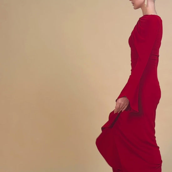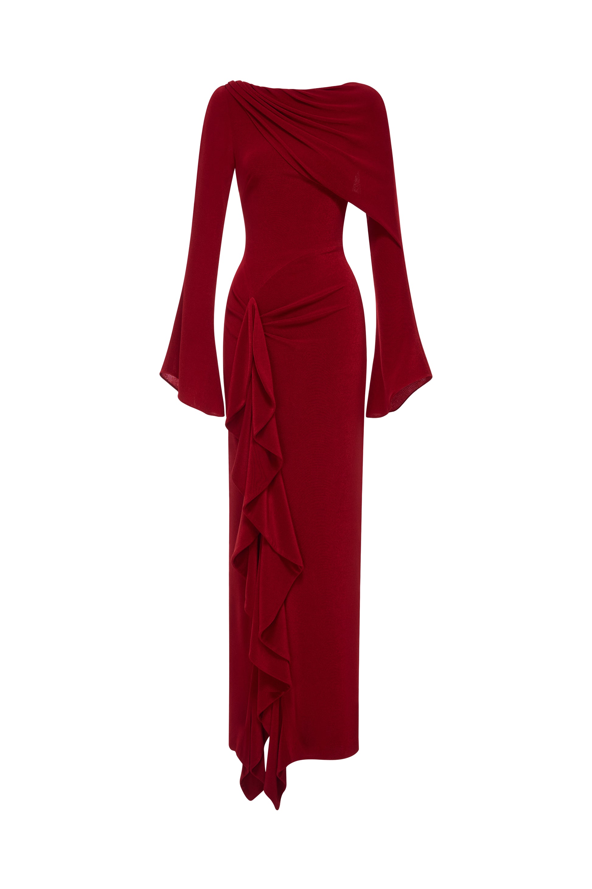 Pencil dress with asymmetric neckline and lightly flared long sleeves, draping neckline, ruched hip detail and cascading ruffle flowing into a front slit.