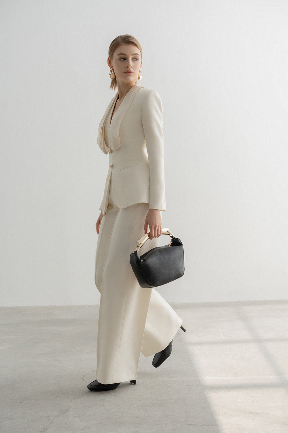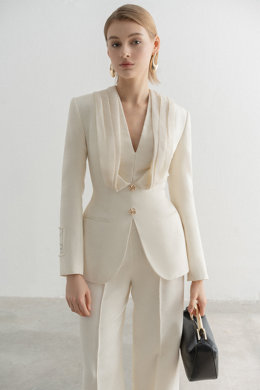 In the elegant shade of peach cream, Tove Blazer brings you a classy, sophisticated beauty. Signature structure with fitted waist and sculpted hips line delicately compliment the figure.