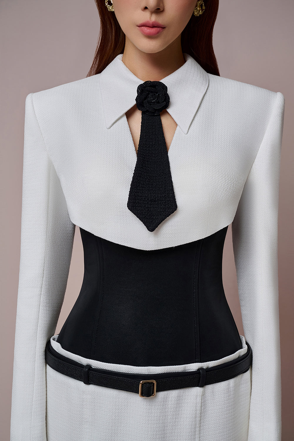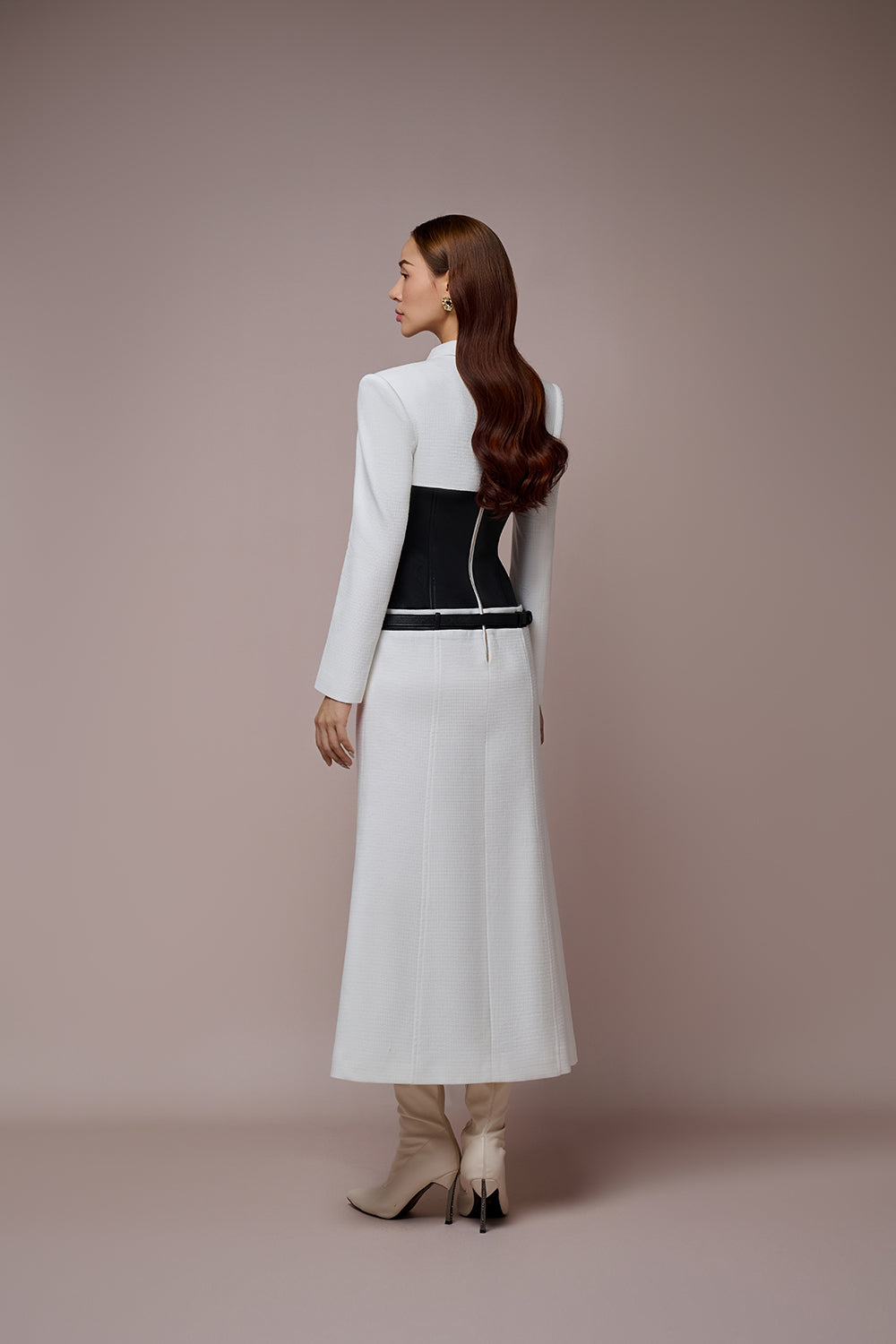 Tulia Dress stands out with its unique, fresh design: A square shoulder faux croptop combine with low-rise skirtline and fitted waist captivate the hour-glass figure of the woman. Moreover, cut-out collar with tie detail creat a sleek, modern look. Tweed, simili leather enrich the winter look as well as complete a ready-to-wear look.