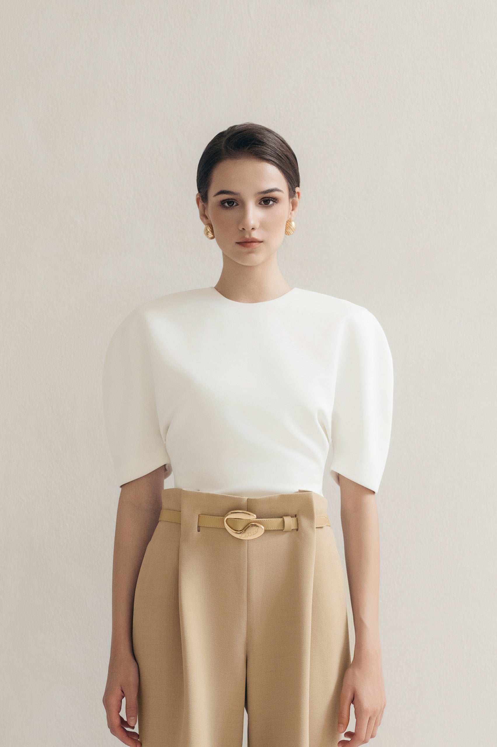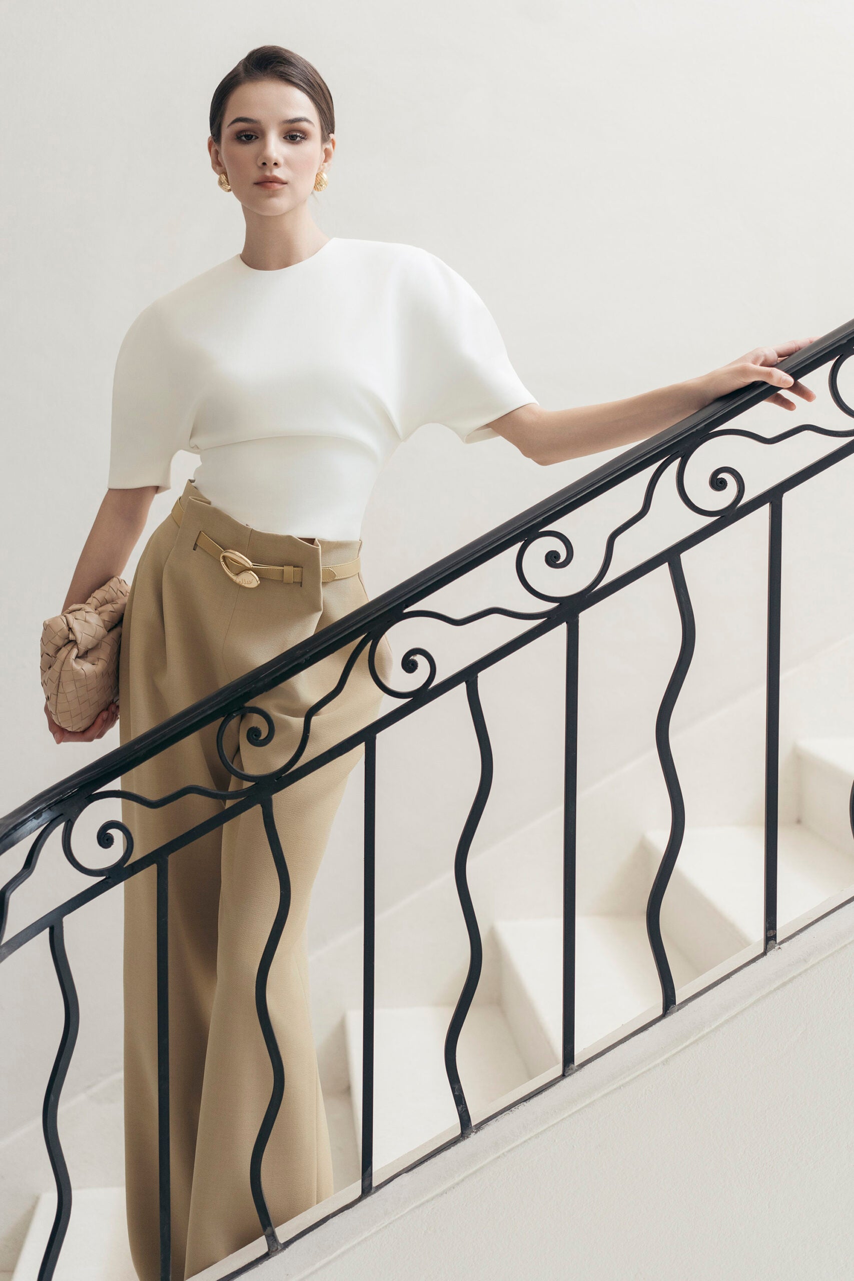 This fitted crop top hugs the waist with a round neckline and seamless sleeves, designed in a minimalist style with fewer cuts for an elegant appearance. The soft, stretchy fabric enhances the body's curves, making it suitable for various occasions. Pair it effortlessly with wide-leg pants or skirts, complemented by different items and accessories to create a vibrant and dynamic overall look.