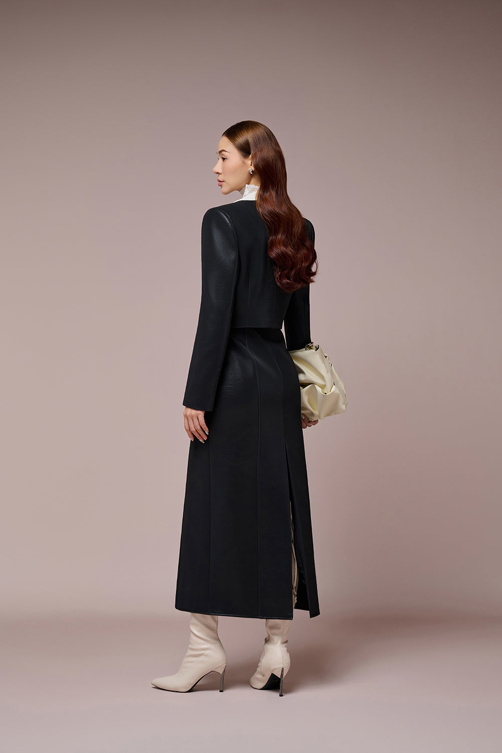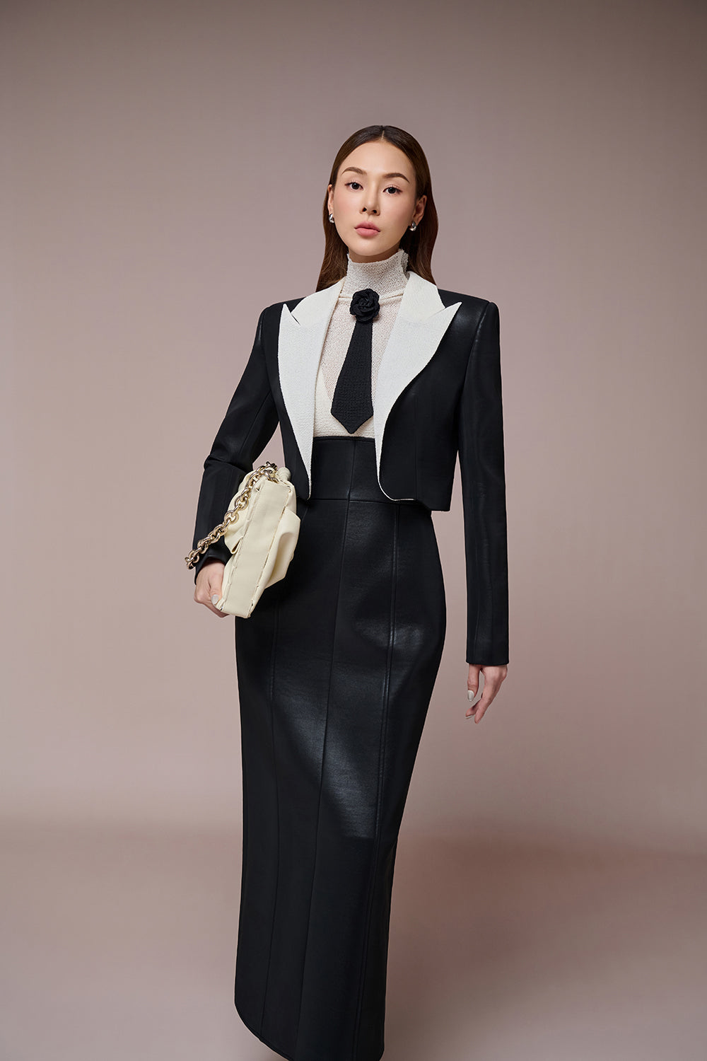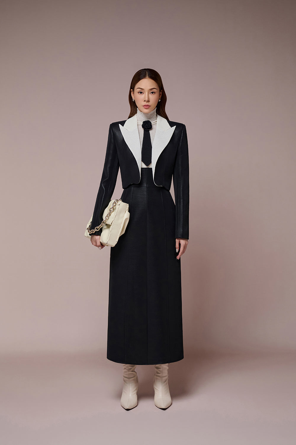 Confidently express yourself in the latest Yara Set from L'ALLÉE. A perfect combination of strong, sleek croptop blazer and fitted wool dress to ease down the look. Simple black and white set the tone for a richful, luxury vibe with the use of of wool, simili leather. Experience Yara Set today, chat with us now!