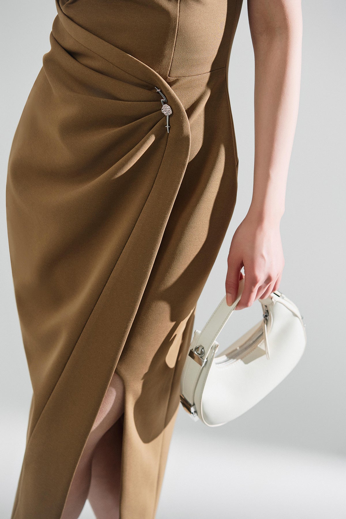When it come to elegant beauty, peanut brown Zelda Pencil Dress is a perfect choice for you. Drop shoulder with asymetrical overflap create a unique, fresh design that cleverly show...